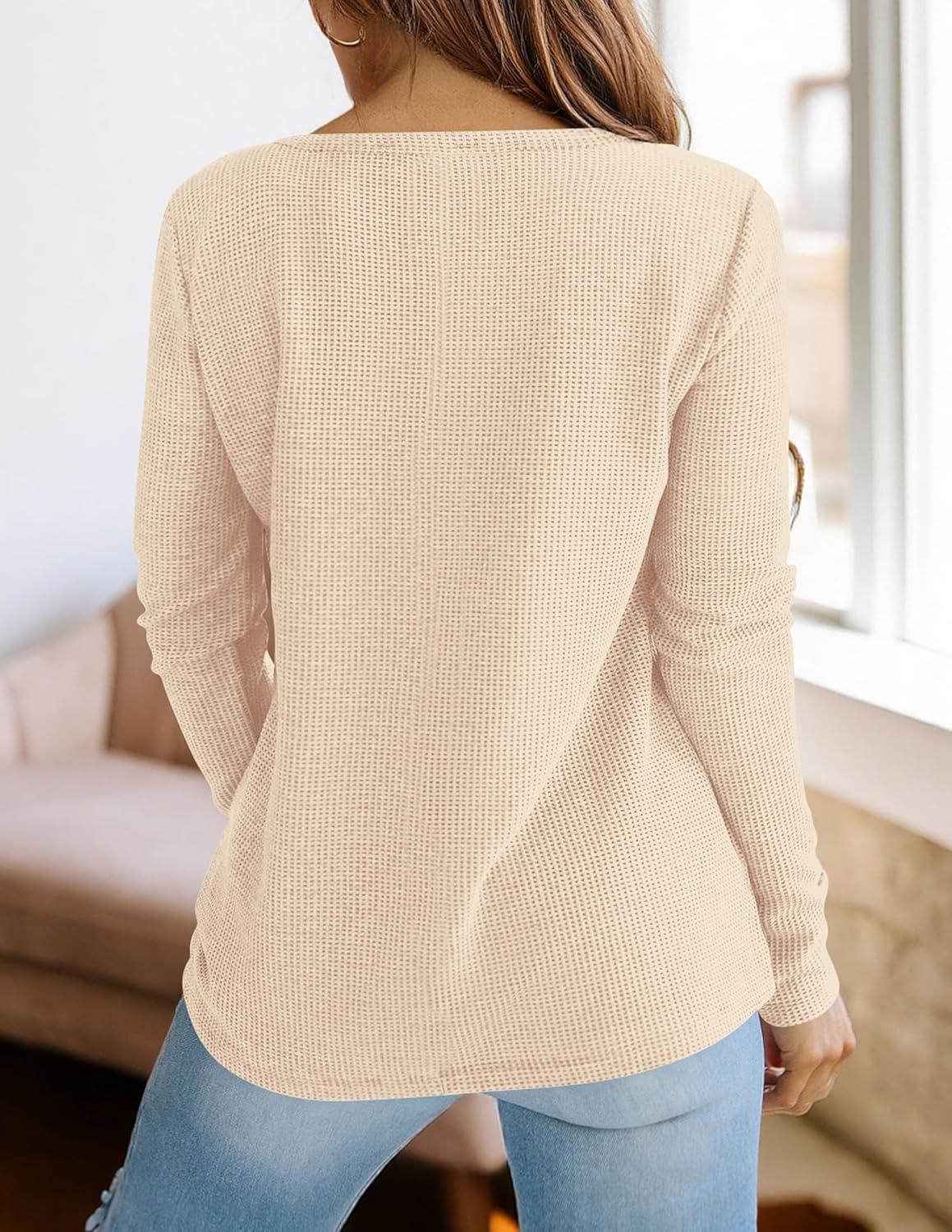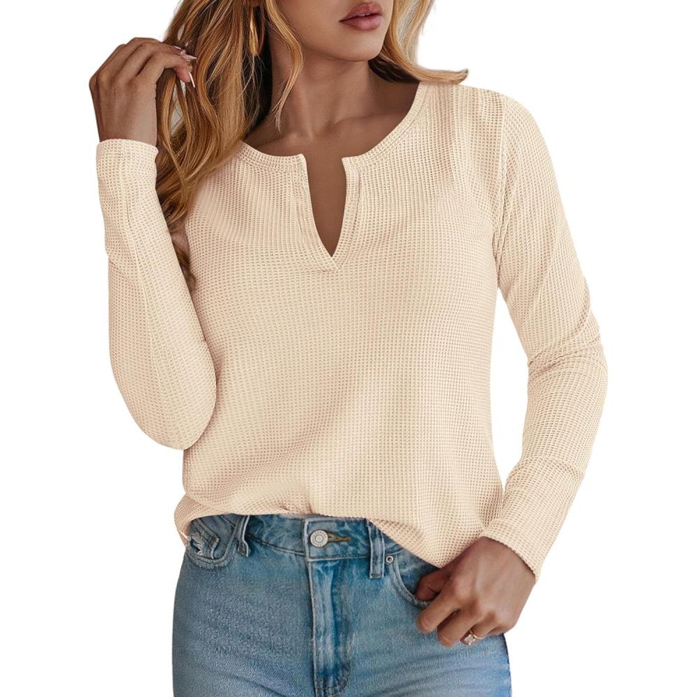 PRETTYGARDEN Long Sleeve Shirts for Women 2025 Fall V Neck Waffle Basic Tee Dressy Casual Winter Blouses Knit Tunic Tops(Beige)
