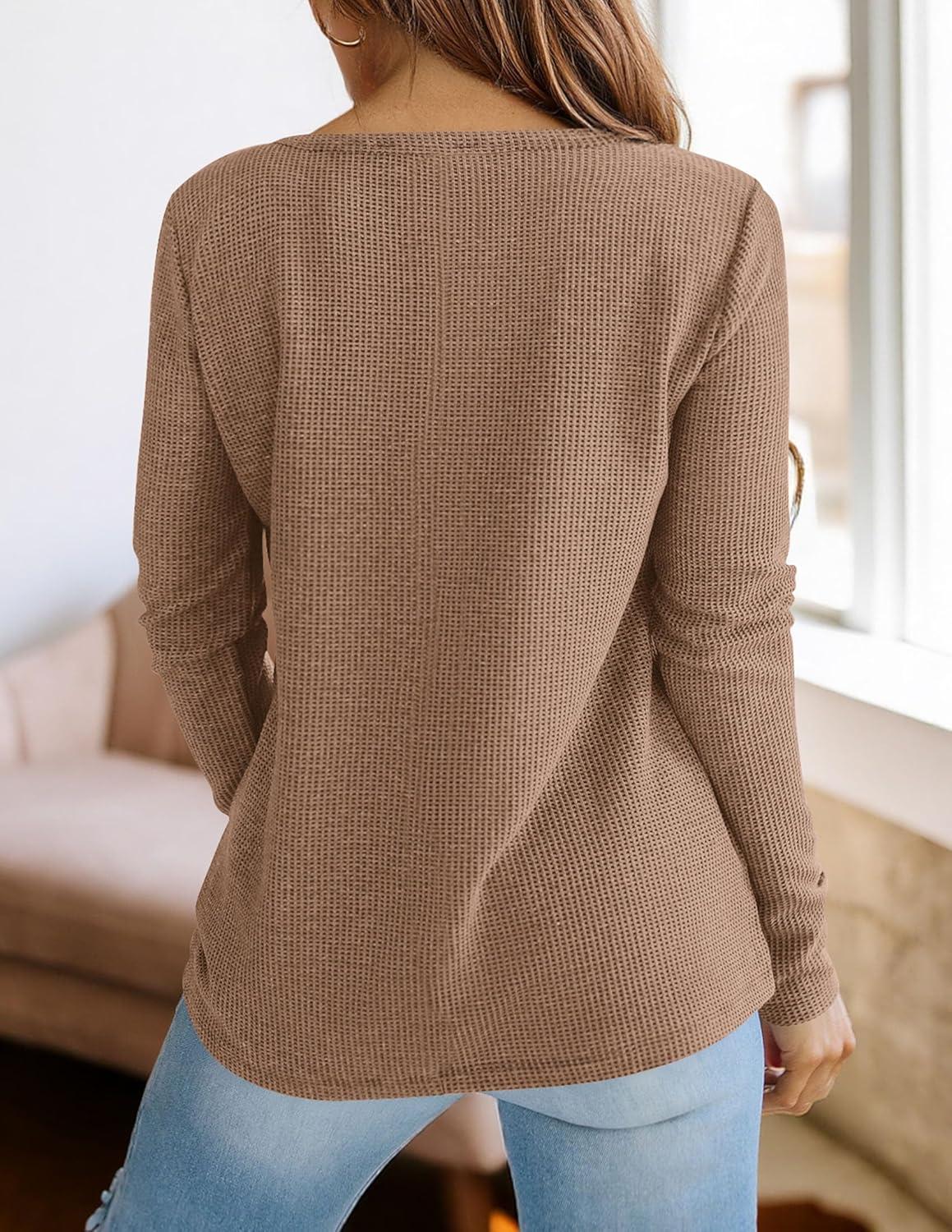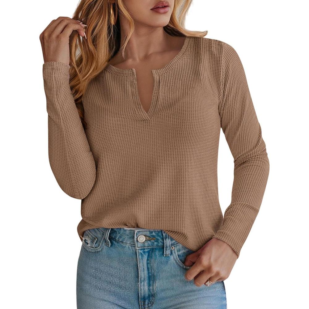 PRETTYGARDEN Long Sleeve Shirts for Women 2025 Fall V Neck Waffle Basic Tee Dressy Casual Winter Blouses Knit Tunic Tops(Khaki)