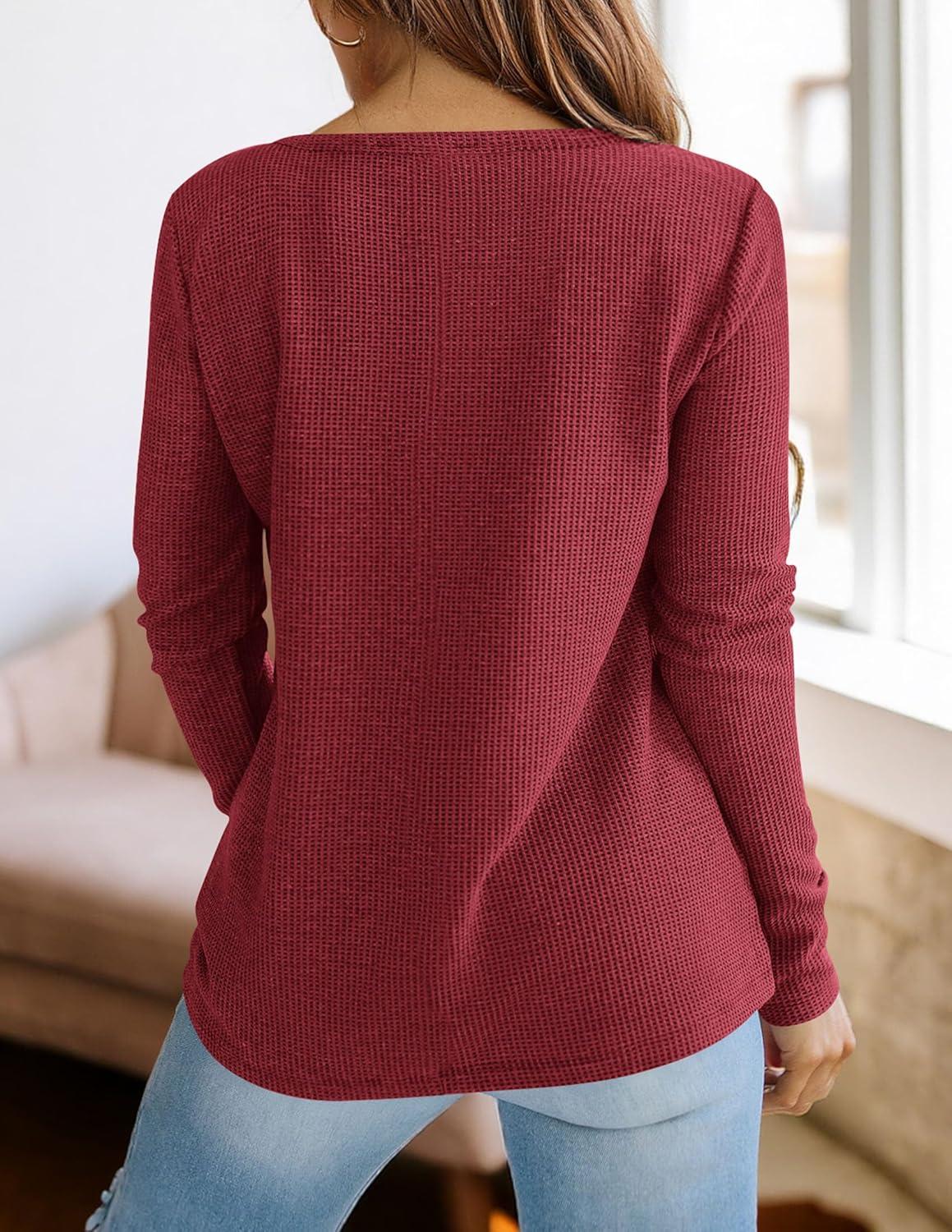 PRETTYGARDEN Long Sleeve Shirts for Women 2025 Fall V Neck Waffle Basic Tee Dressy Casual Winter Blouses Knit Tunic Tops(Wine Red)