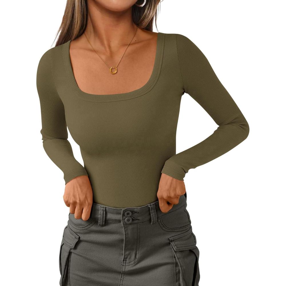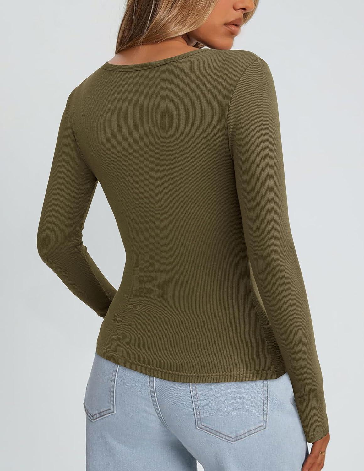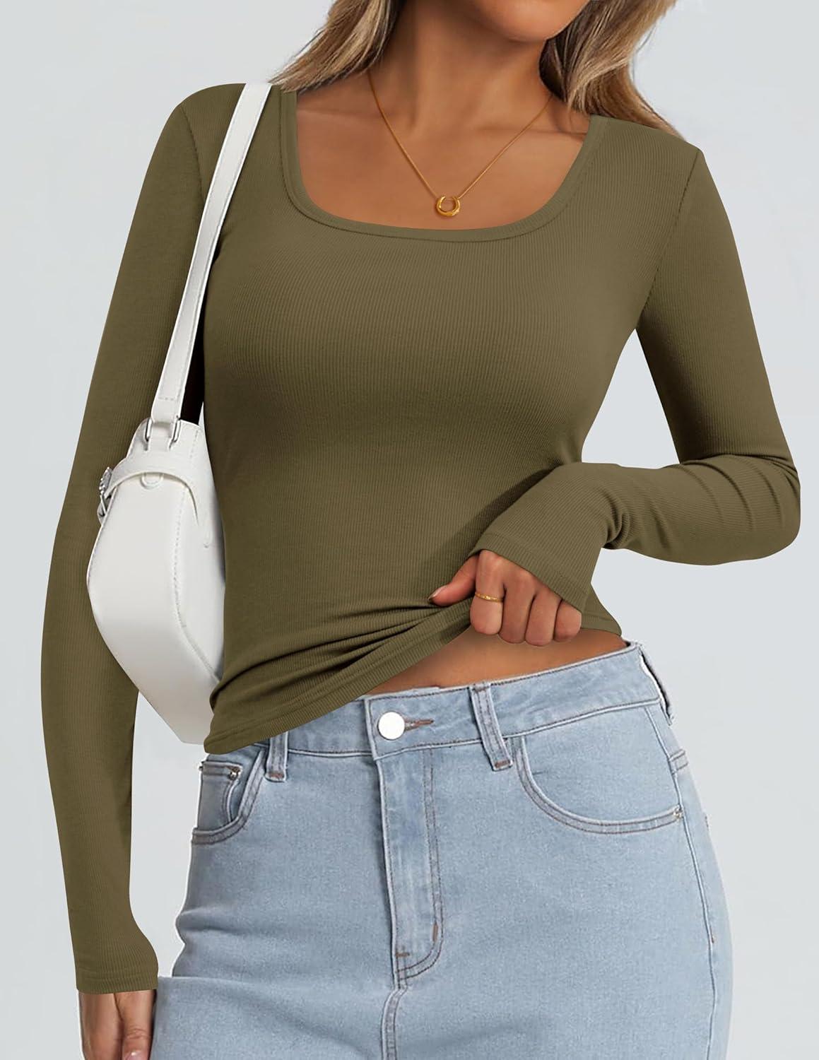 PRETTYGARDEN Long Sleeve Shirts for Women Fall Outfits 2025 Ribbed Basic Tees Scoop Neck Going Out Tops Fashion Clothing(Army Green)