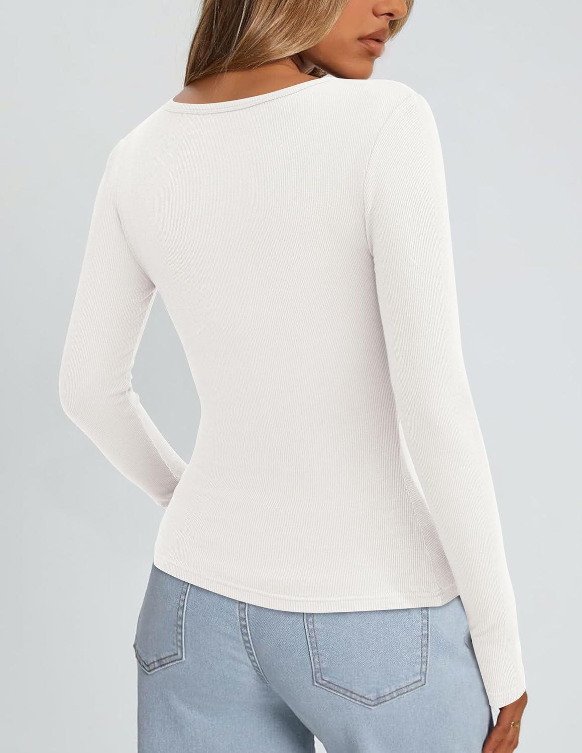 PRETTYGARDEN Long Sleeve Shirts for Women Fall Outfits 2025 Ribbed Basic Tees Scoop Neck Going Out Tops Fashion Clothing(White)