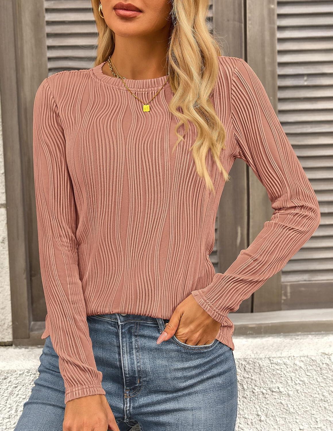 PRETTYGARDEN Long Sleeve Tops for Women 2025 Spring Fall Trendy Business Dressy Casual Shirts Crewneck Textured Blouse(Bean Paste Pink)