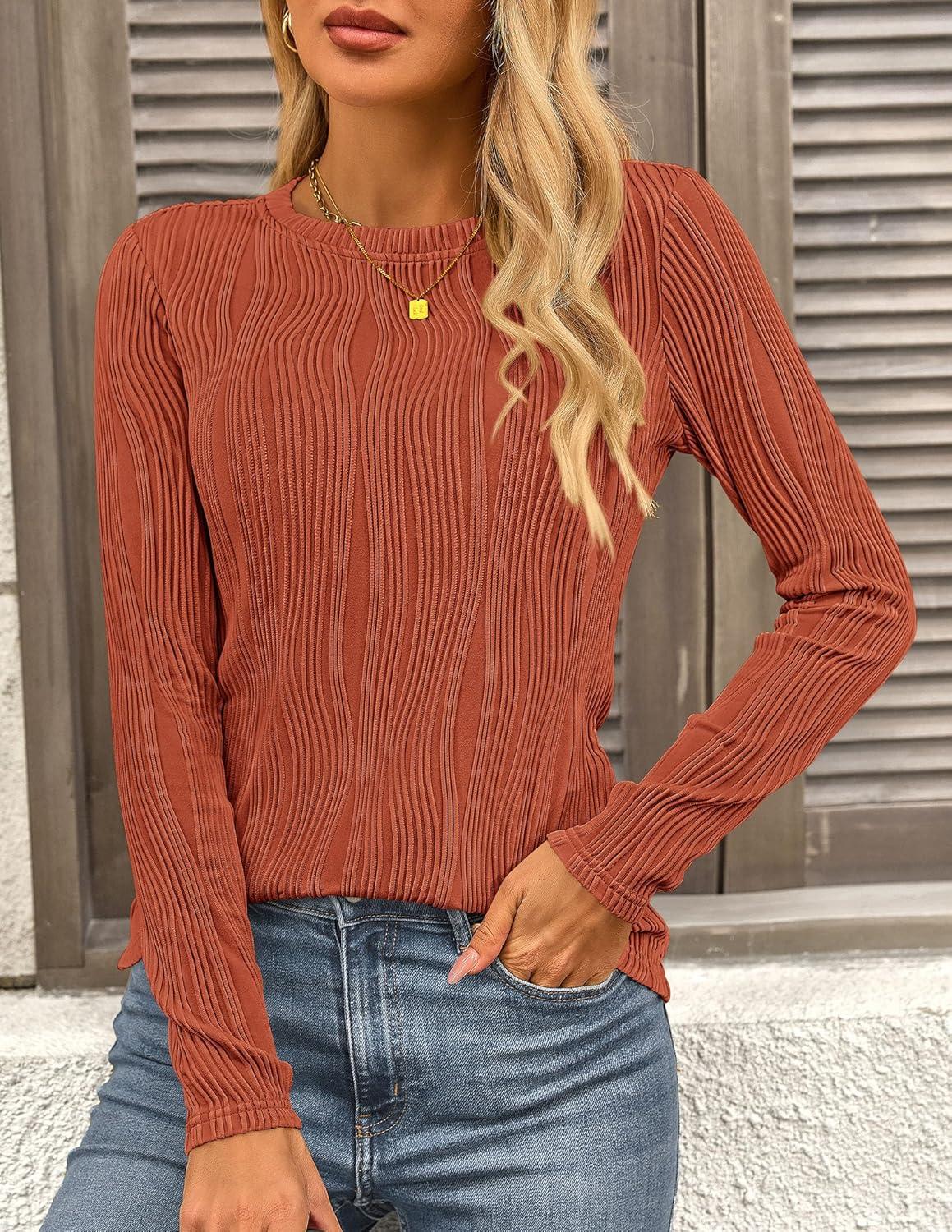 PRETTYGARDEN Long Sleeve Tops for Women 2025 Spring Fall Trendy Business Dressy Casual Shirts Crewneck Textured Blouse(Brick Red)