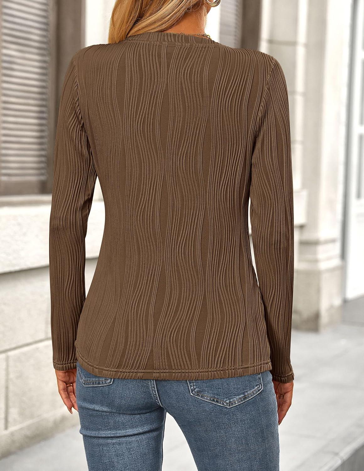 PRETTYGARDEN Long Sleeve Tops for Women 2025 Spring Fall Trendy Business Dressy Casual Shirts Crewneck Textured Blouse(Coffee)