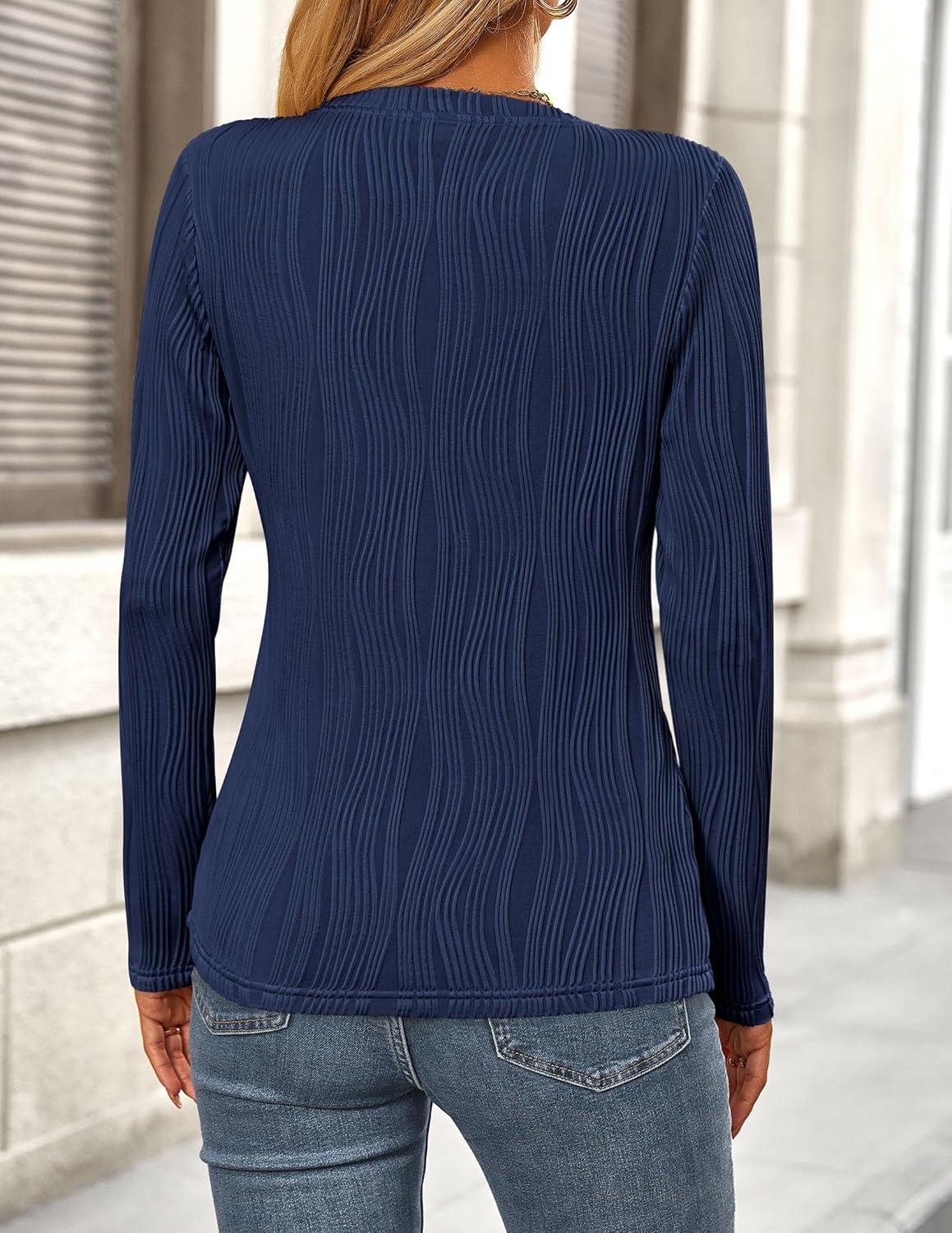 PRETTYGARDEN Long Sleeve Tops for Women 2025 Spring Fall Trendy Business Dressy Casual Shirts Crewneck Textured Blouse(Navy)