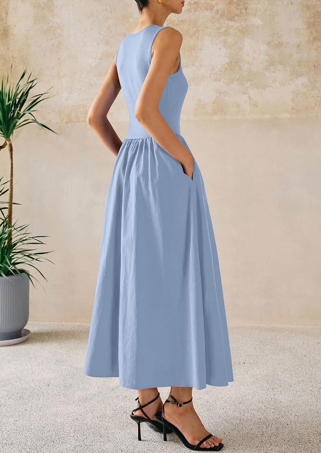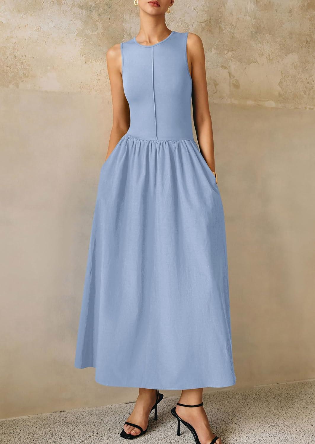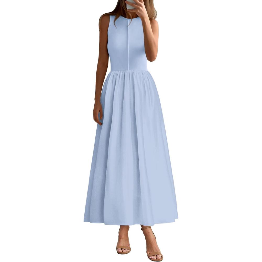 PRETTYGARDEN Maxi Dresses for Women 2025 Summer Casual Sleeveless Patchwork Flowy Vacation Sundress Knit Long Work Tank Dress(Light Blue)