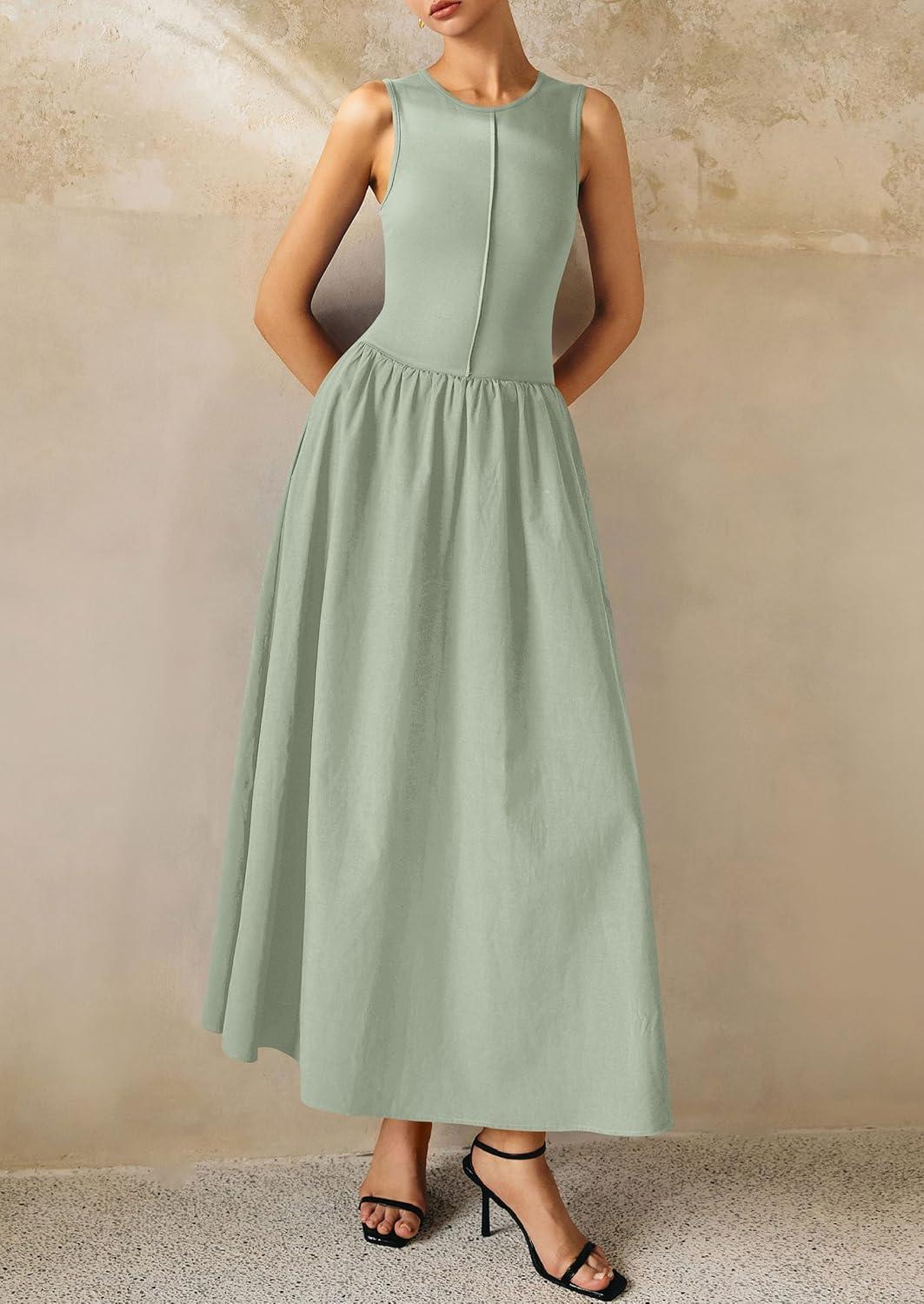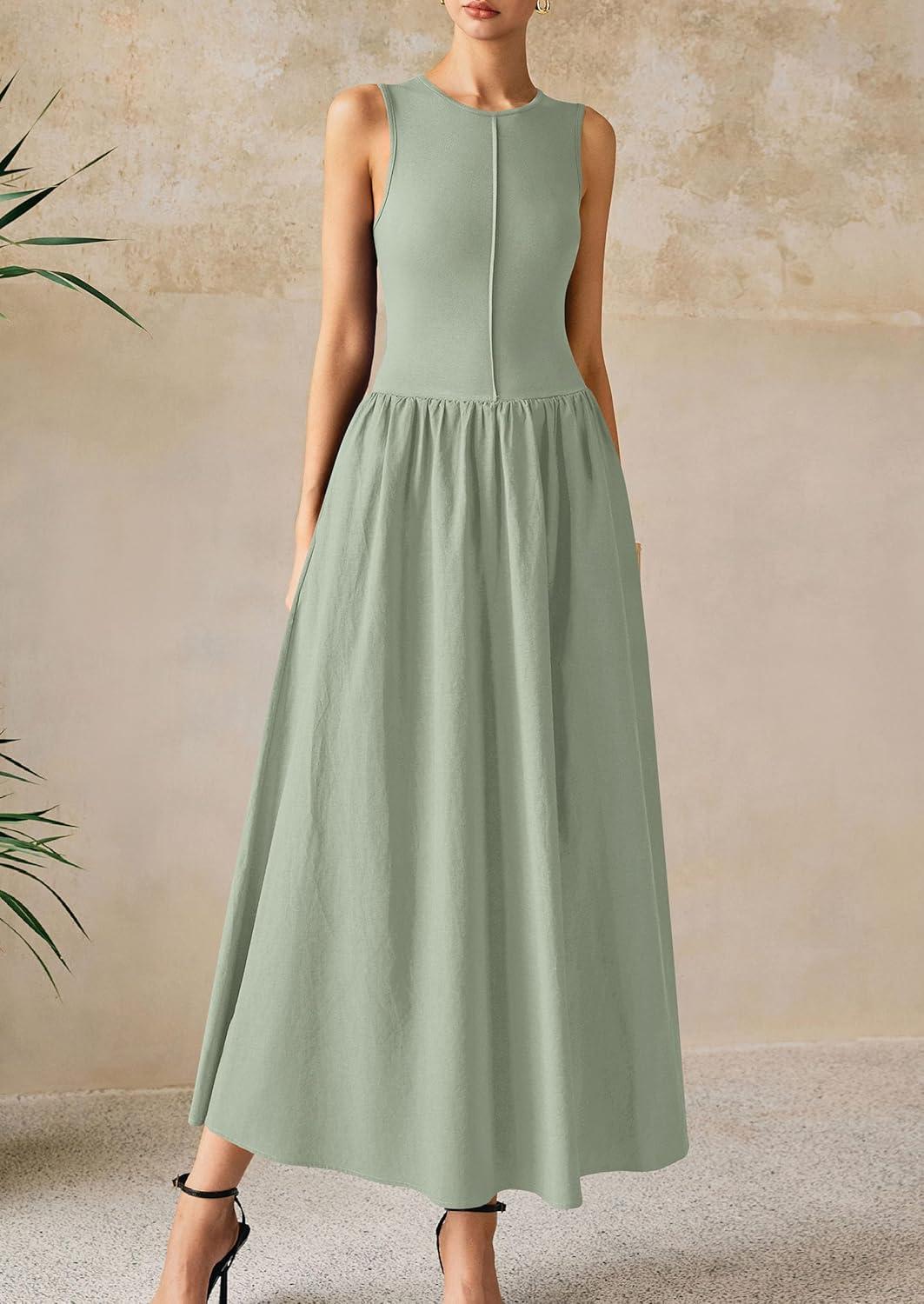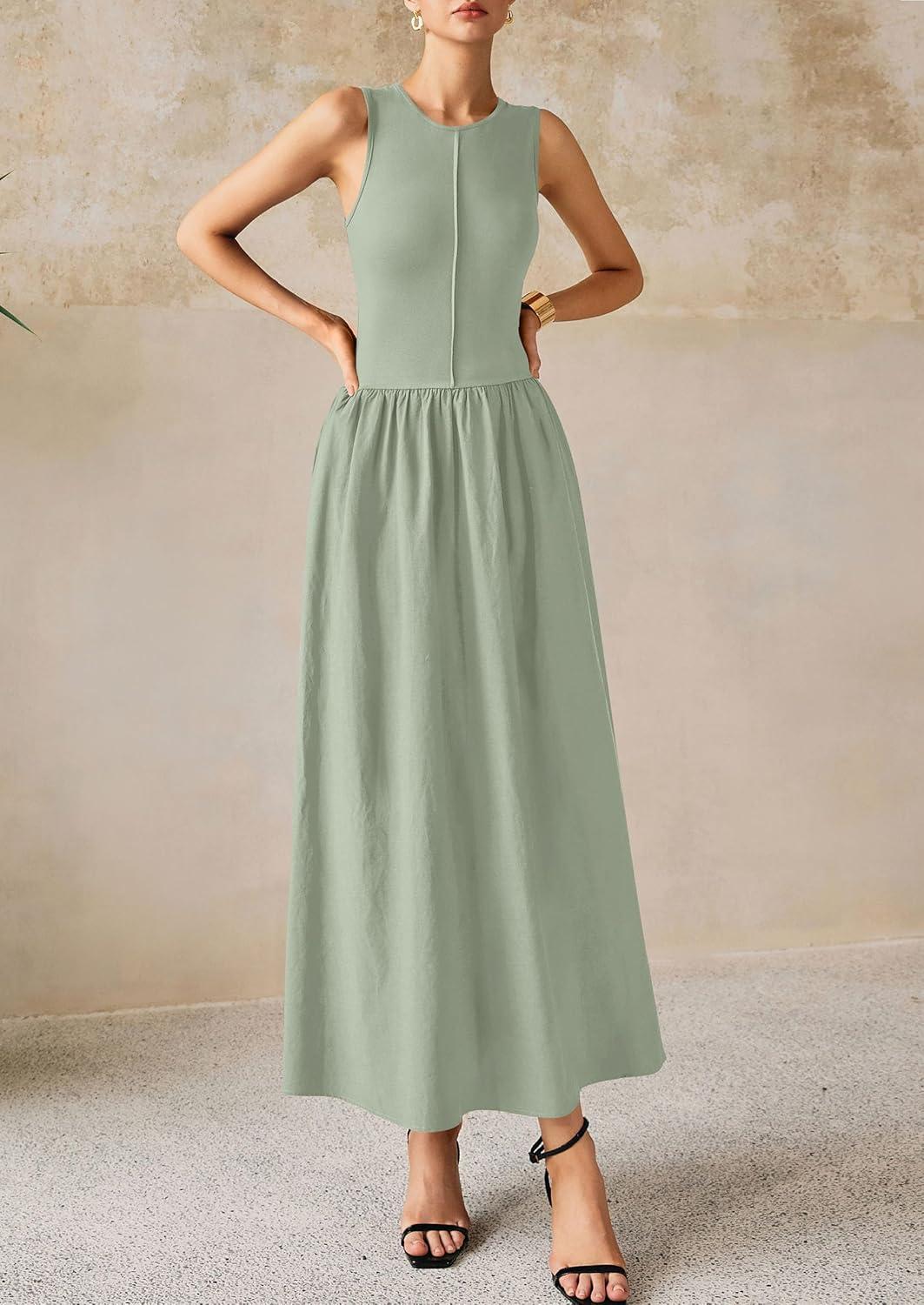 PRETTYGARDEN Maxi Dresses for Women 2025 Summer Casual Sleeveless Patchwork Flowy Vacation Sundress Knit Long Work Tank Dress(Light Green)