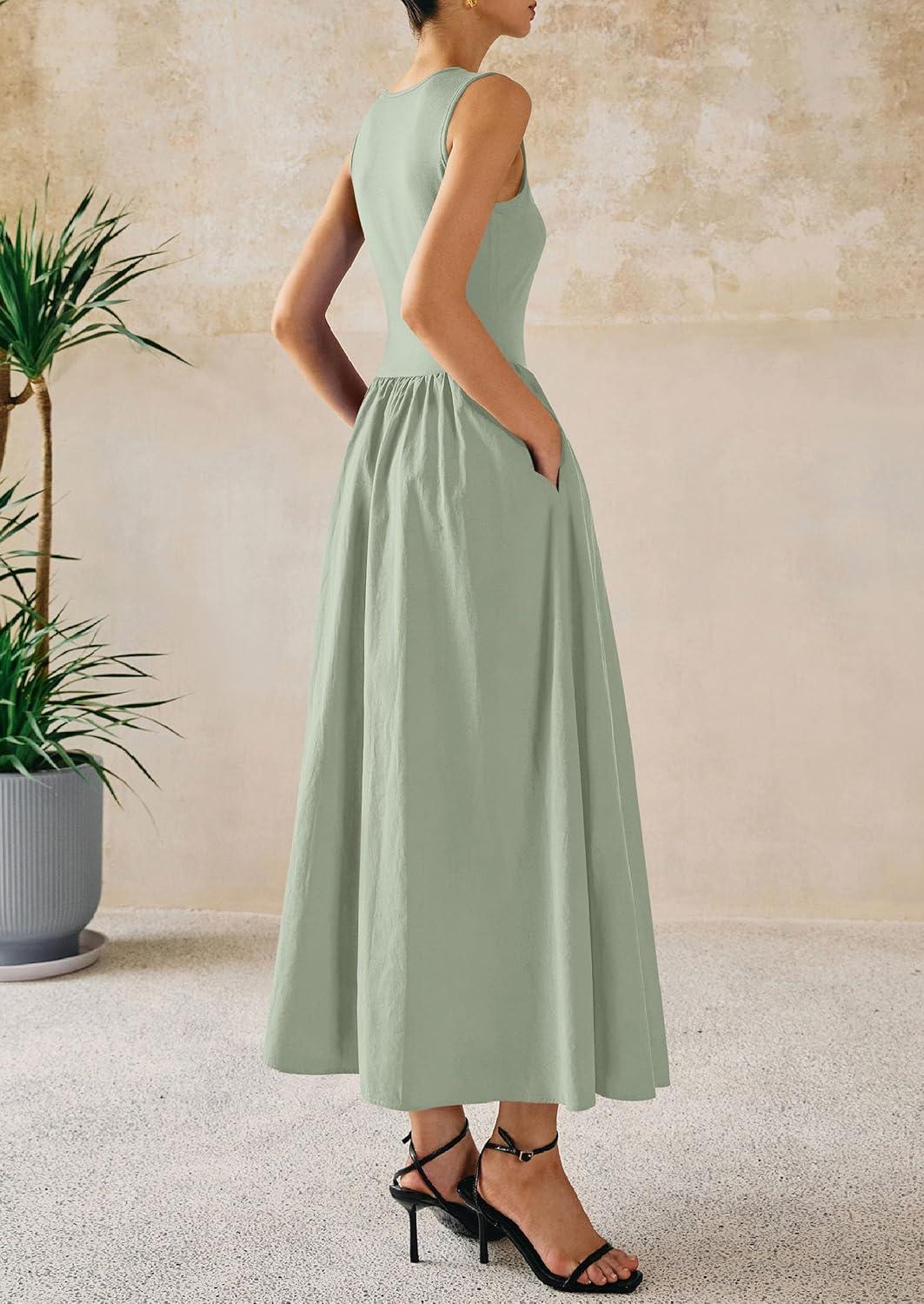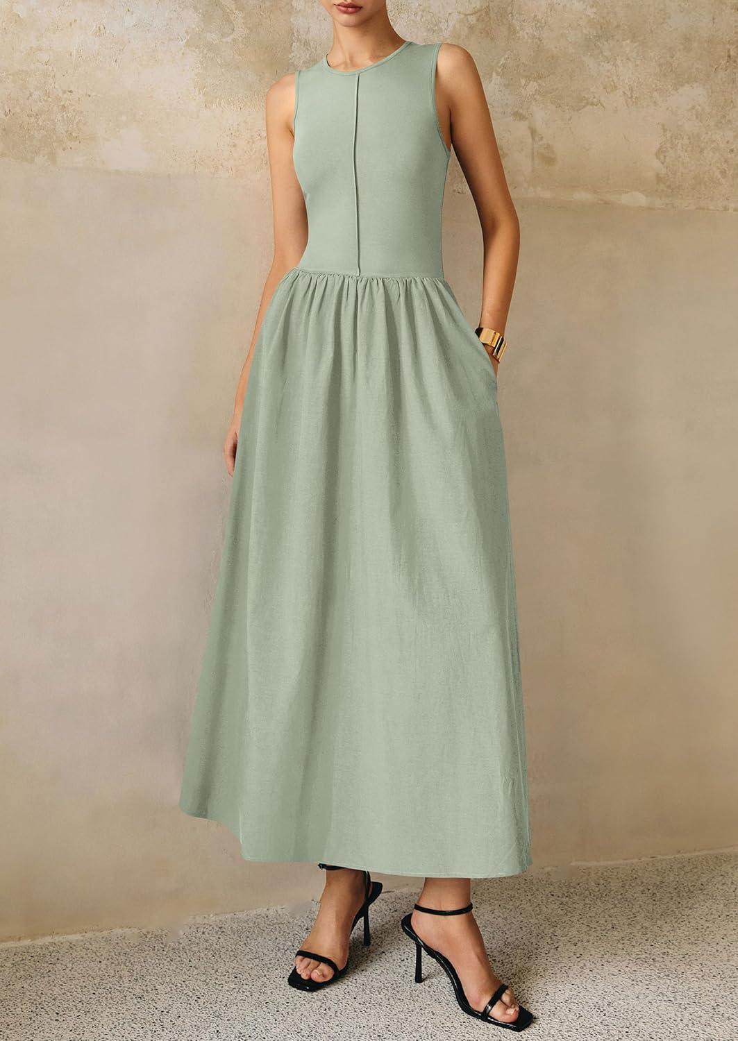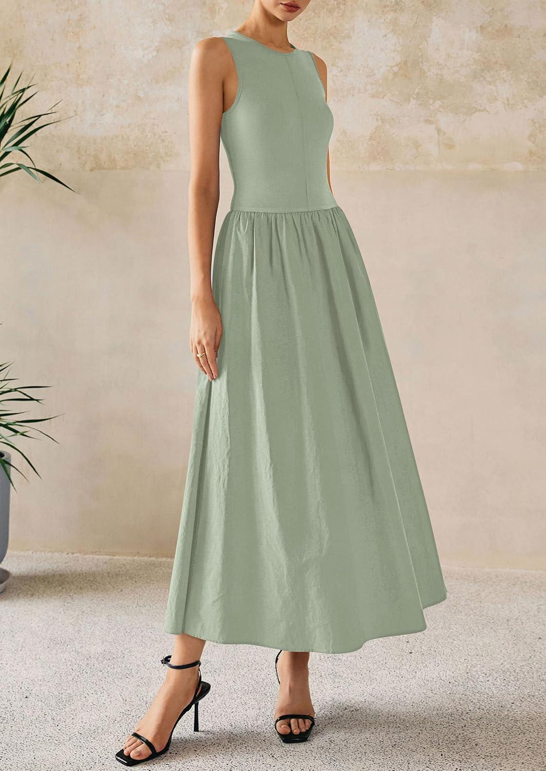 PRETTYGARDEN Maxi Dresses for Women 2025 Summer Casual Sleeveless Patchwork Flowy Vacation Sundress Knit Long Work Tank Dress(Light Green)