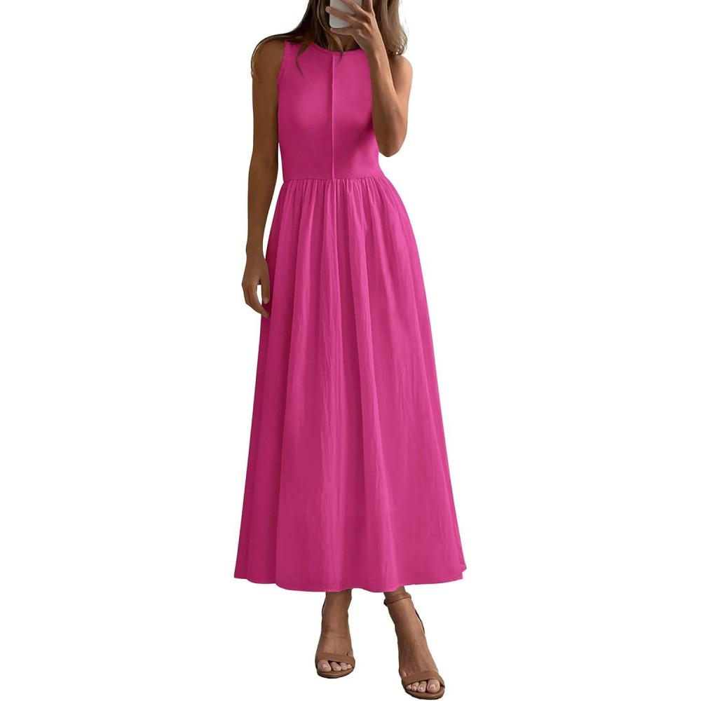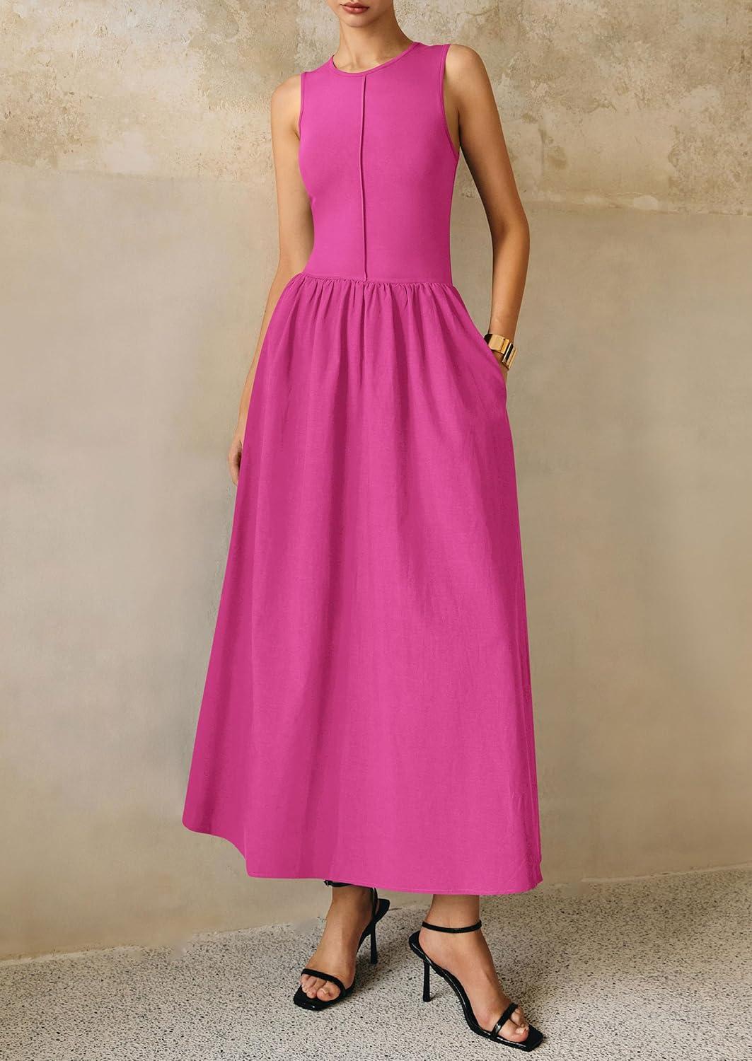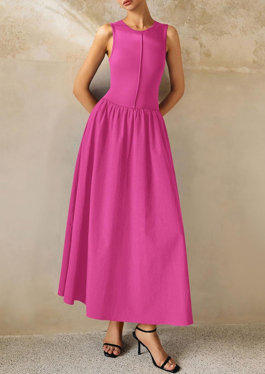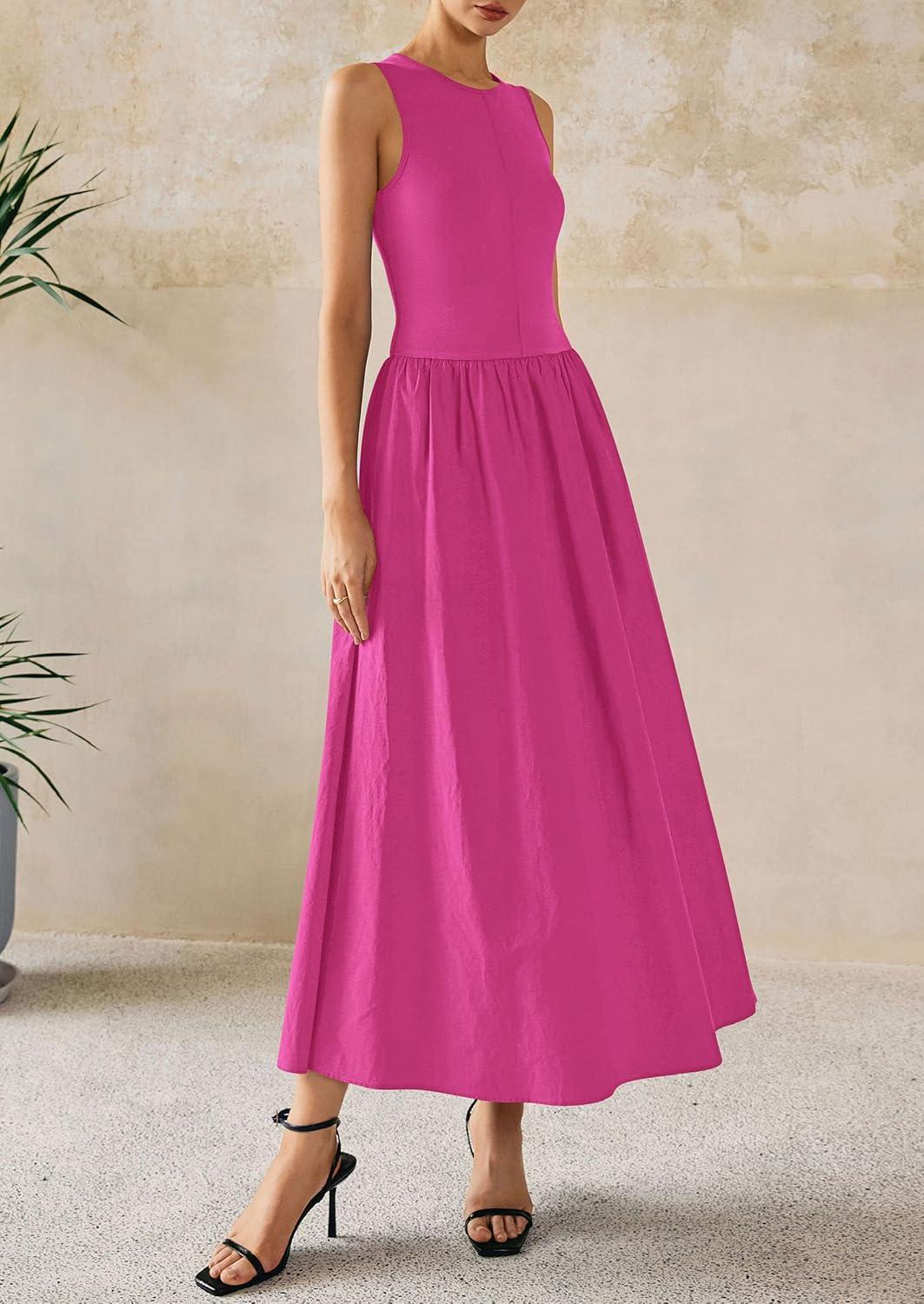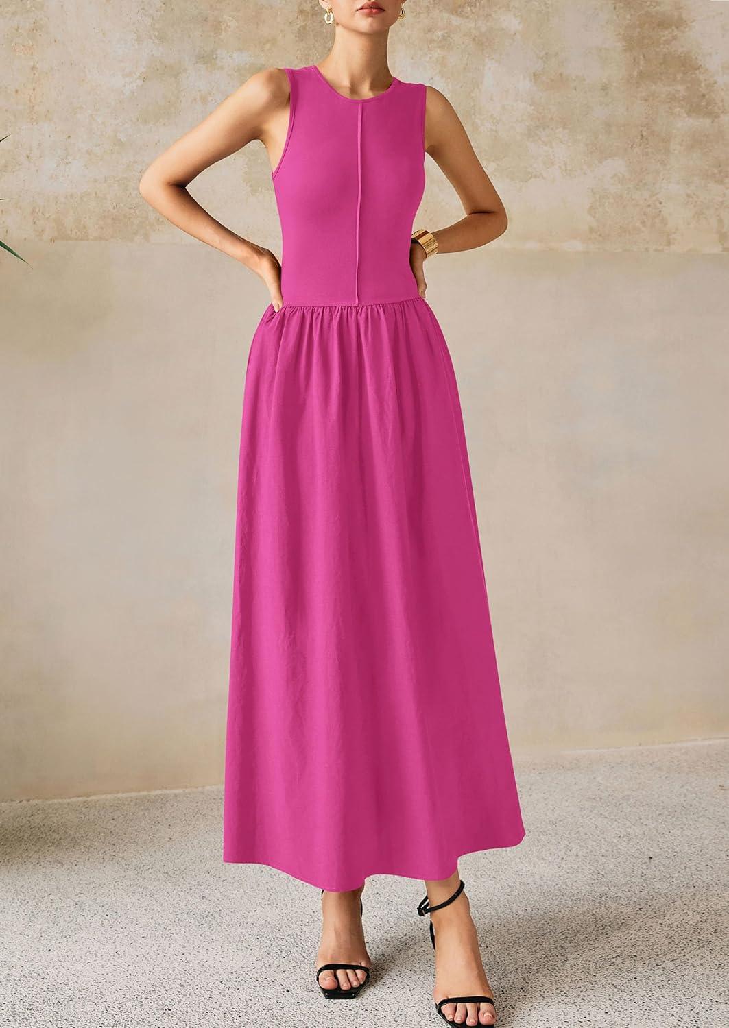 PRETTYGARDEN Maxi Dresses for Women 2025 Summer Casual Sleeveless Patchwork Flowy Vacation Sundress Knit Long Work Tank Dress(Rose Red)