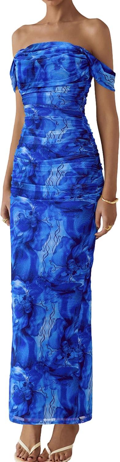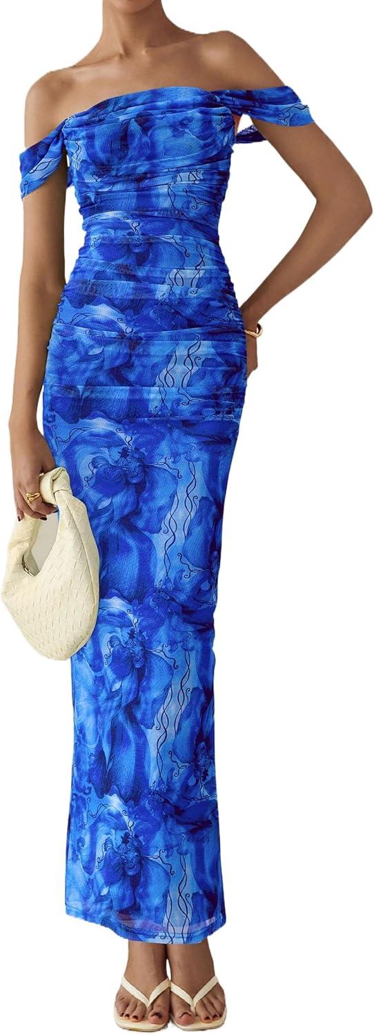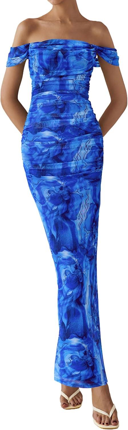 PRETTYGARDEN Maxi Dresses for Women 2025 Summer Elegant Floral Off Shoulder Ruched Mesh Cocktail Wedding Guest Dress(Blue Floral)