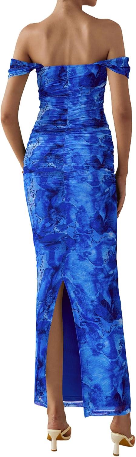 PRETTYGARDEN Maxi Dresses for Women 2025 Summer Elegant Floral Off Shoulder Ruched Mesh Cocktail Wedding Guest Dress(Bright Blue)