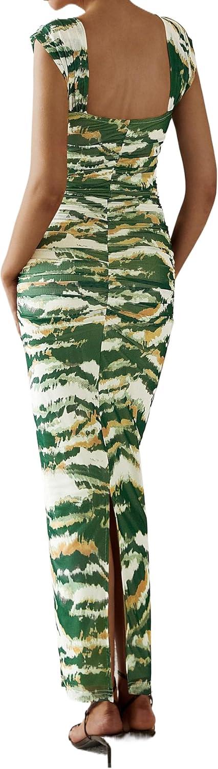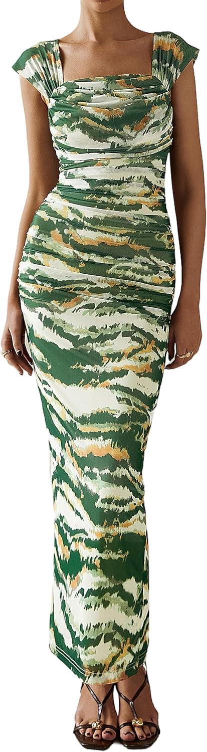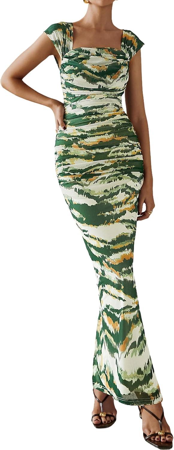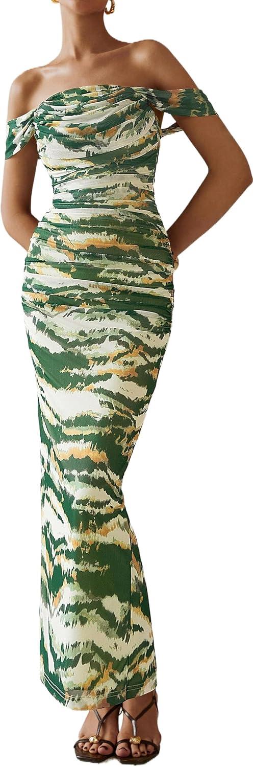 PRETTYGARDEN Maxi Dresses for Women 2025 Summer Elegant Floral Off Shoulder Ruched Mesh Cocktail Wedding Guest Dress(Green Big Floral)