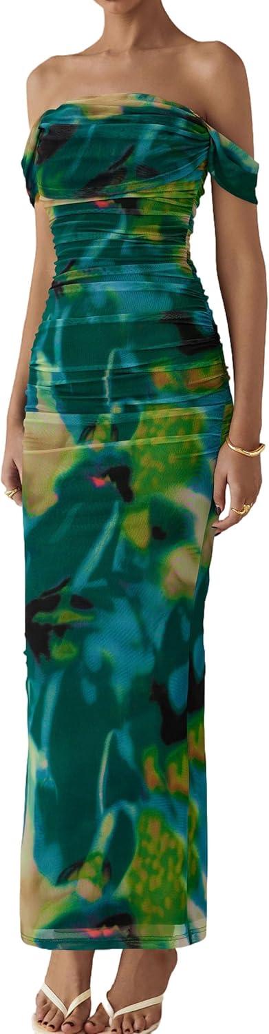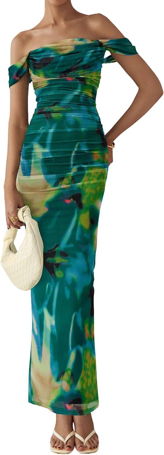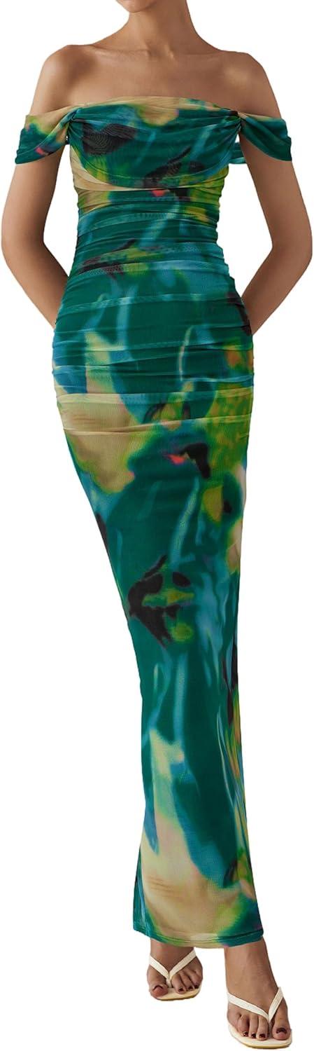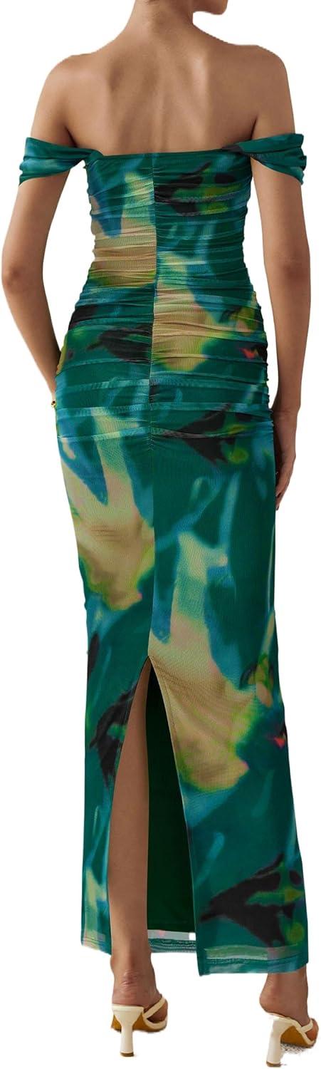 PRETTYGARDEN Maxi Dresses for Women 2025 Summer Elegant Floral Off Shoulder Ruched Mesh Cocktail Wedding Guest Dress(Green Floral)