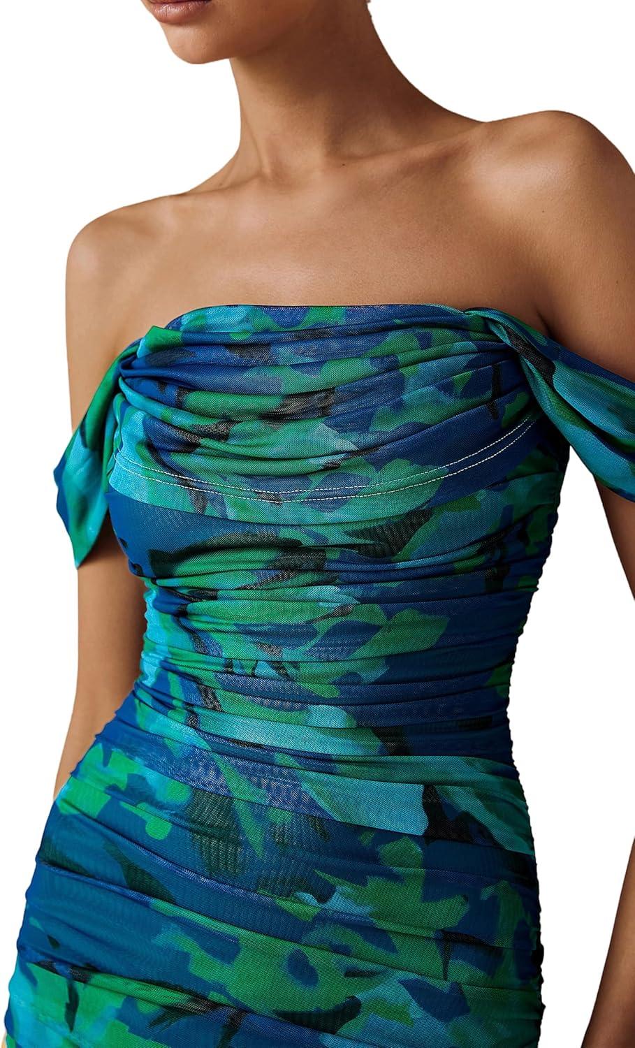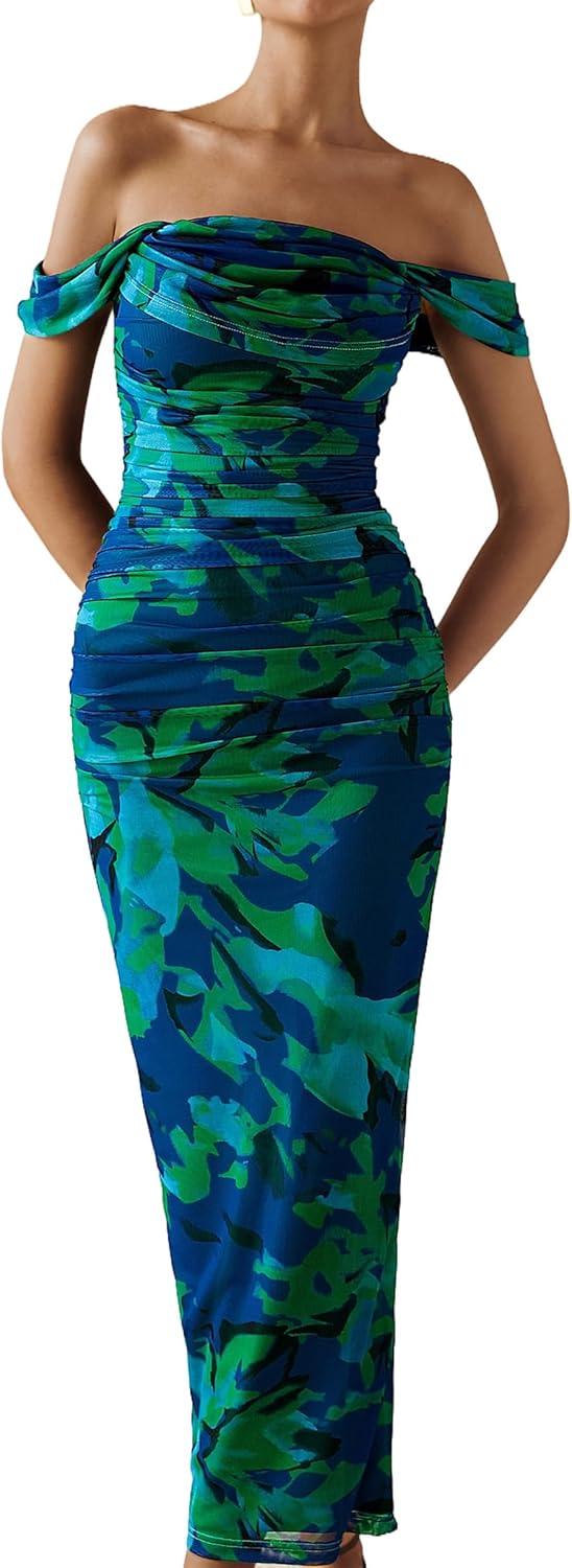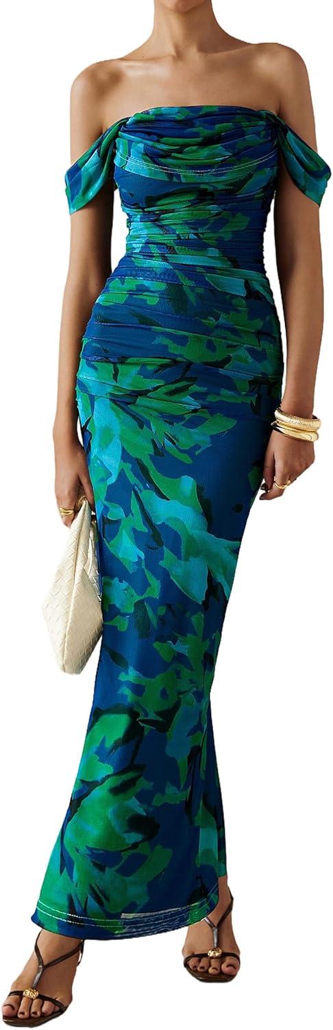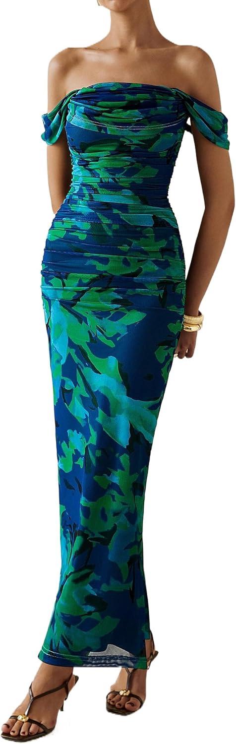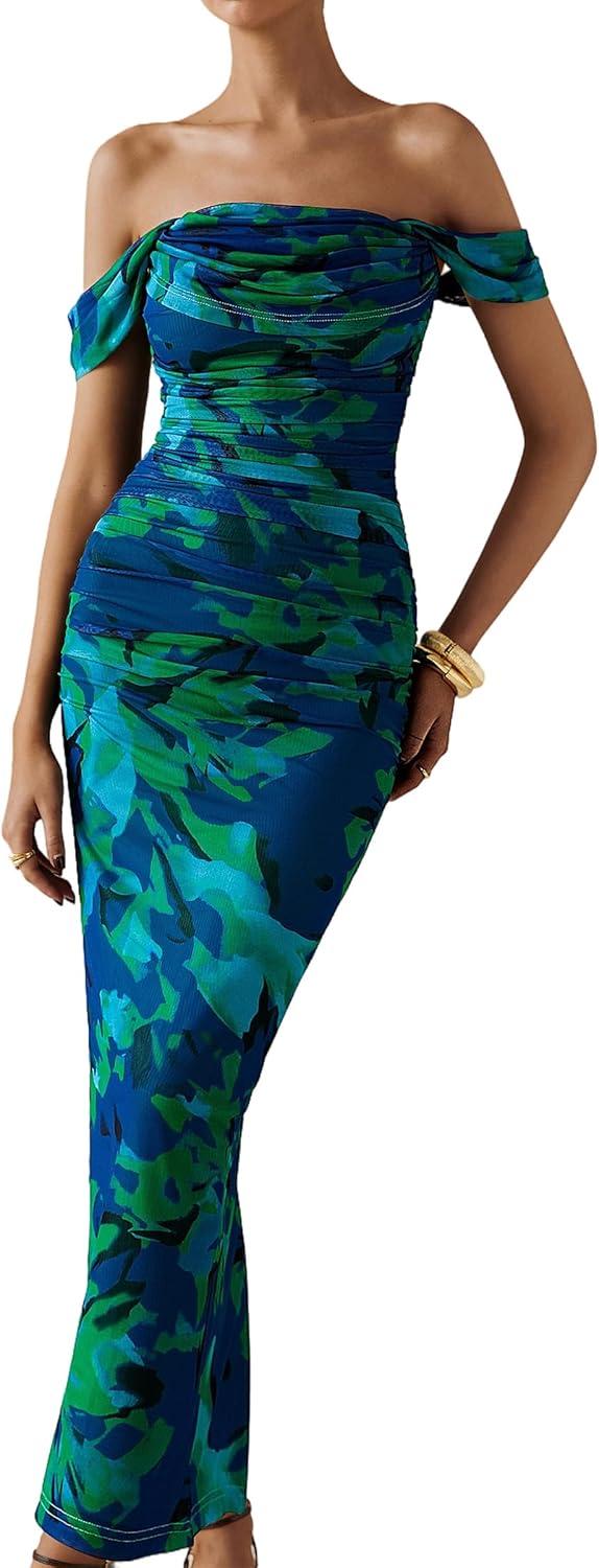PRETTYGARDEN Maxi Dresses for Women 2025 Summer Elegant Floral Off Shoulder Ruched Mesh Cocktail Wedding Guest Dress(Green Floral)