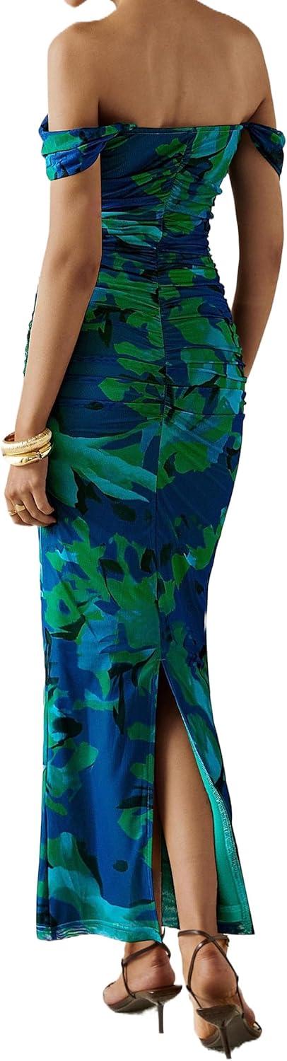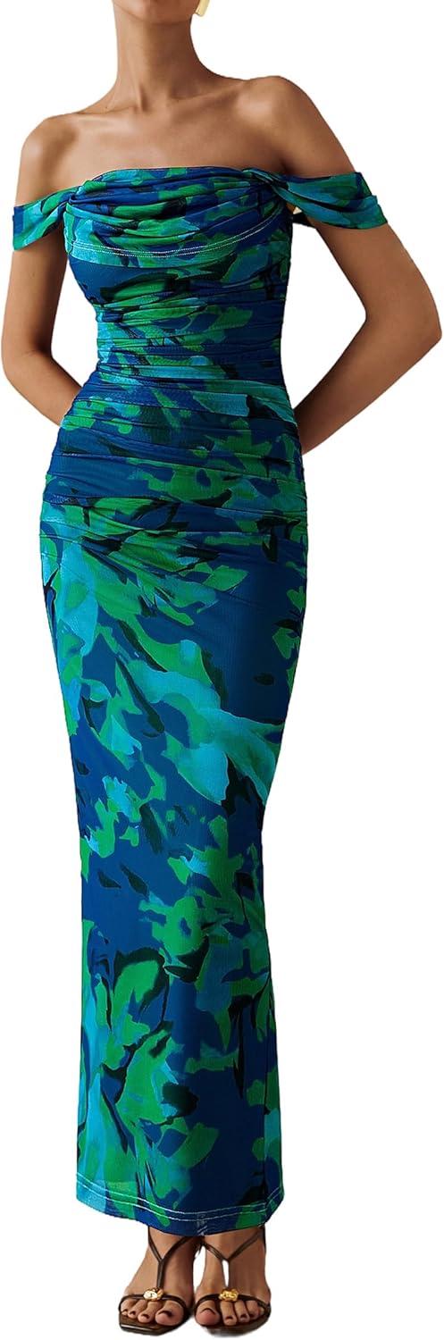 PRETTYGARDEN Maxi Dresses for Women 2025 Summer Elegant Floral Off Shoulder Ruched Mesh Cocktail Wedding Guest Dress(Green Big Floral)