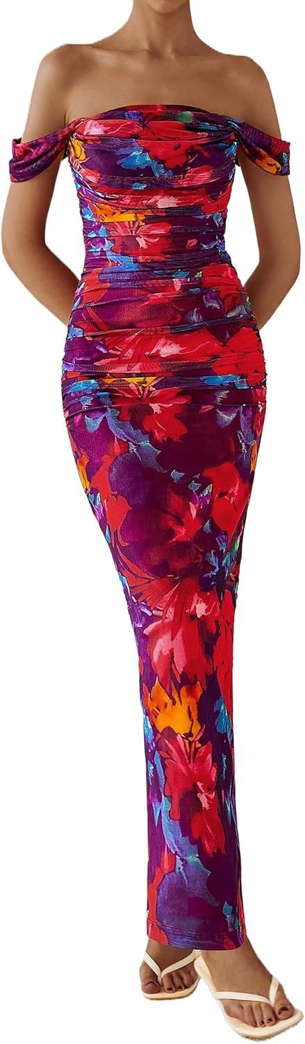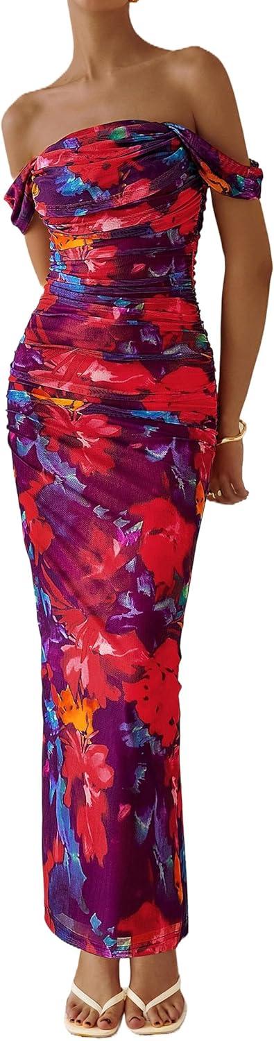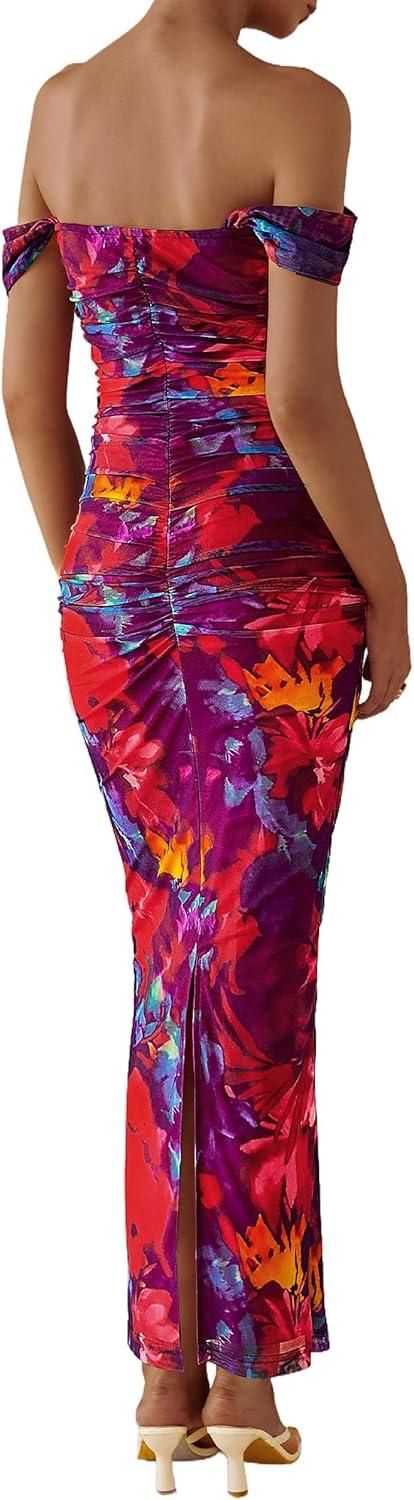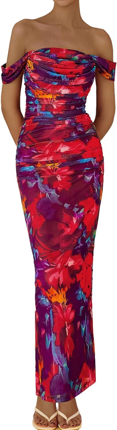 PRETTYGARDEN Maxi Dresses for Women 2025 Summer Elegant Floral Off Shoulder Ruched Mesh Cocktail Wedding Guest Dress(Orange Red Big Floral)