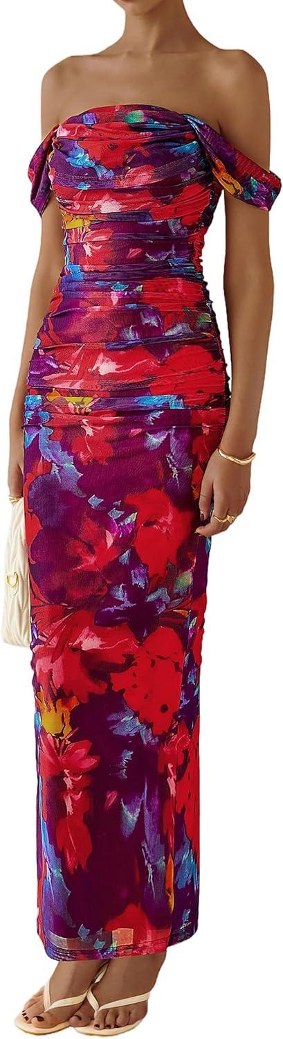PRETTYGARDEN Maxi Dresses for Women 2025 Summer Elegant Floral Off Shoulder Ruched Mesh Cocktail Wedding Guest Dress(Navy Red Floral)