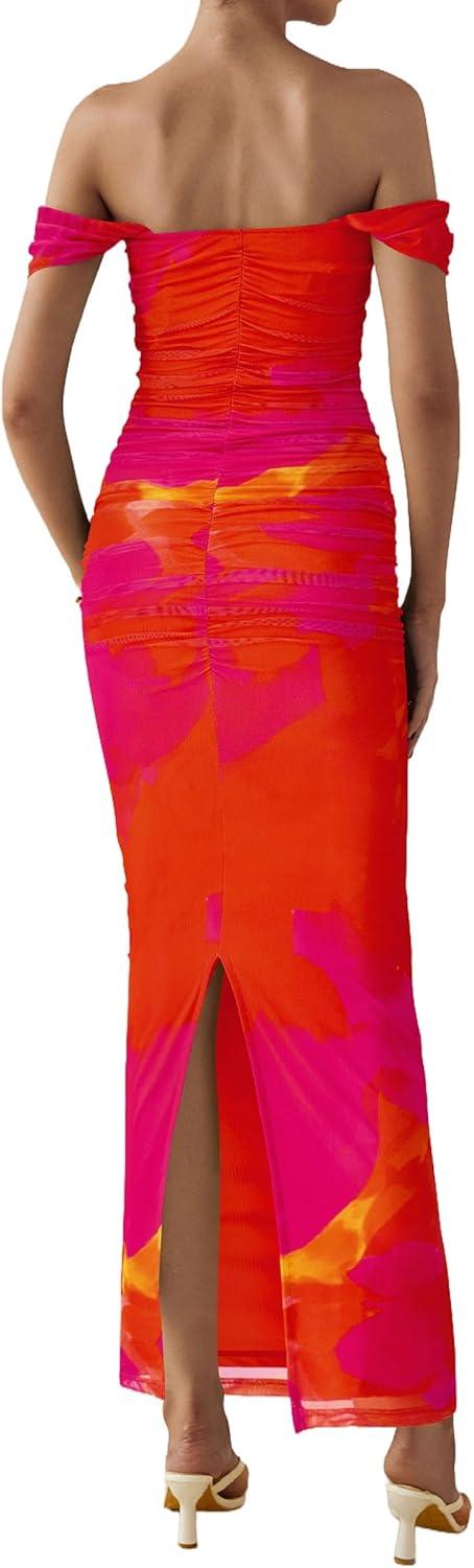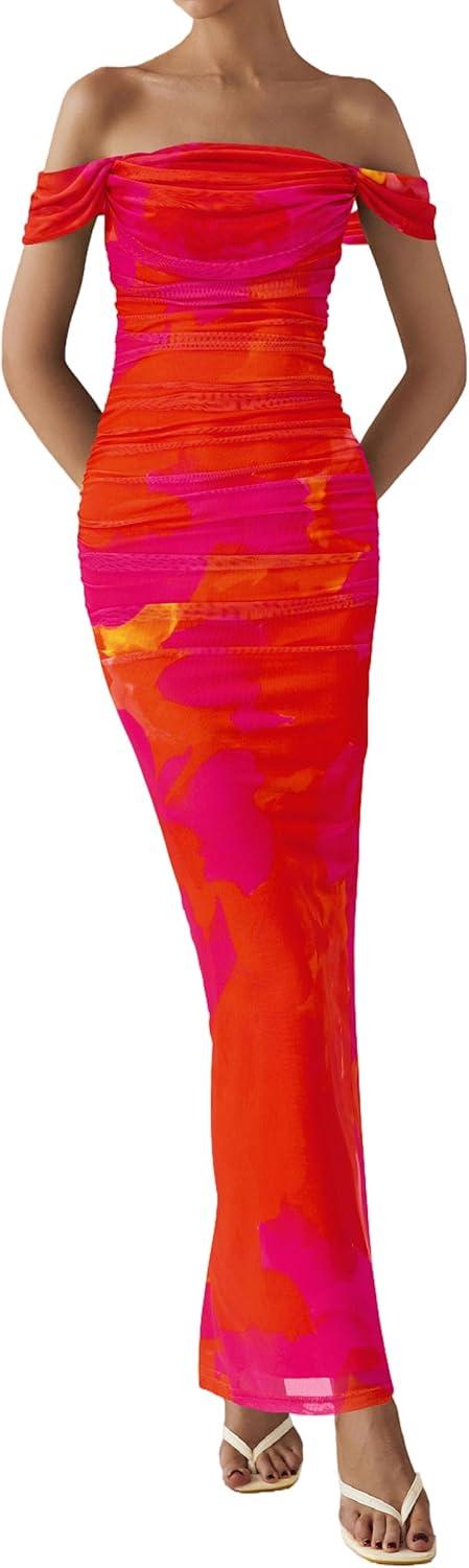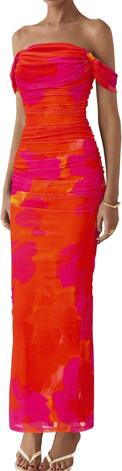 PRETTYGARDEN Maxi Dresses for Women 2025 Summer Elegant Floral Off Shoulder Ruched Mesh Cocktail Wedding Guest Dress(Orange Red Big Floral)