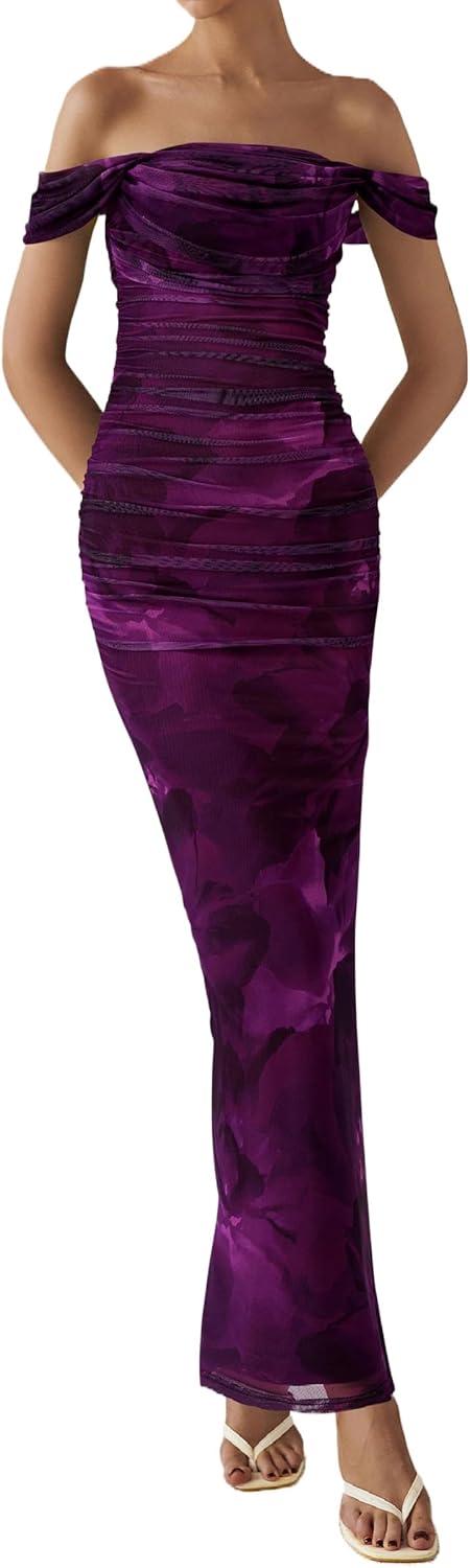 PRETTYGARDEN Maxi Dresses for Women 2025 Summer Elegant Floral Off Shoulder Ruched Mesh Cocktail Wedding Guest Dress(Purple Floral)