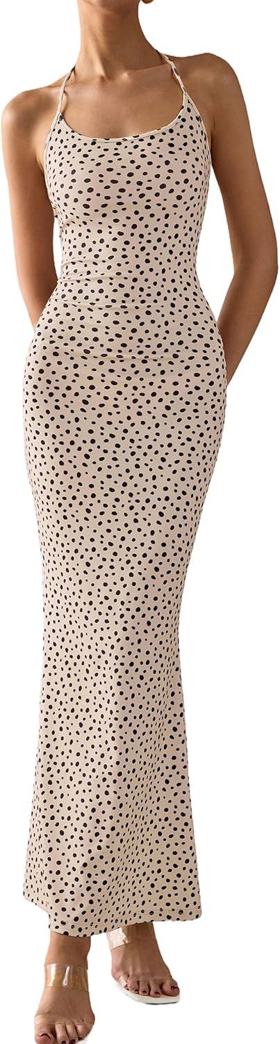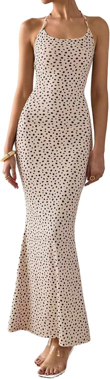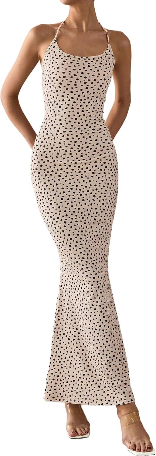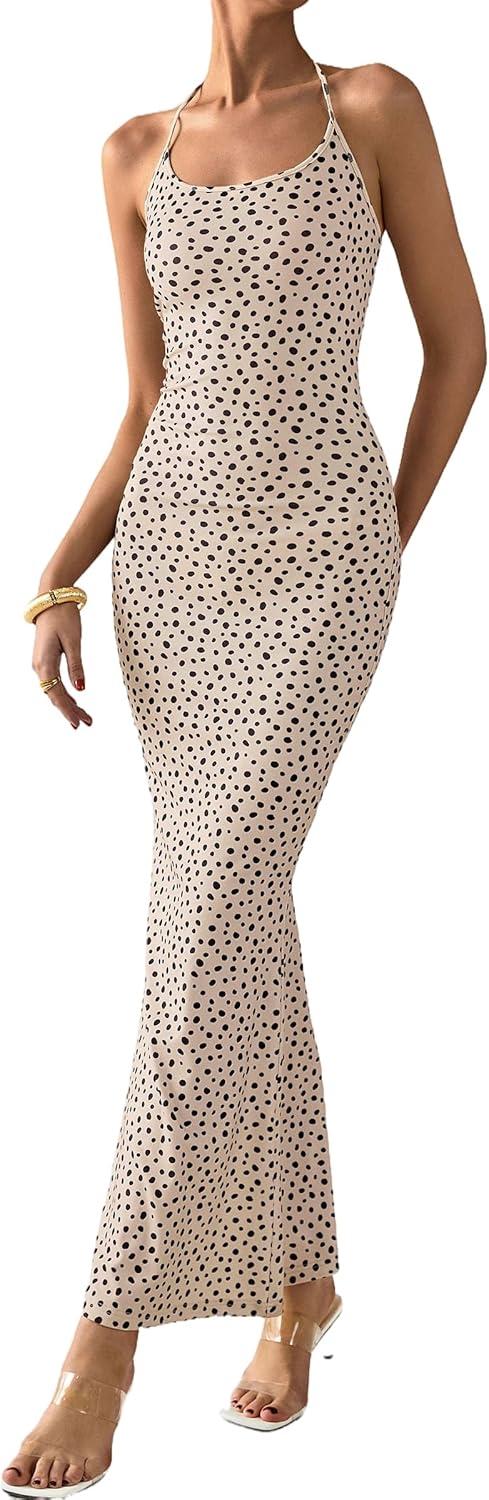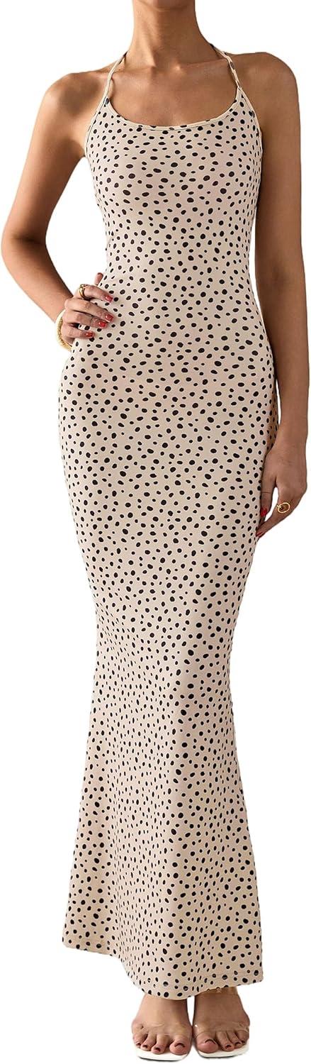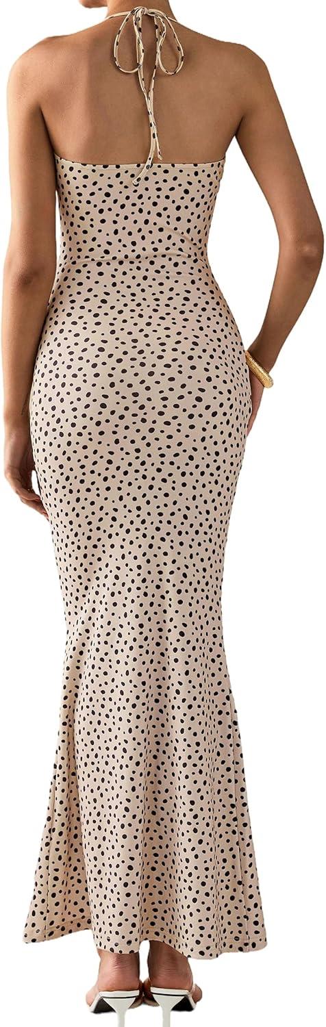PRETTYGARDEN Maxi Dresses for Women 2025 Summer Halter Leopard Print Backless Sexy Bodycon Cocktail Beach Long Dress(Dot Apricot Black)