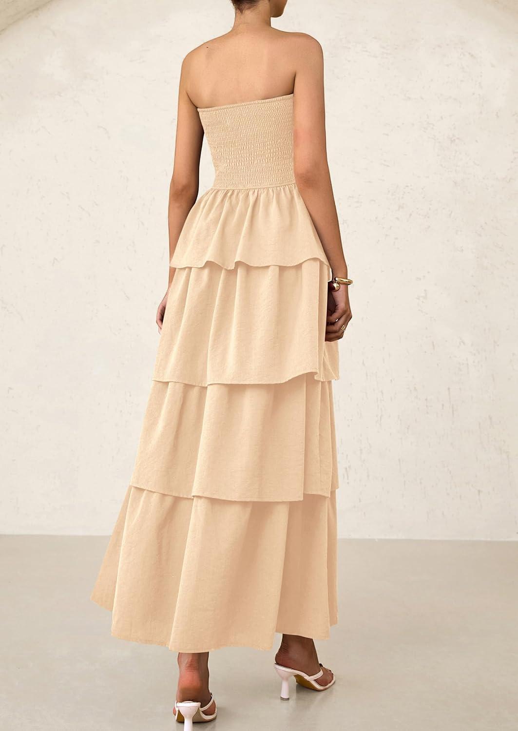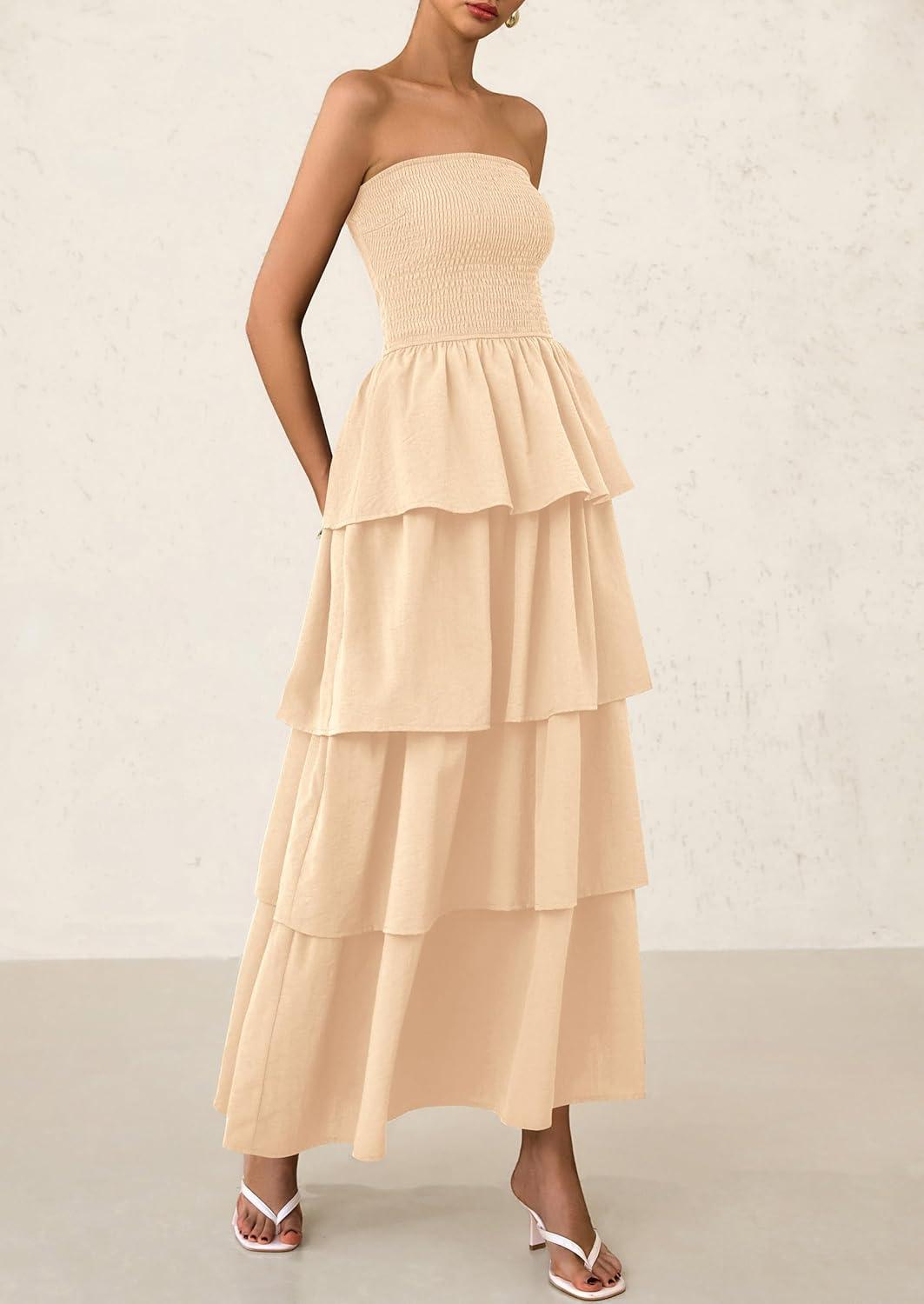 PRETTYGARDEN Maxi Dresses for Women 2025 Summer Off Shoulder Smocked Tiered Ruffle Long Flowy Wedding Guest Dress(Apricot)