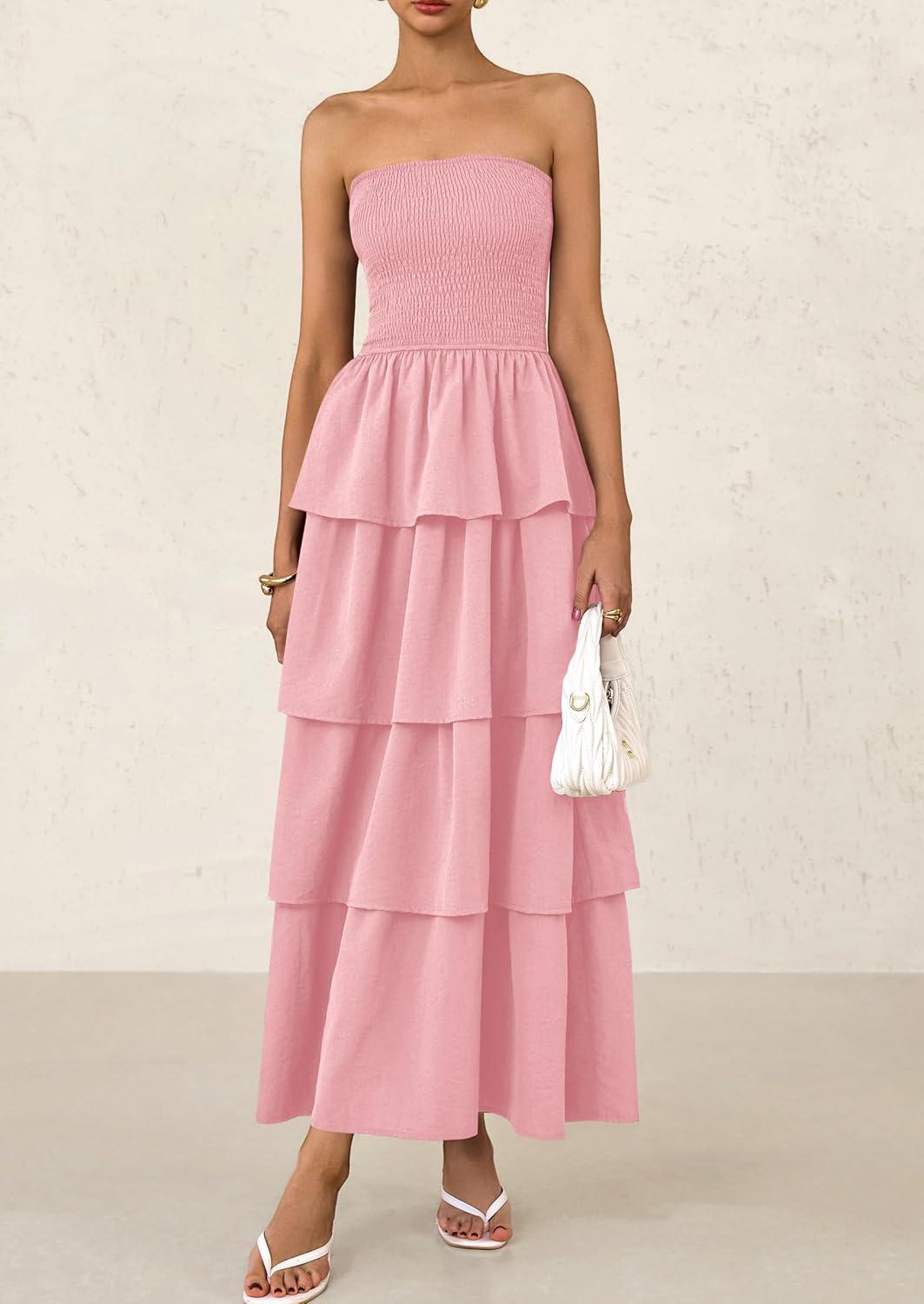 PRETTYGARDEN Maxi Dresses for Women 2025 Summer Off Shoulder Smocked Tiered Ruffle Long Flowy Wedding Guest Dress(Pink)
