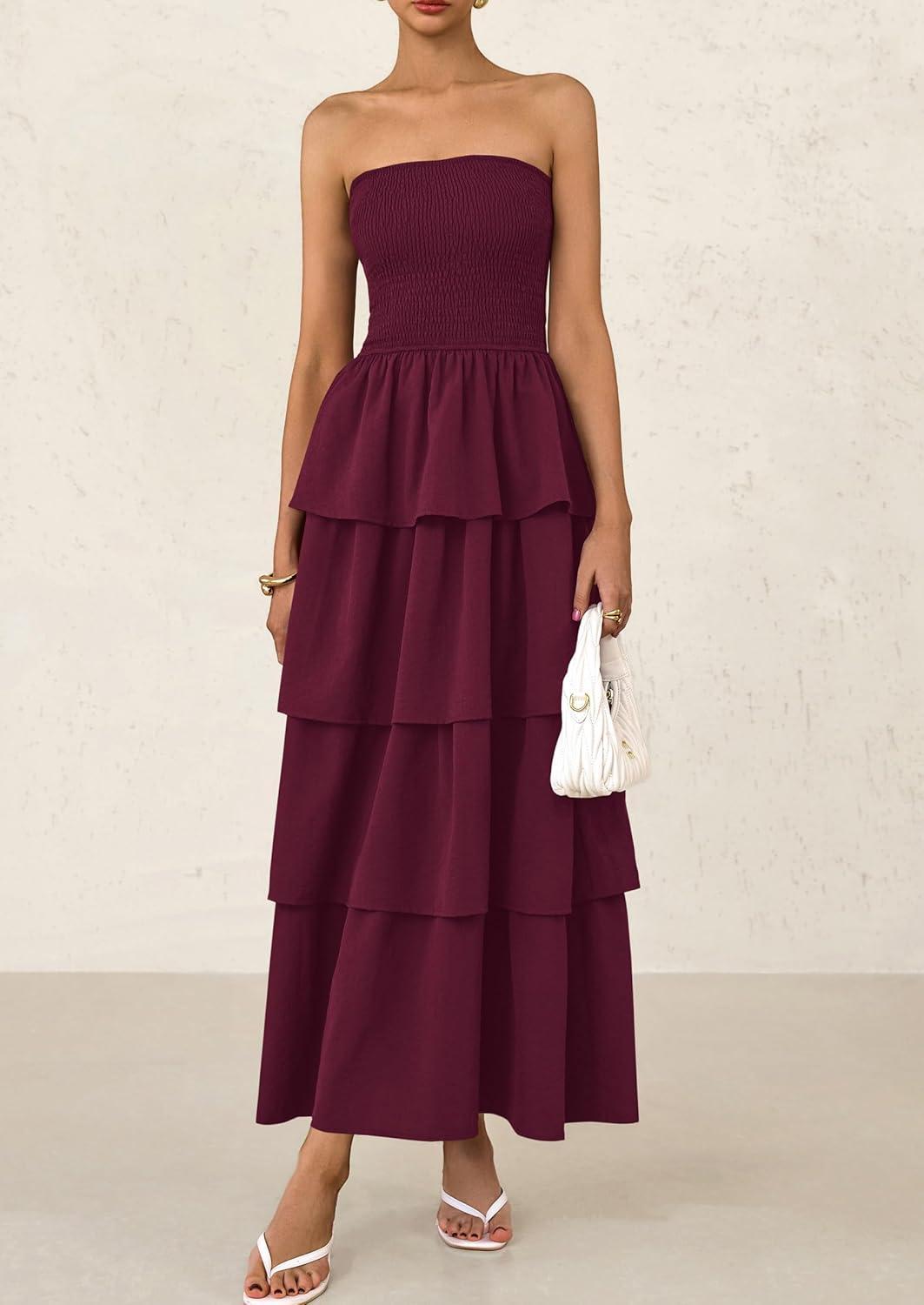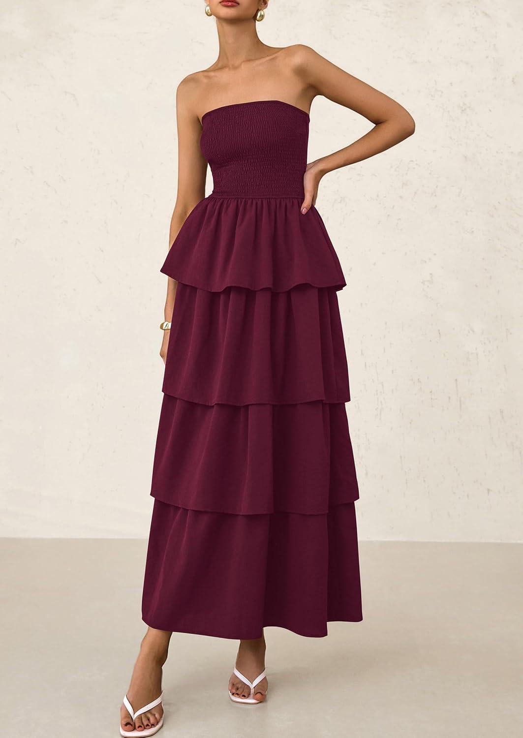 PRETTYGARDEN Maxi Dresses for Women 2025 Summer Off Shoulder Smocked Tiered Ruffle Long Flowy Wedding Guest Dress(Wine Red)