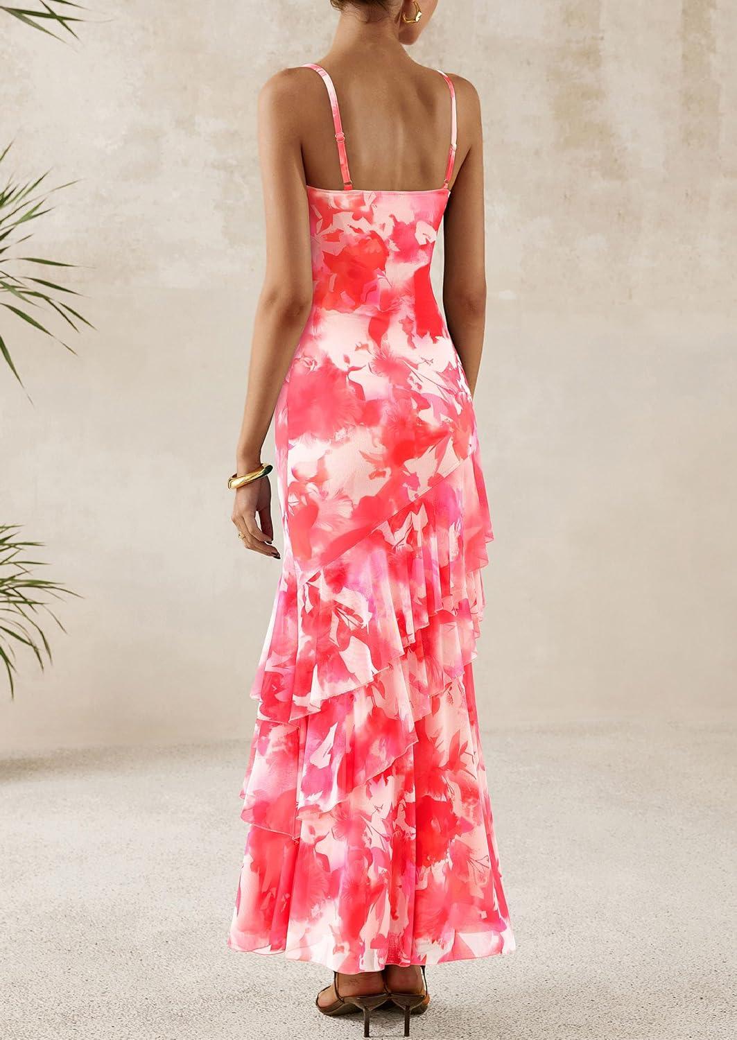 PRETTYGARDEN Maxi Dresses for Women 2025 Summer Tiered Floral Beach Sundress Spaghetti Strap Wedding Guest Long Dress(Floral Pink Red)