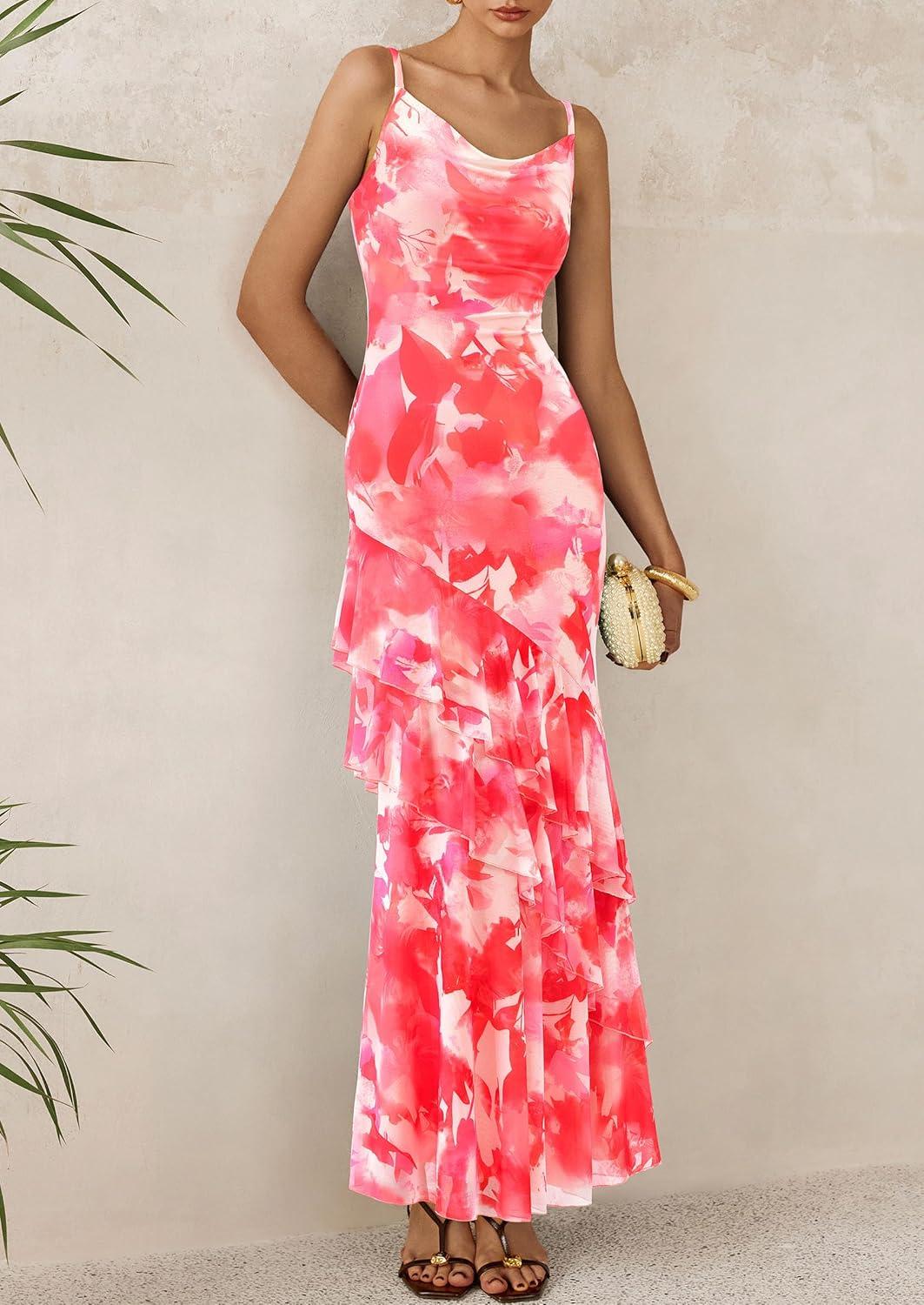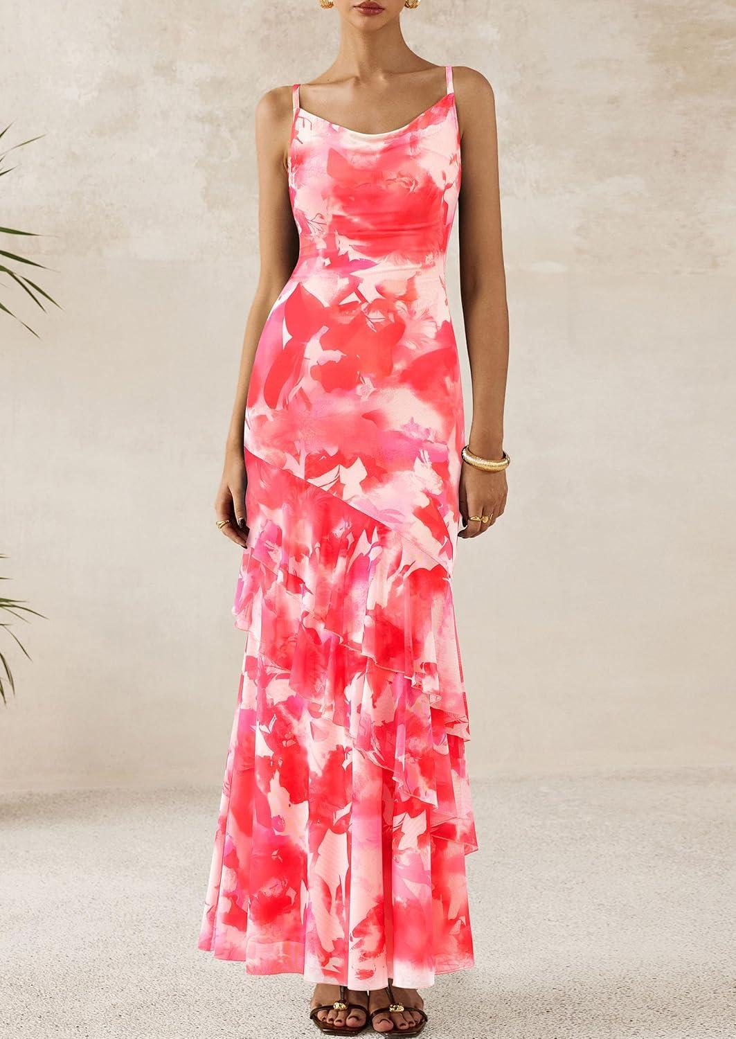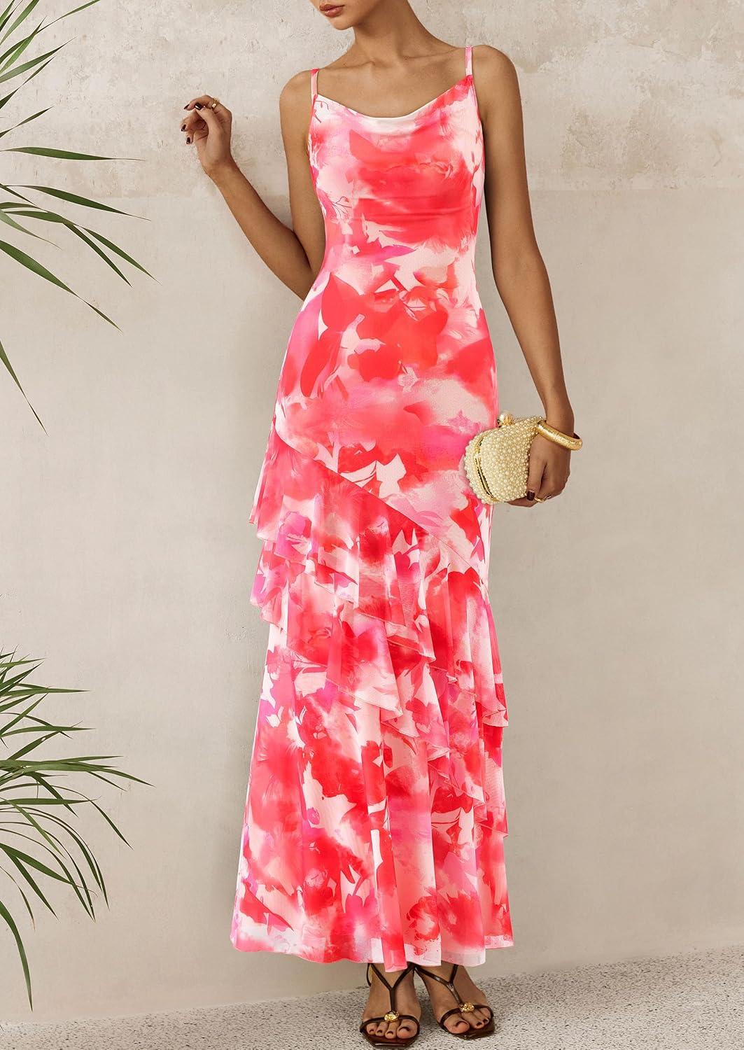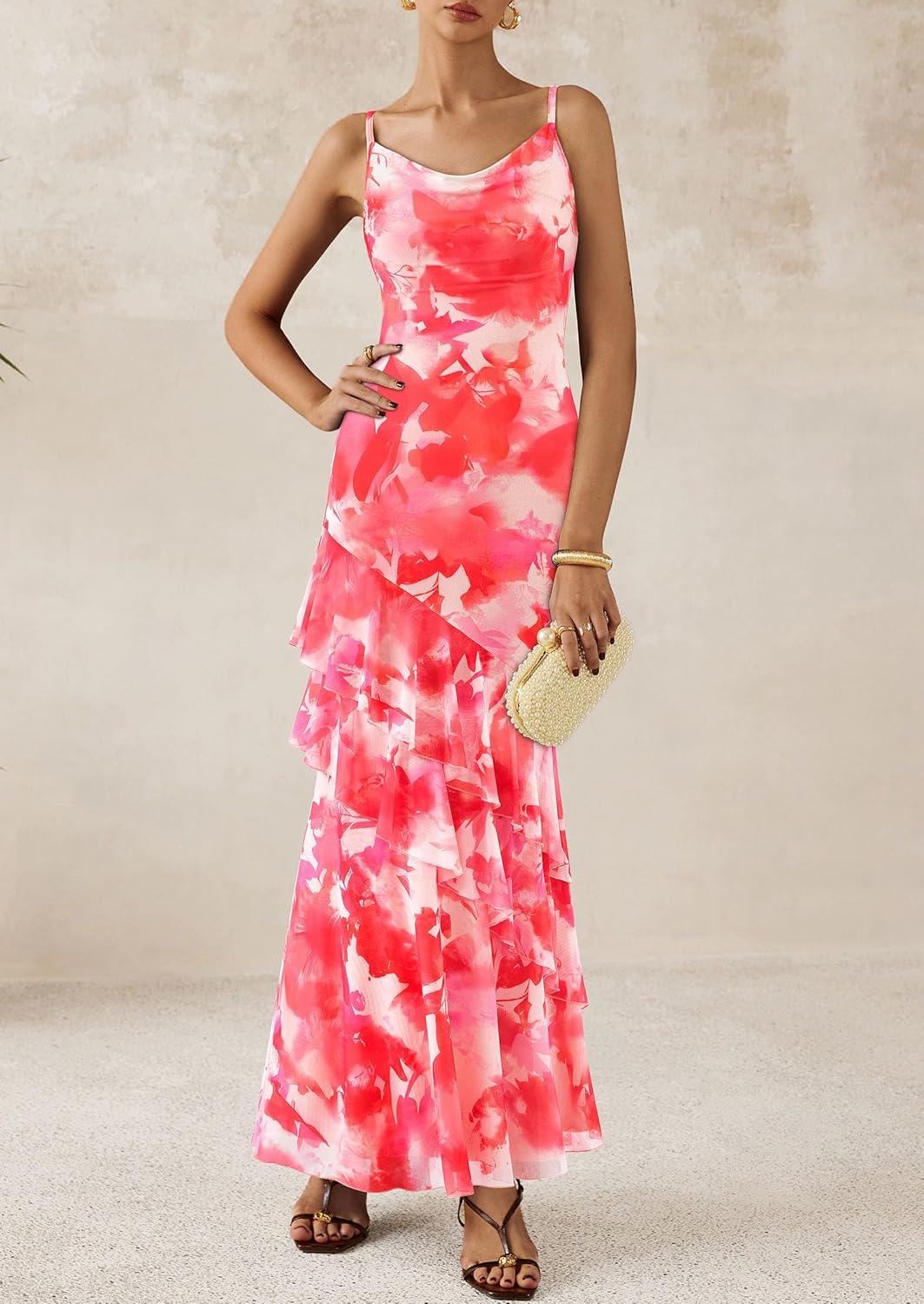 imagePRETTYGARDEN Maxi Dresses for Women 2025 Summer Tiered Floral Beach Sundress Spaghetti Strap Wedding Guest Long DressFloral Pink Red
