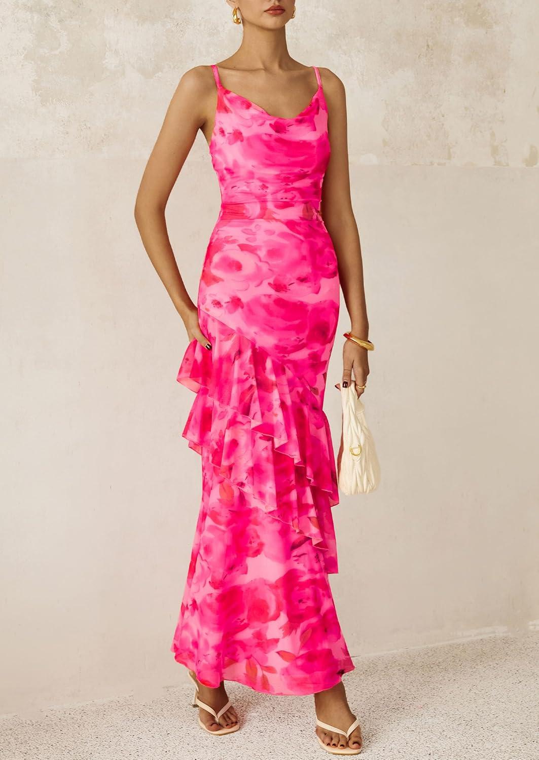 imagePRETTYGARDEN Maxi Dresses for Women 2025 Summer Tiered Floral Beach Sundress Spaghetti Strap Wedding Guest Long DressPrint Pink