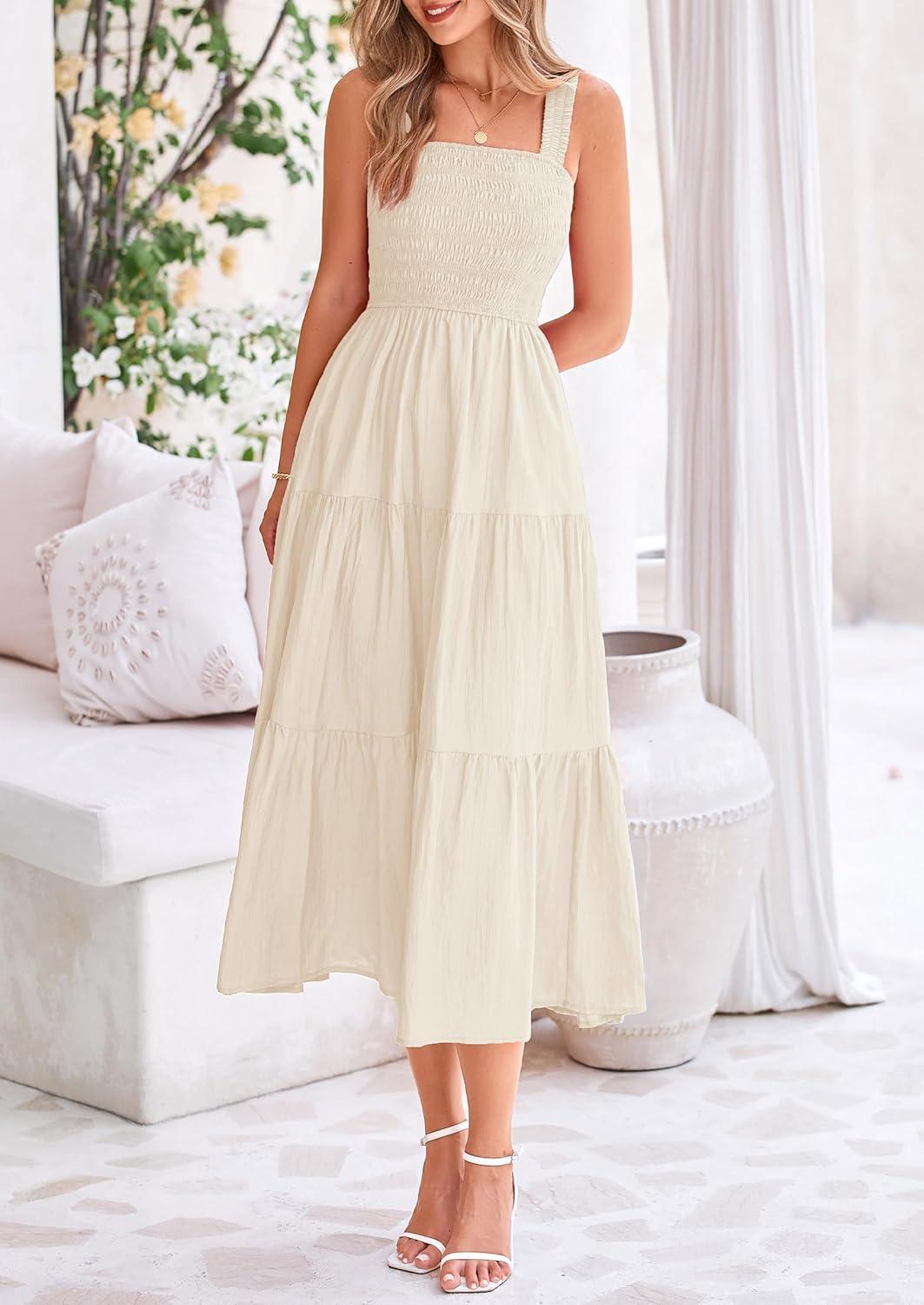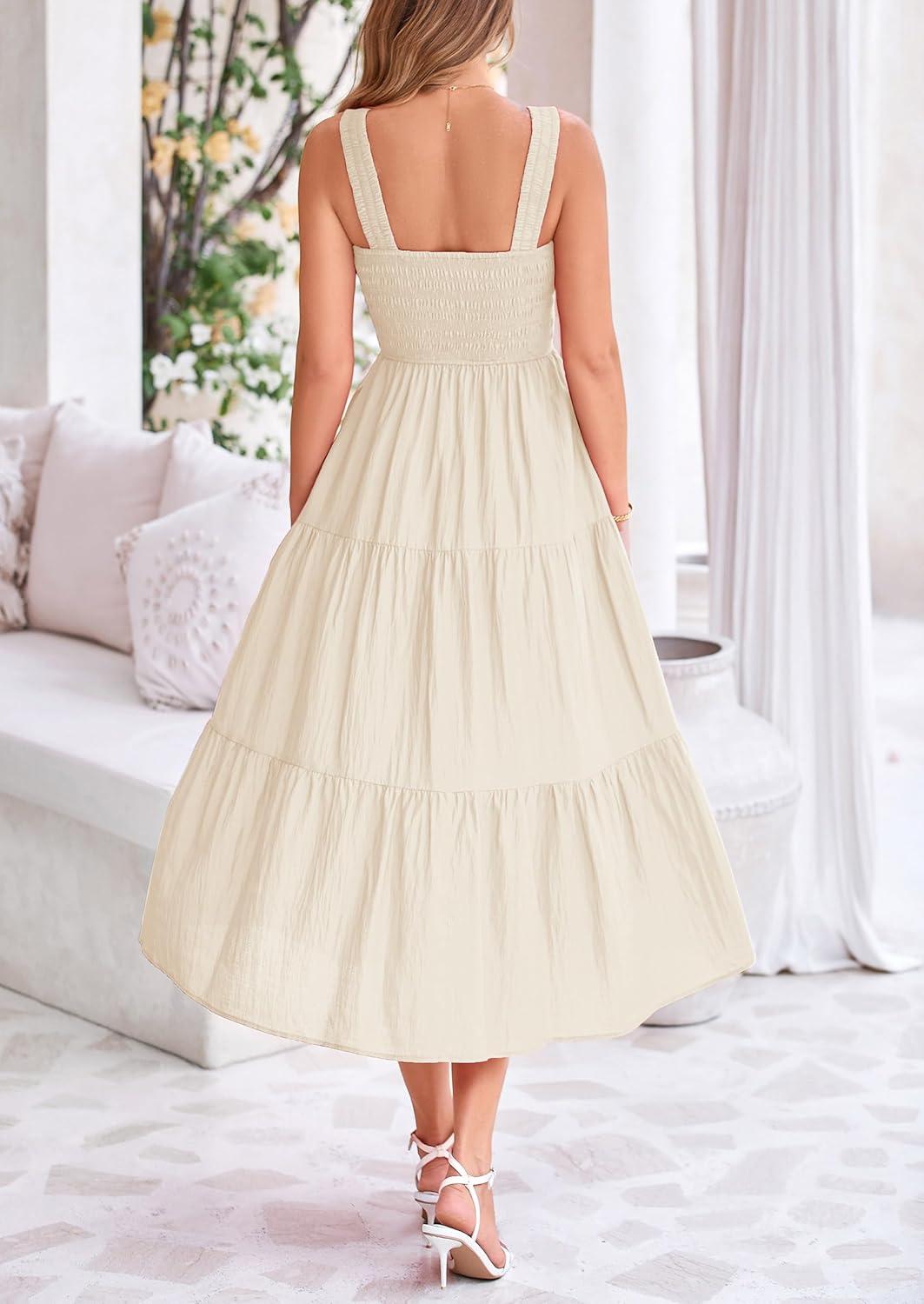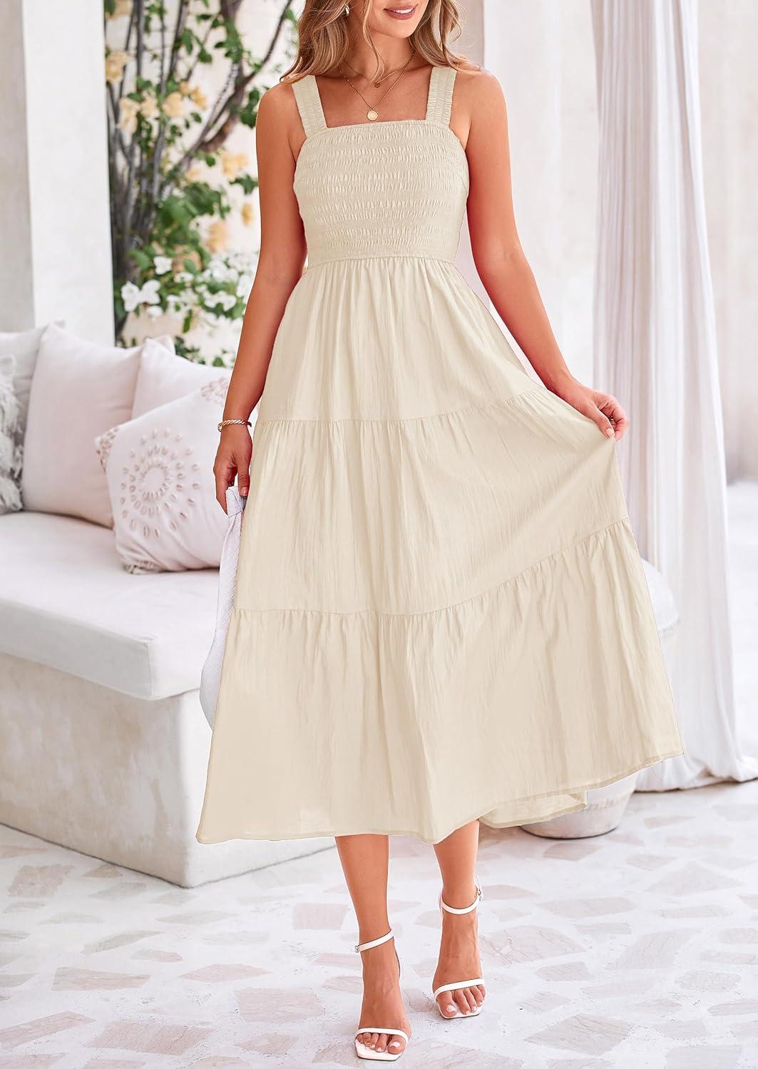 PRETTYGARDEN Midi Dress for Women 2025 Summer Smocked Ruffle A Line Long Flowy Dresses Cute Sleeveless Beach Sundress(Apricot)
