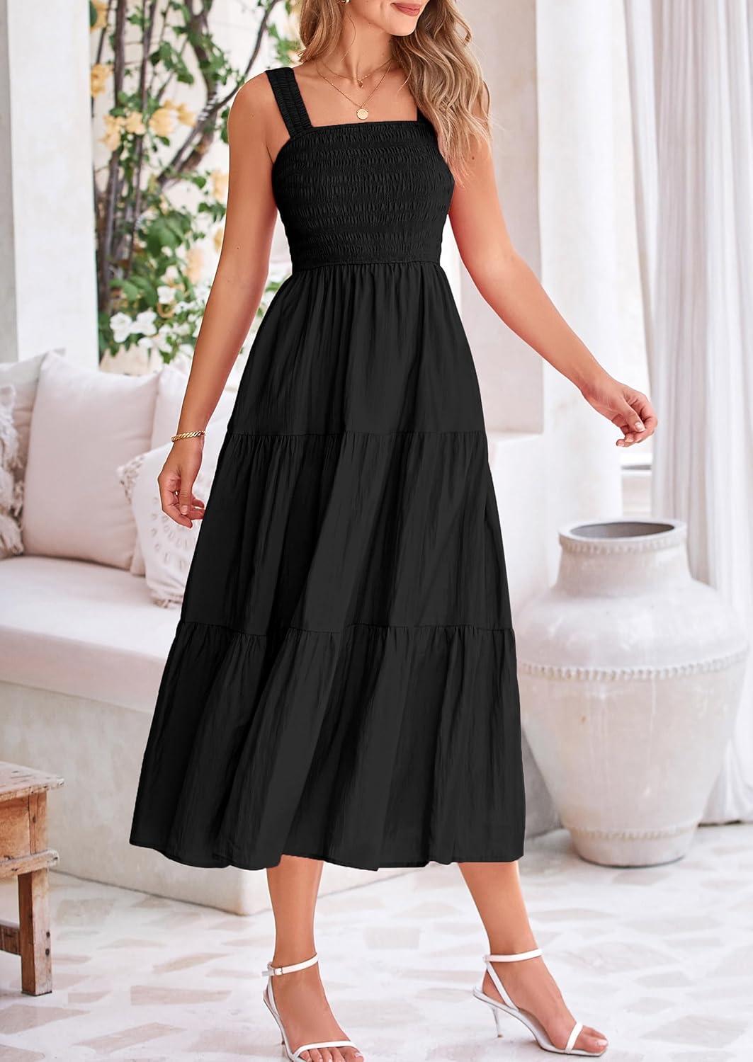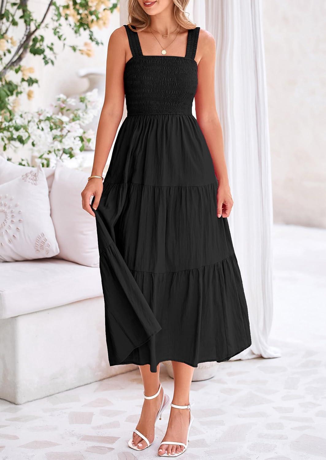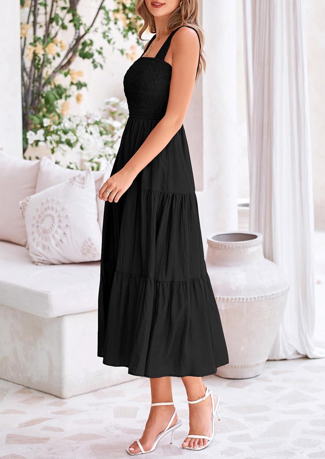 PRETTYGARDEN Midi Dress for Women 2025 Summer Smocked Ruffle A Line Long Flowy Dresses Cute Sleeveless Beach Sundress(Black)