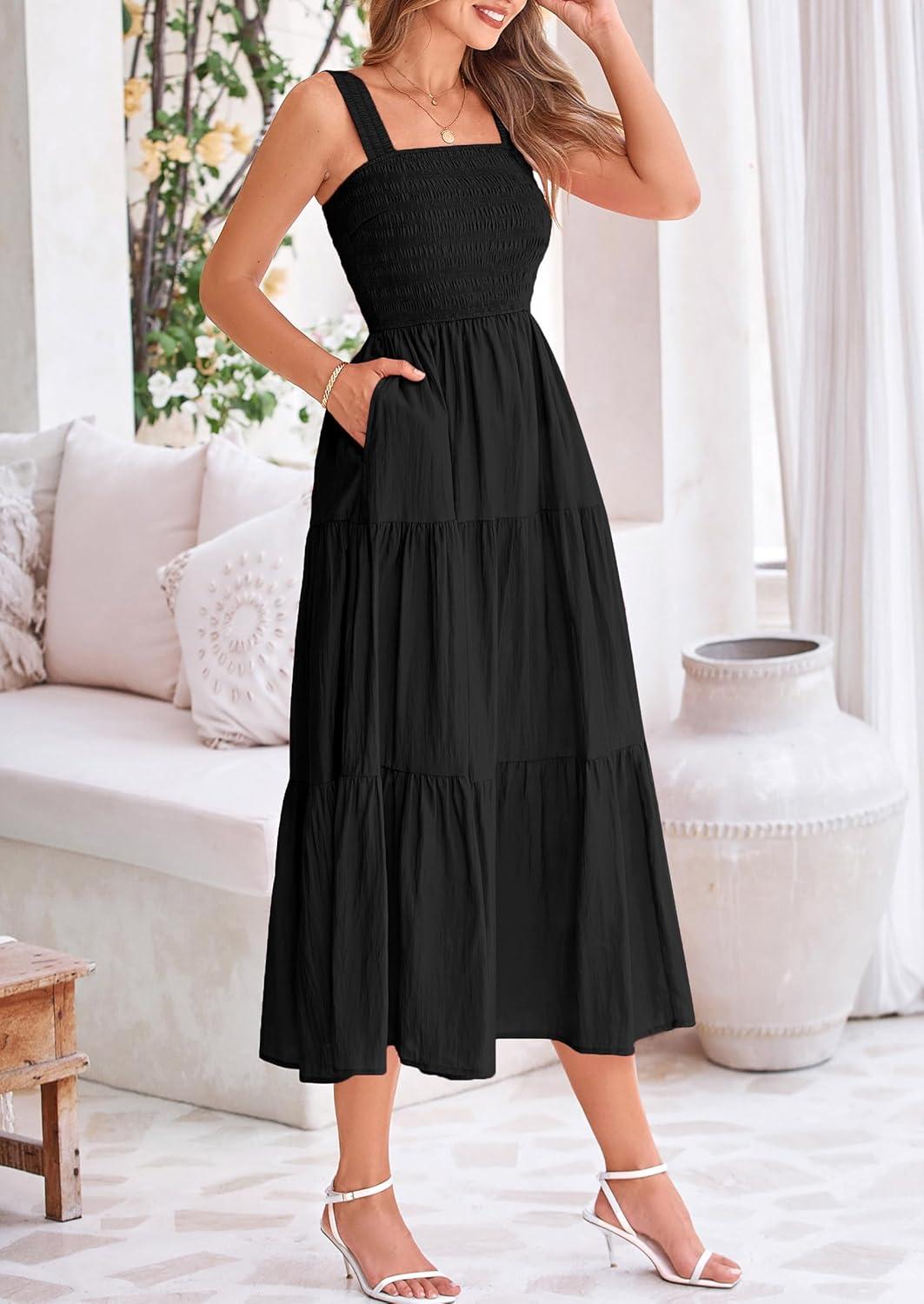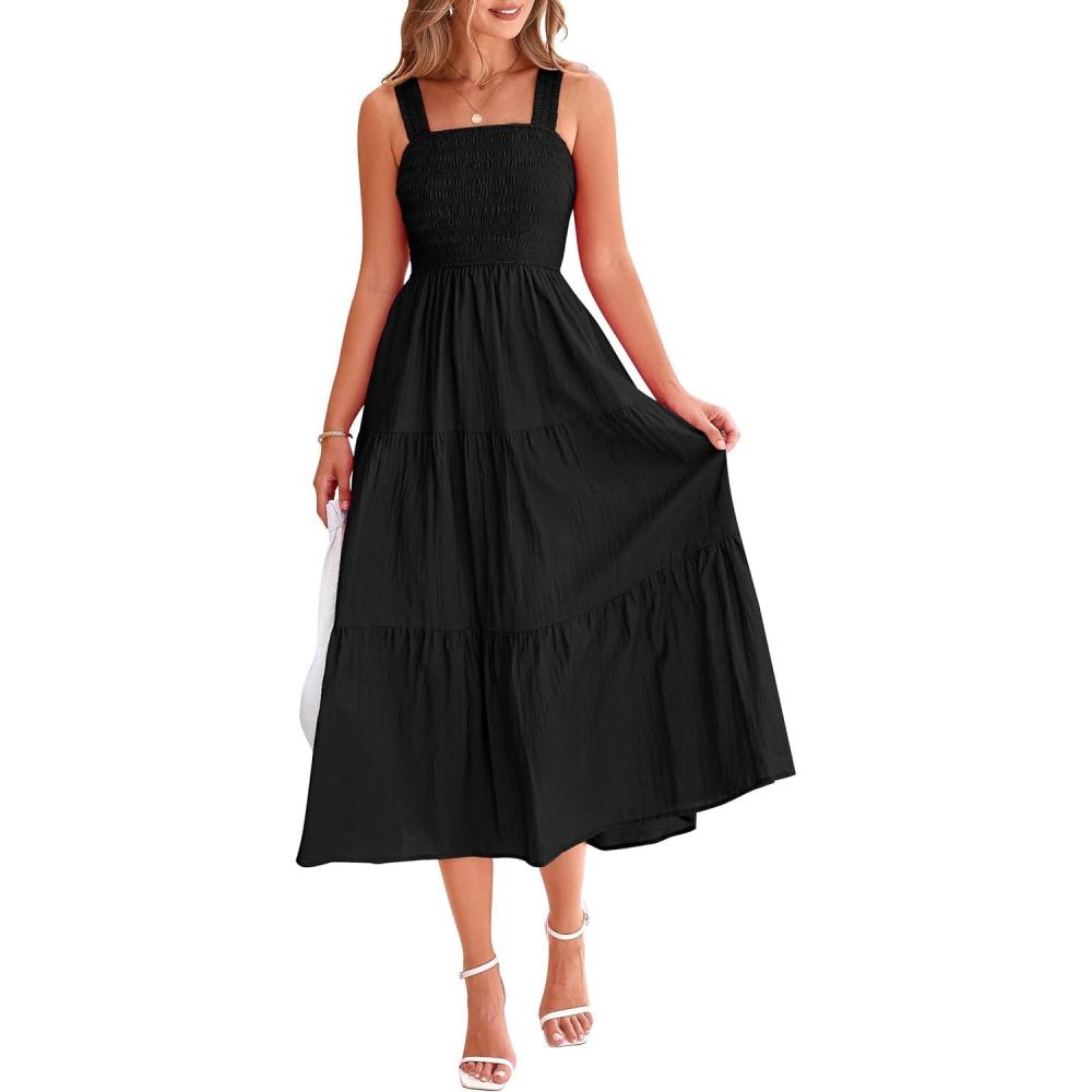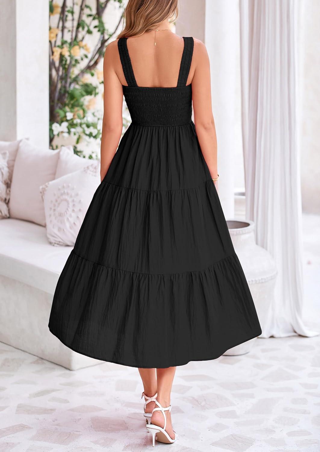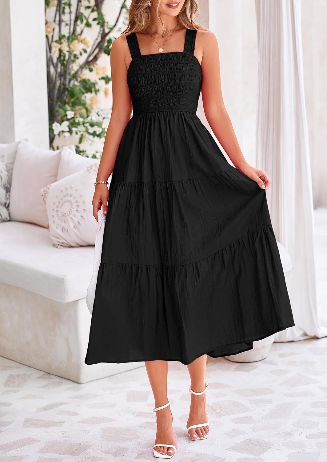 PRETTYGARDEN Midi Dress for Women 2025 Summer Smocked Ruffle A Line Long Flowy Dresses Cute Sleeveless Beach Sundress(Black)