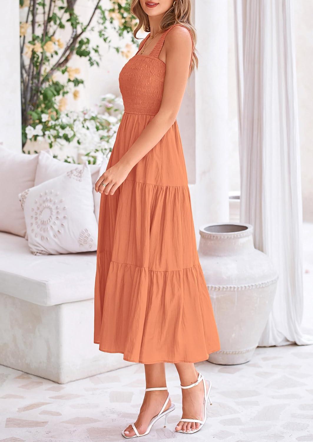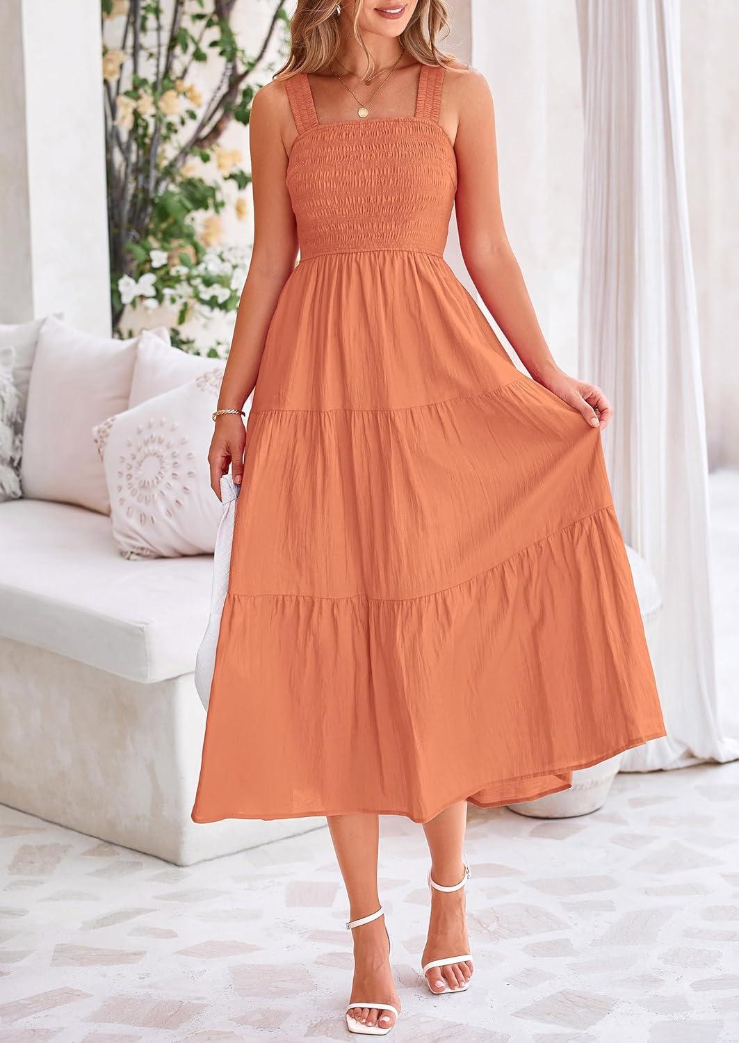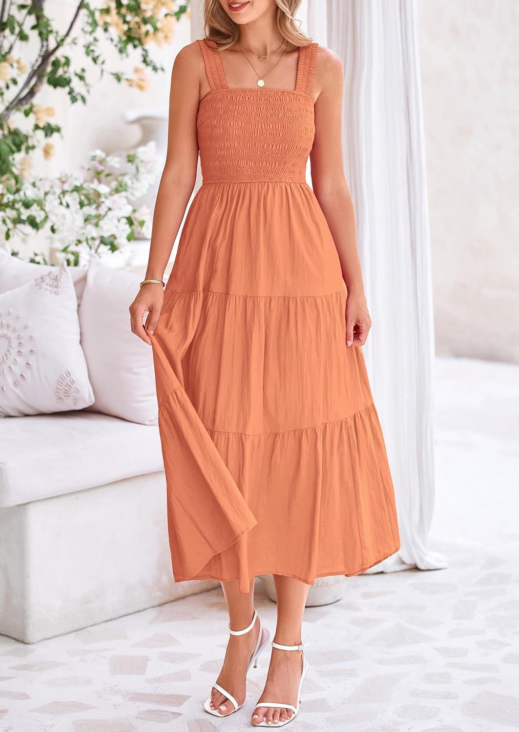 PRETTYGARDEN Midi Dress for Women 2025 Summer Smocked Ruffle A Line Long Flowy Dresses Cute Sleeveless Beach Sundress(Brown Orange)