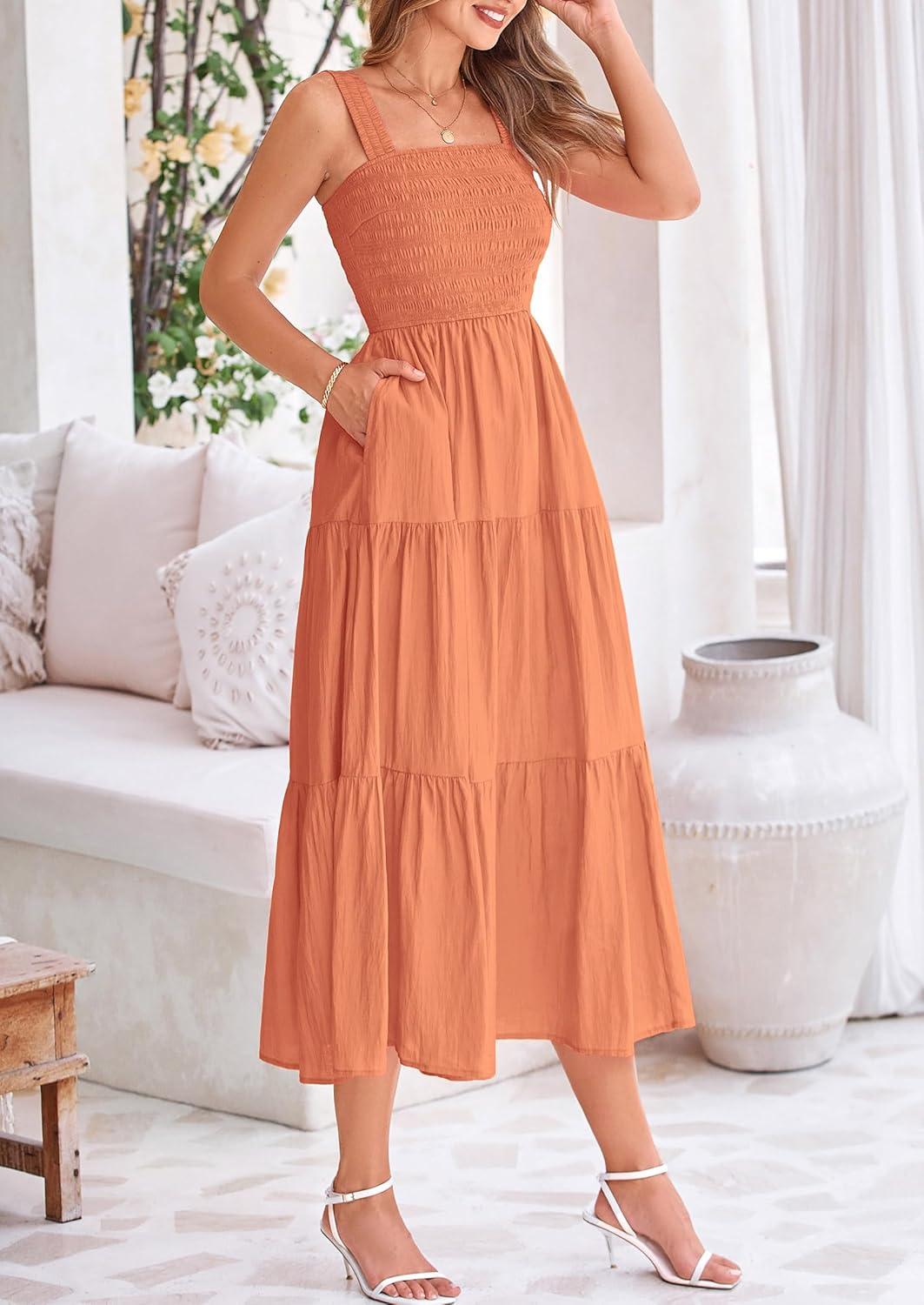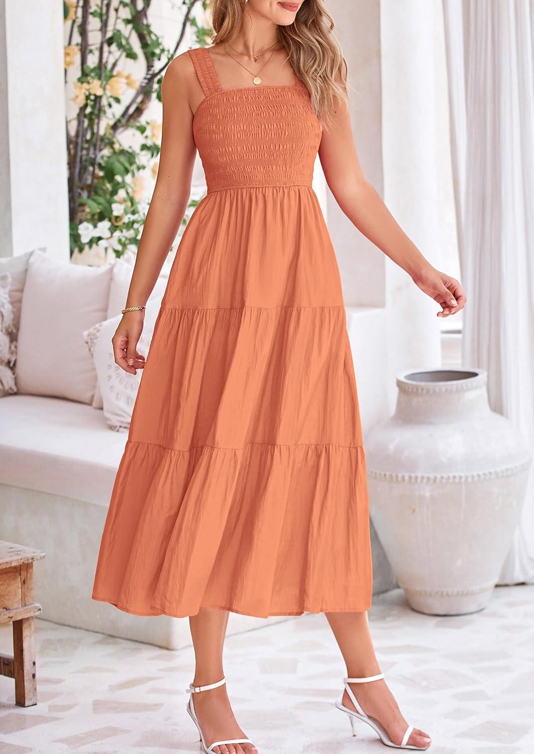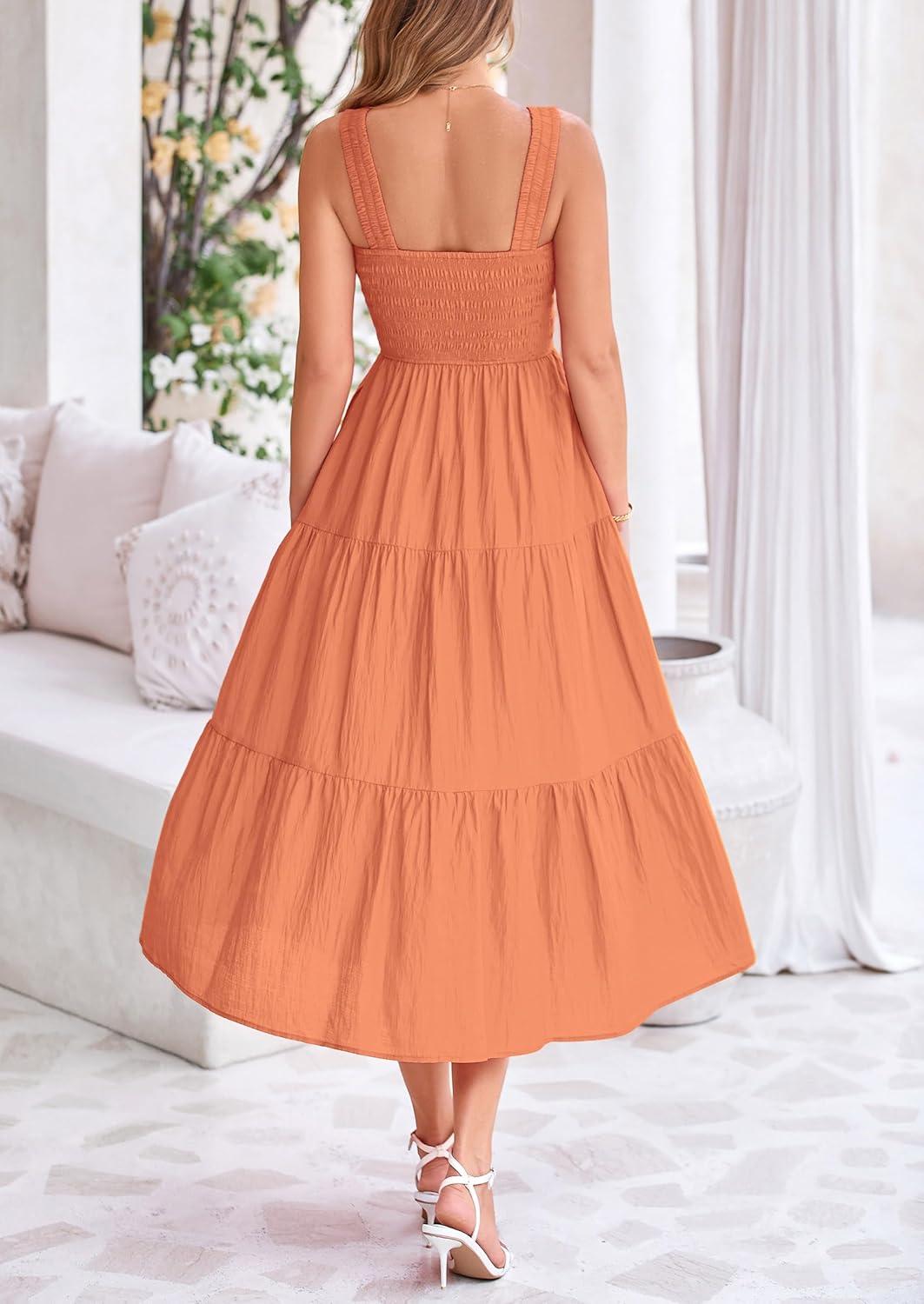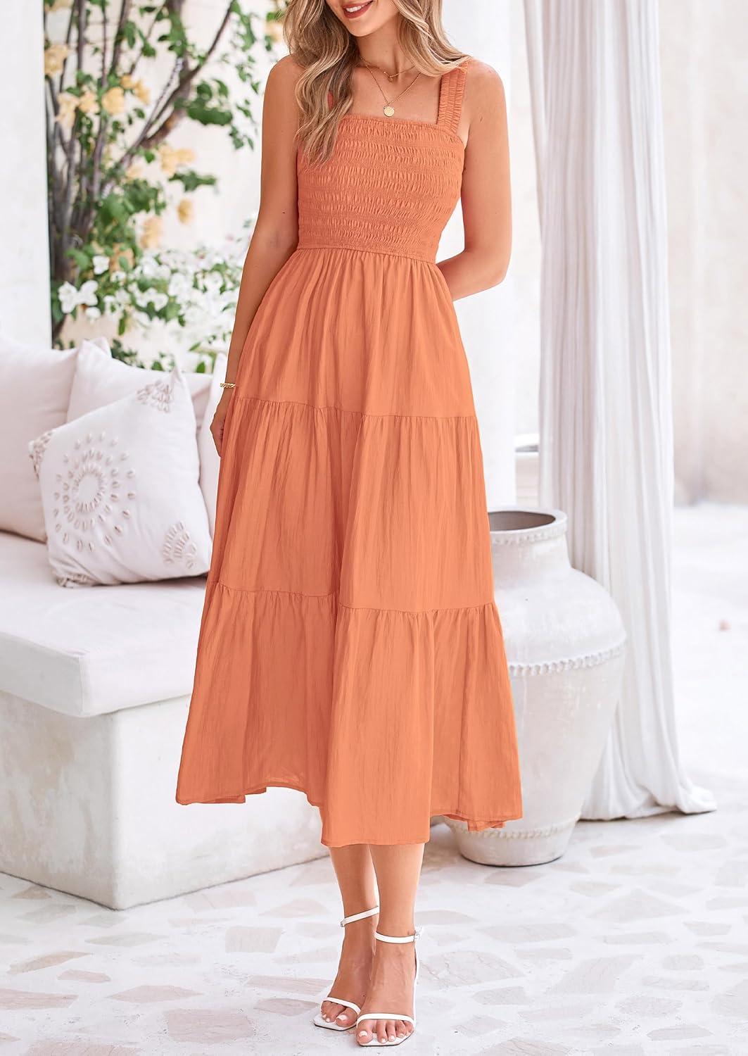 PRETTYGARDEN Midi Dress for Women 2025 Summer Smocked Ruffle A Line Long Flowy Dresses Cute Sleeveless Beach Sundress(Brown Orange)