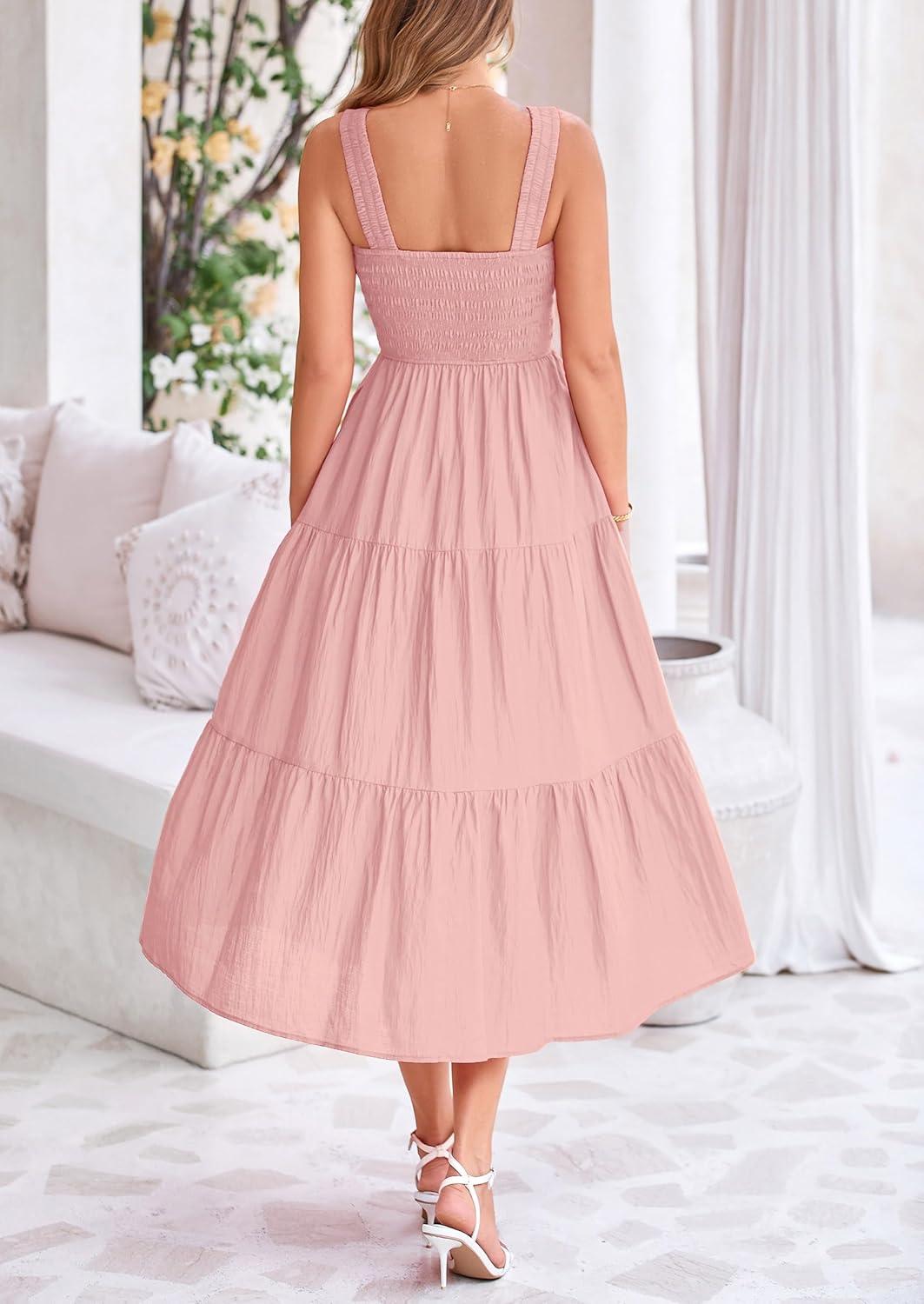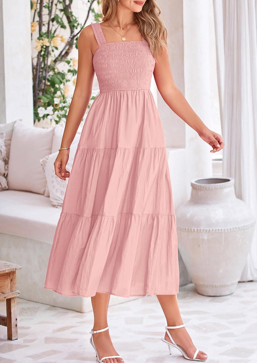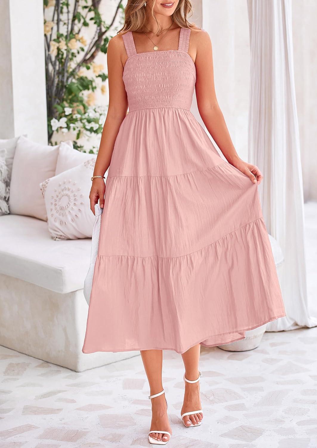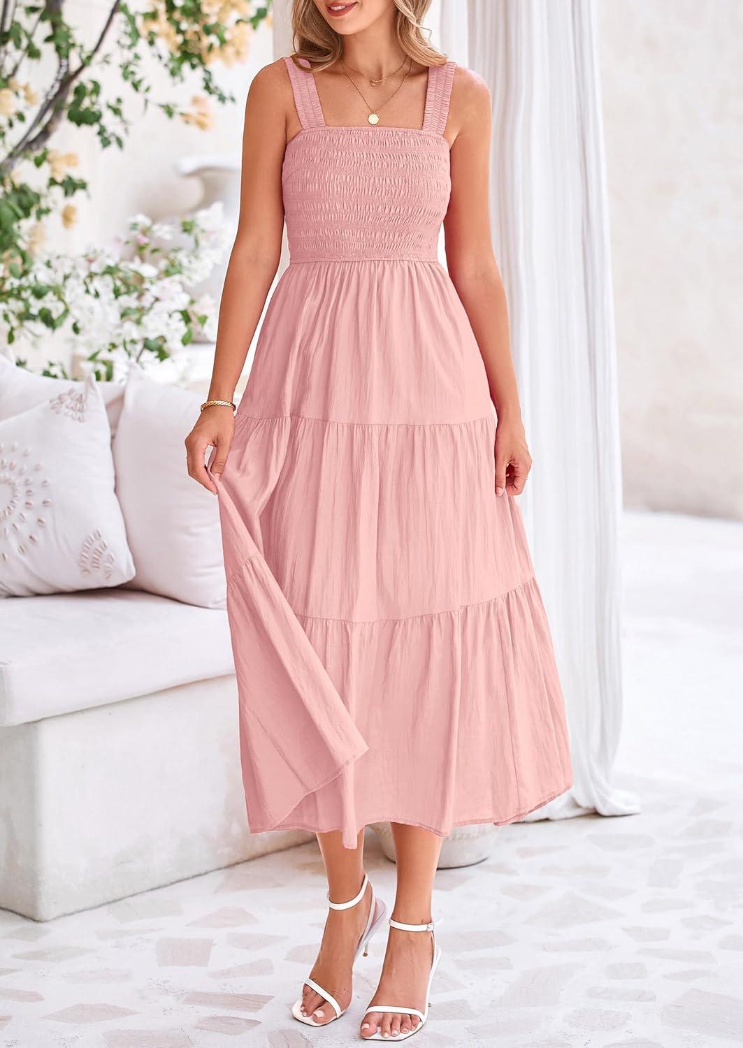 PRETTYGARDEN Midi Dress for Women 2025 Summer Smocked Ruffle A Line Long Flowy Dresses Cute Sleeveless Beach Sundress(Pink)
