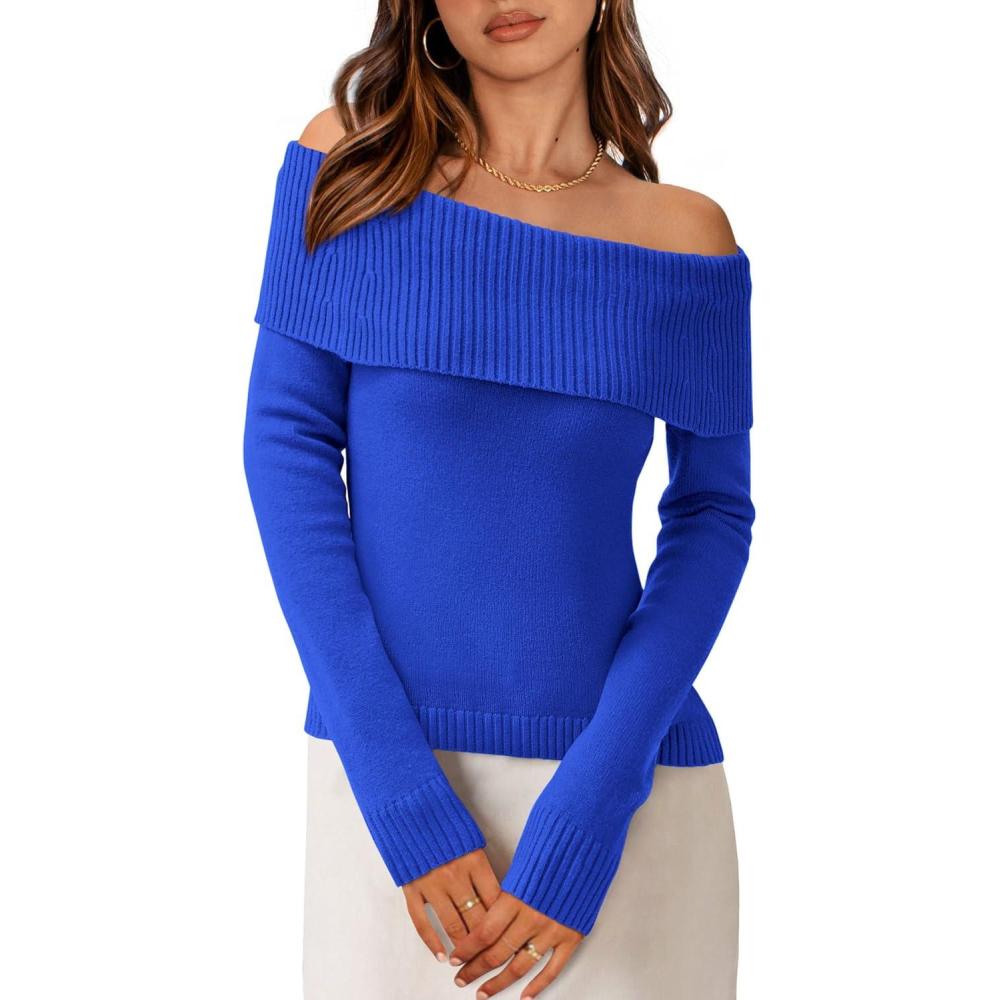 PRETTYGARDEN Off The Shoulder Sweater for Women 2025 Fall Fashion Cute Long Sleeve Tops Winter Ribbed Pullover Knit Outfits(Blue)