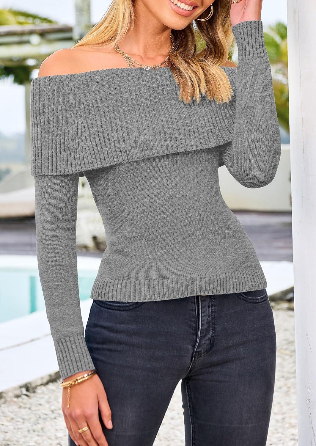 imagePRETTYGARDEN Off The Shoulder Sweater for Women 2025 Fall Fashion Cute Long Sleeve Tops Winter Ribbed Pullover Knit OutfitsGrey