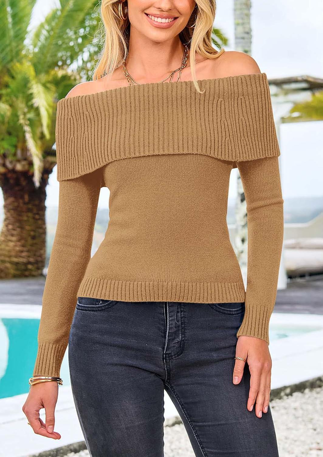 imagePRETTYGARDEN Off The Shoulder Sweater for Women 2025 Fall Fashion Cute Long Sleeve Tops Winter Ribbed Pullover Knit OutfitsKhaki