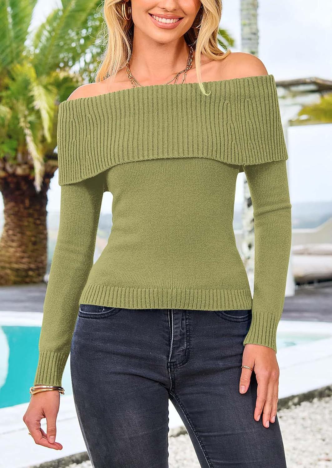 PRETTYGARDEN Off The Shoulder Sweater for Women 2025 Fall Fashion Cute Long Sleeve Tops Winter Ribbed Pullover Knit Outfits(Wood Green)