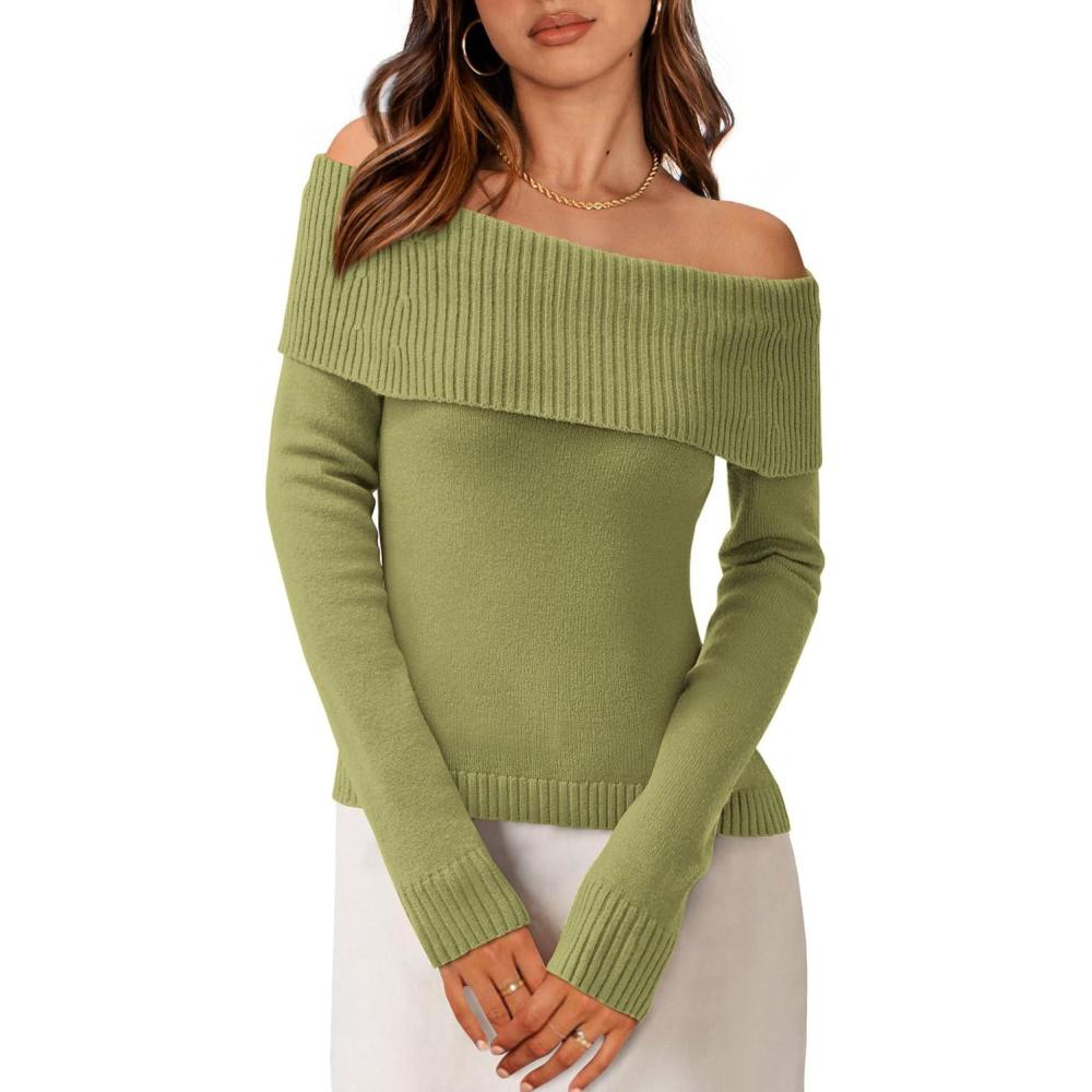 imagePRETTYGARDEN Off The Shoulder Sweater for Women 2025 Fall Fashion Cute Long Sleeve Tops Winter Ribbed Pullover Knit OutfitsSage Green