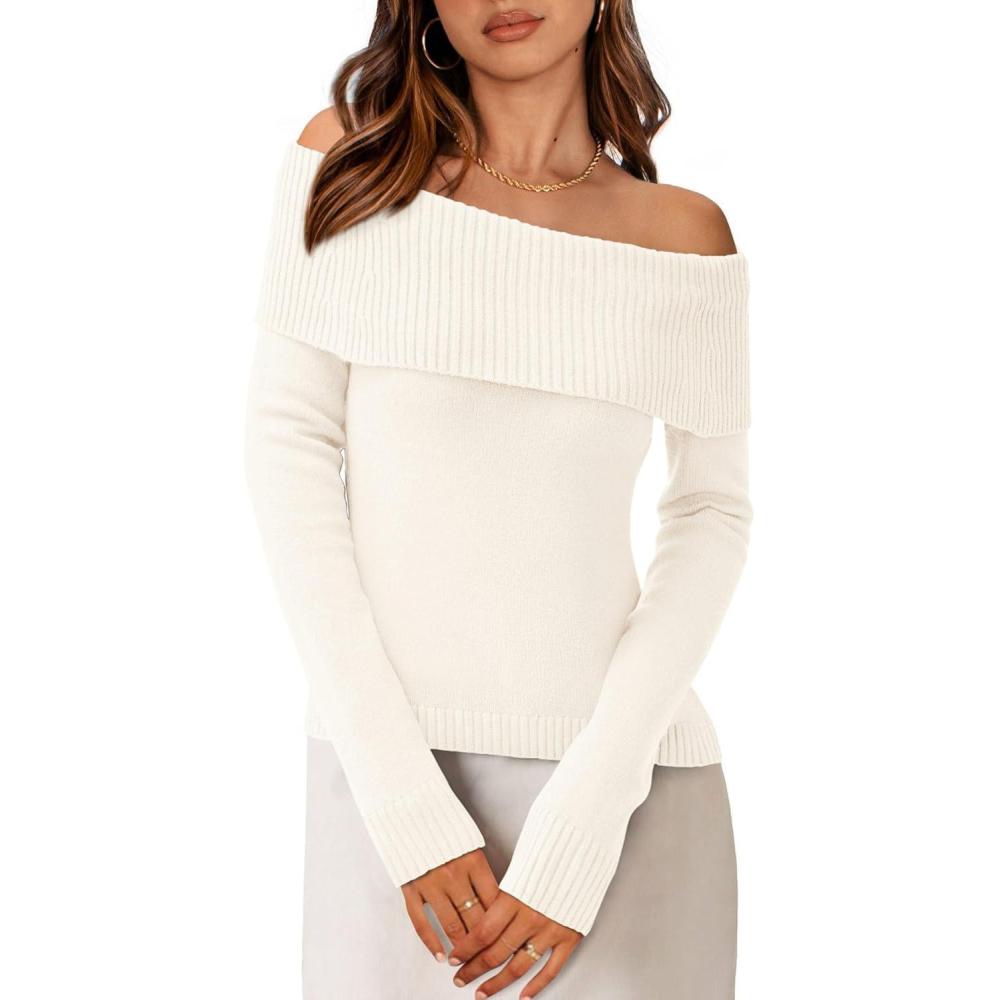 imagePRETTYGARDEN Off The Shoulder Sweater for Women 2025 Fall Fashion Cute Long Sleeve Tops Winter Ribbed Pullover Knit OutfitsWhite
