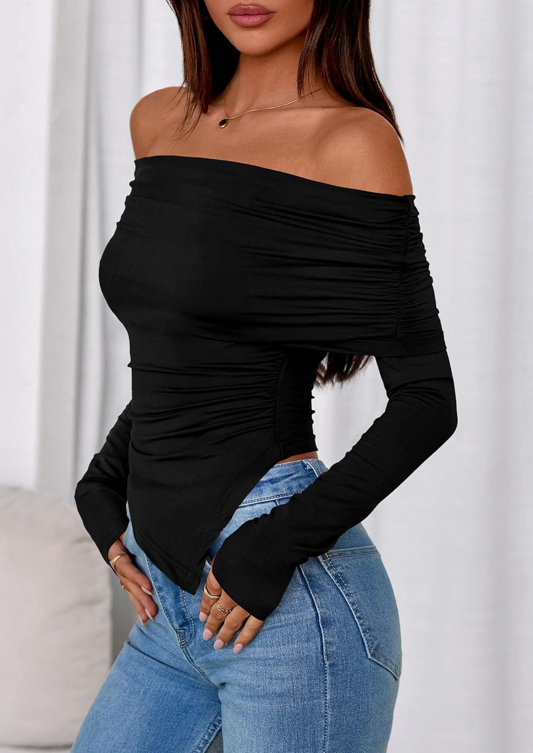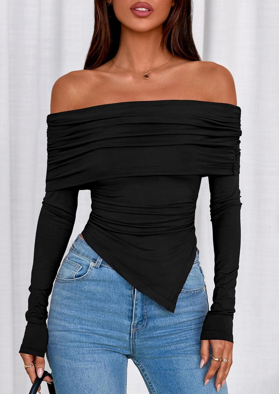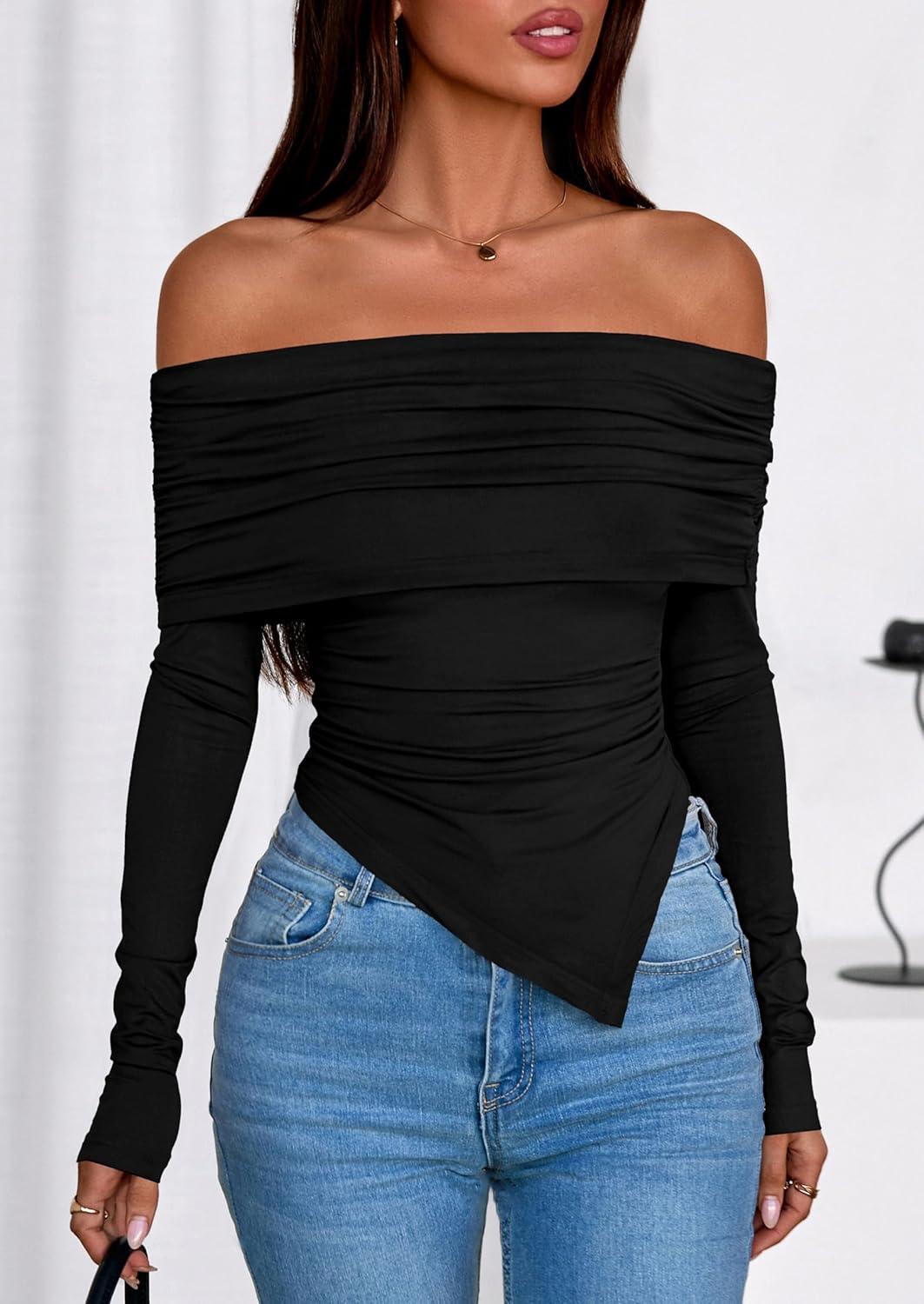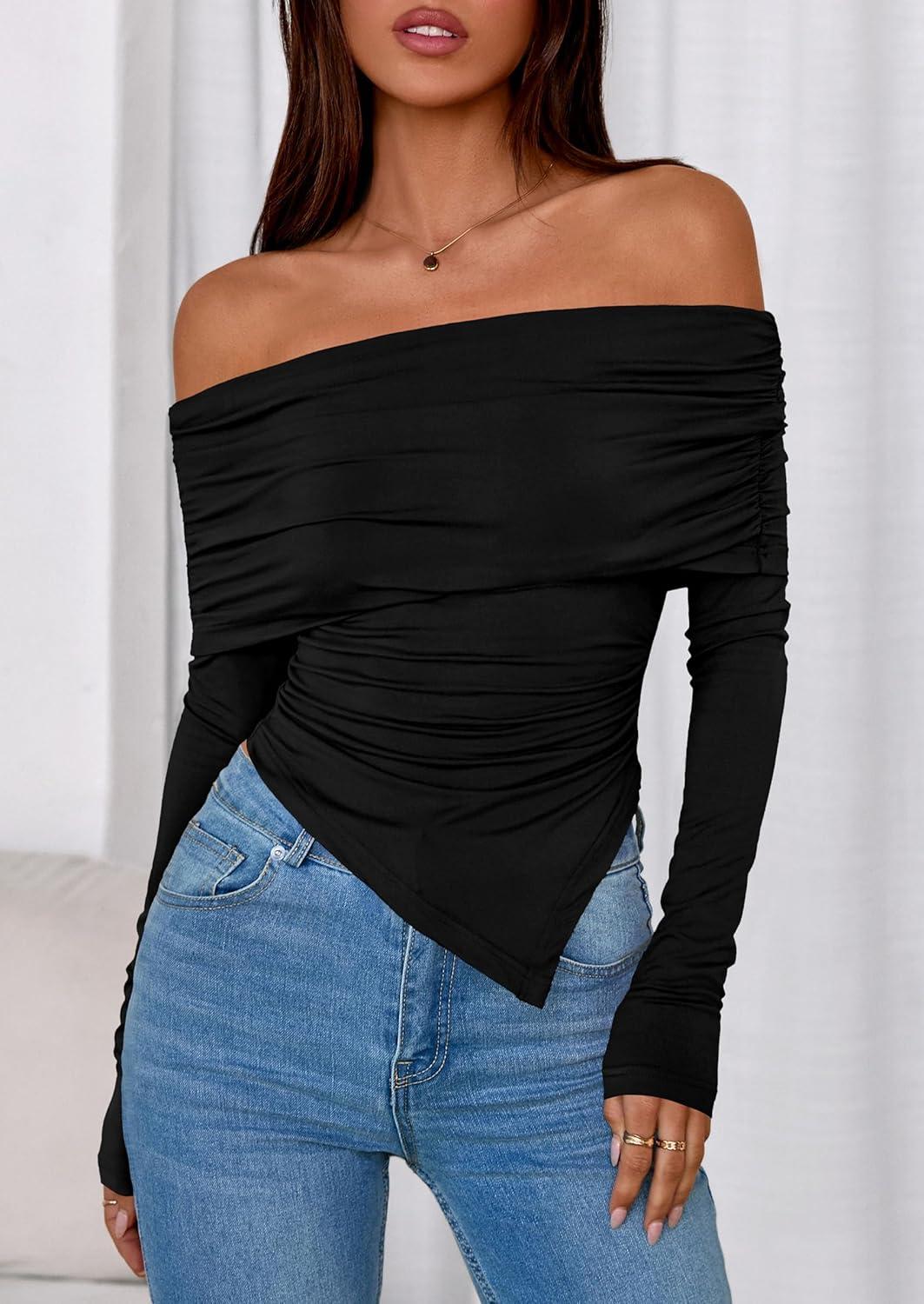 PRETTYGARDEN Off The Shoulder Tops for Women Fall Fashion 2025 Long Sleeve Shirts Going Out Slim Fitted Blouses Y2K Clothes(Black)
