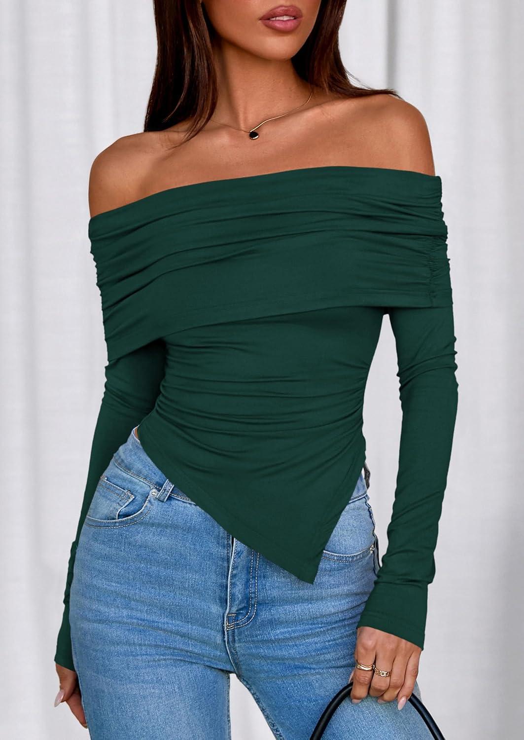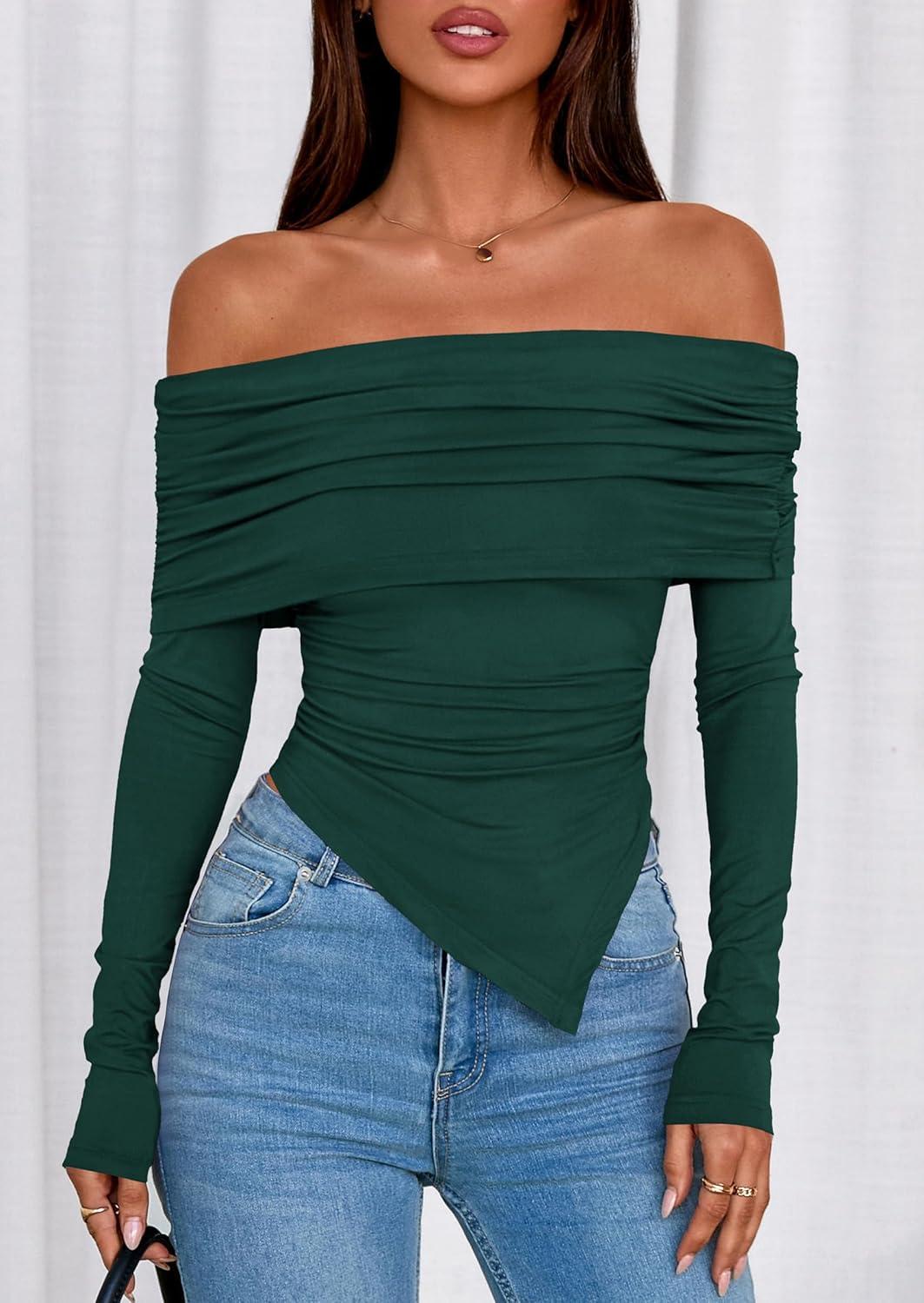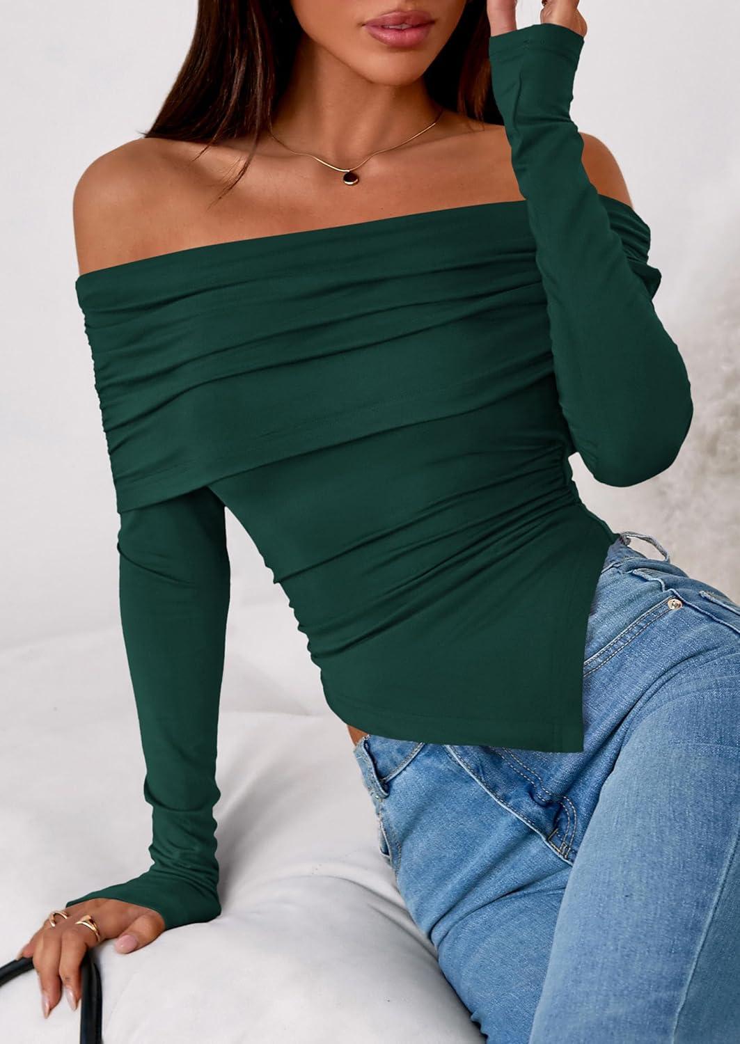 PRETTYGARDEN Off The Shoulder Tops for Women Fall Fashion 2025 Long Sleeve Shirts Going Out Slim Fitted Blouses Y2K Clothes(Green)