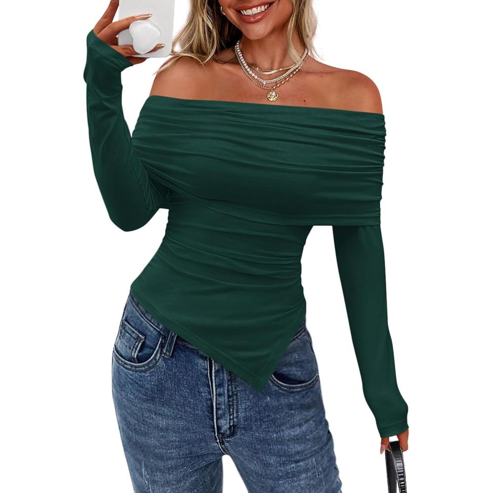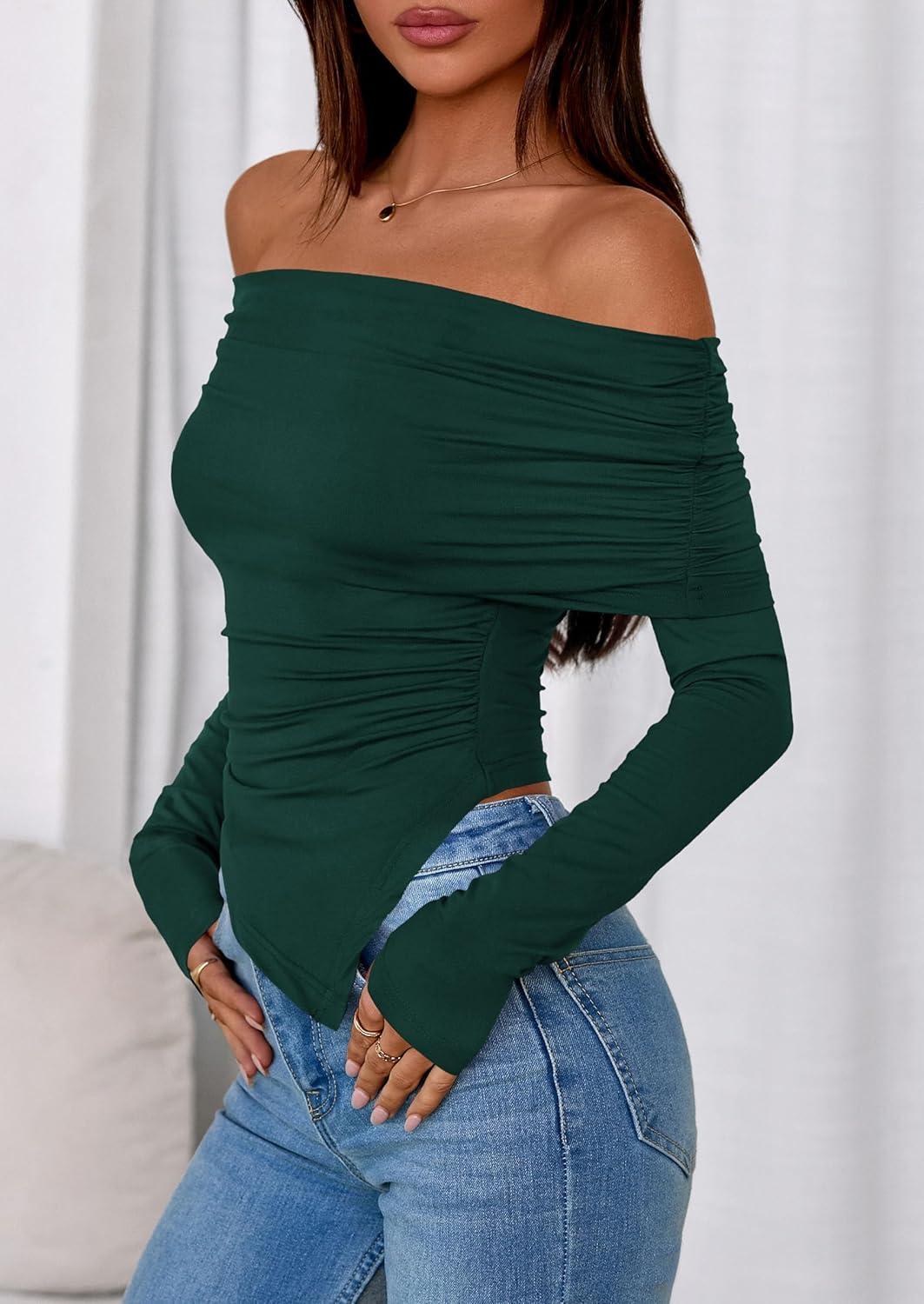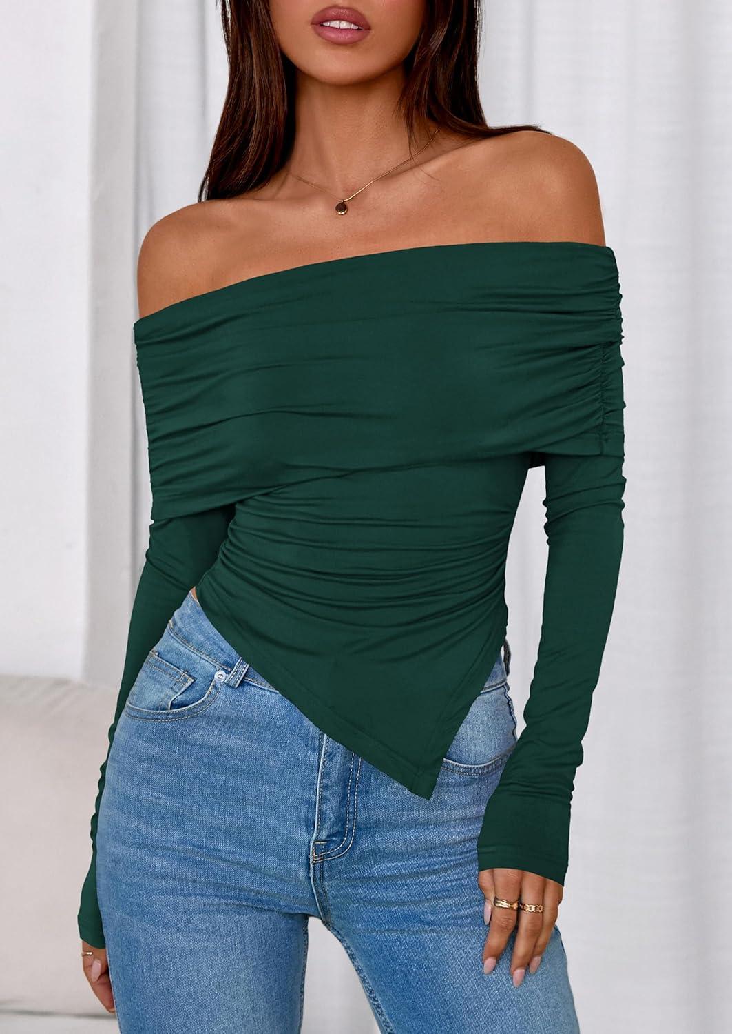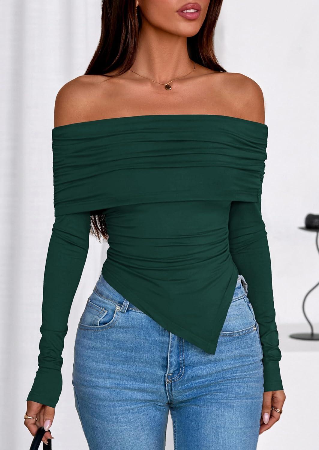 PRETTYGARDEN Off The Shoulder Tops for Women Fall Fashion 2025 Long Sleeve Shirts Going Out Slim Fitted Blouses Y2K Clothes(Green)