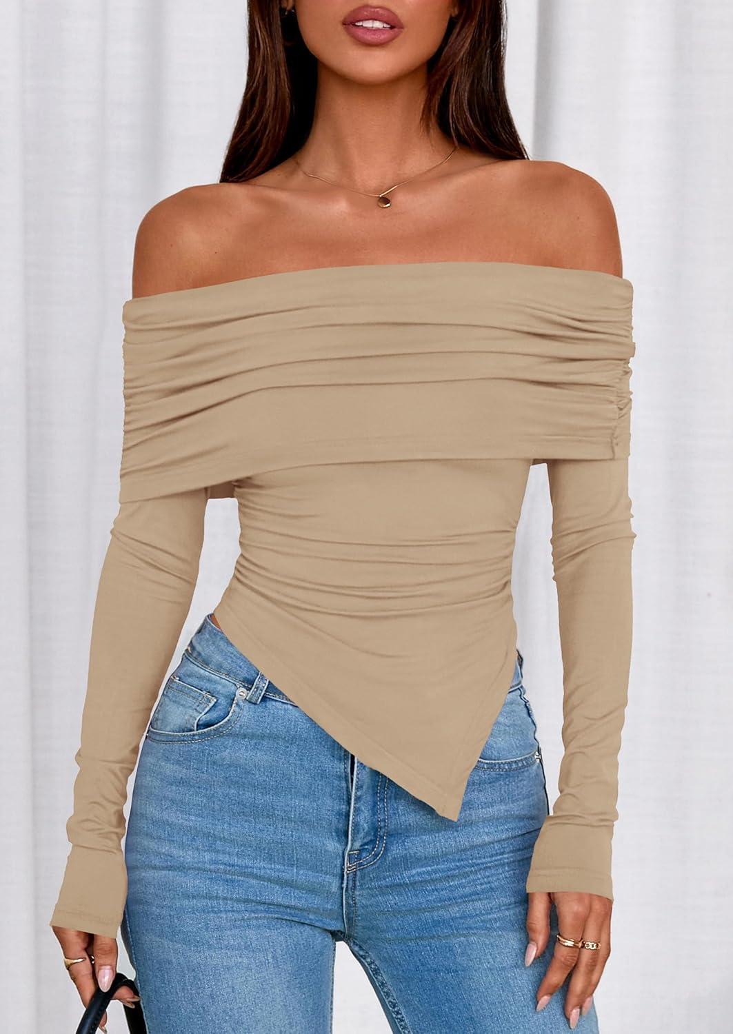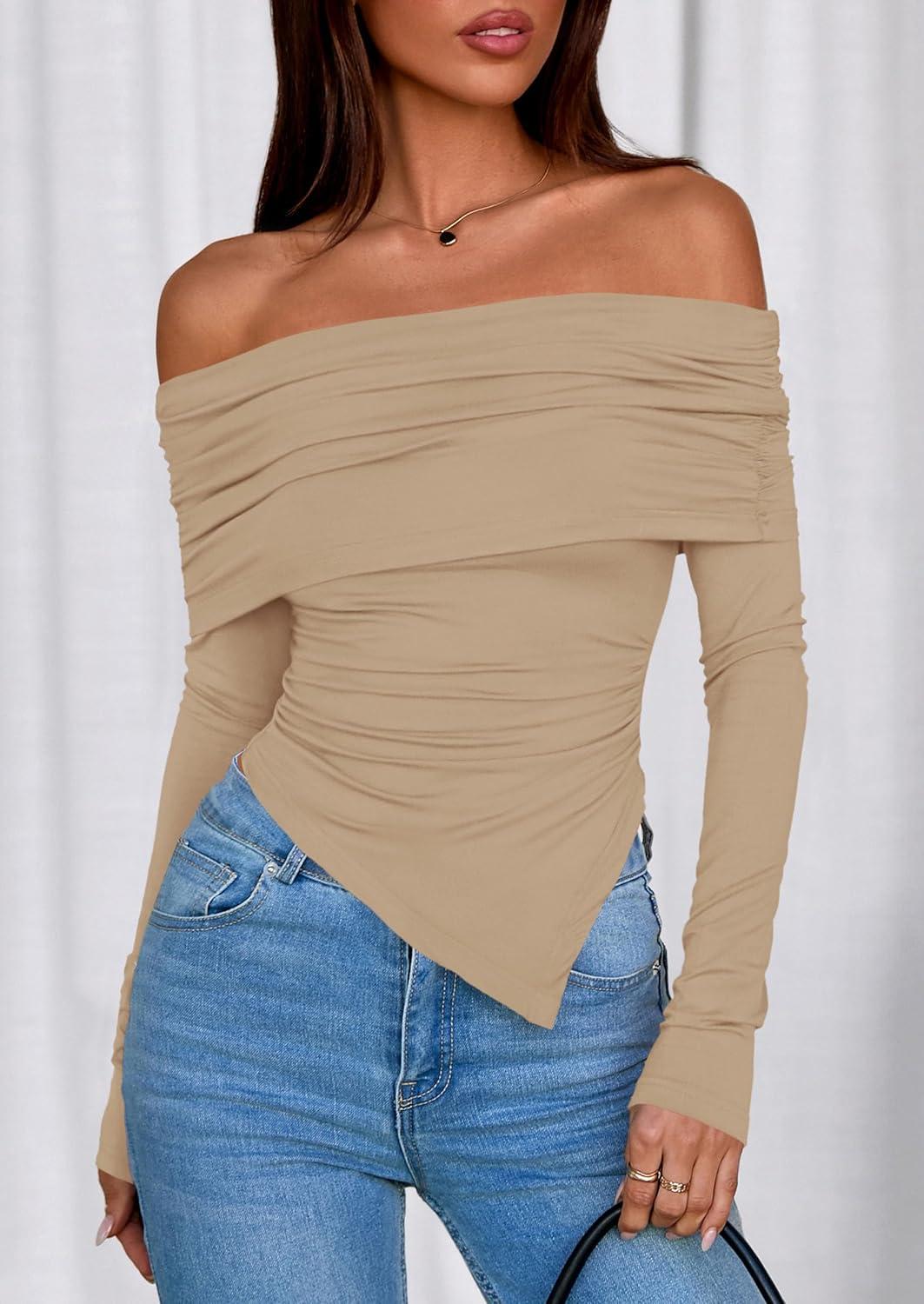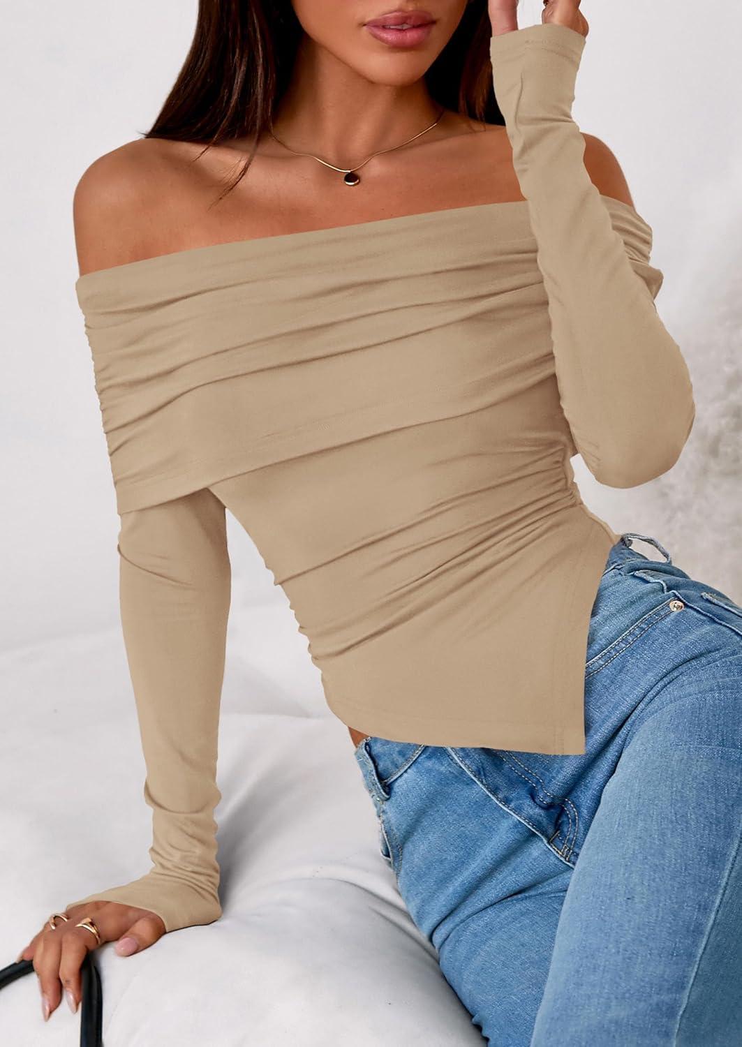 PRETTYGARDEN Off The Shoulder Tops for Women Fall Fashion 2025 Long Sleeve Shirts Going Out Slim Fitted Blouses Y2K Clothes(Khaki)