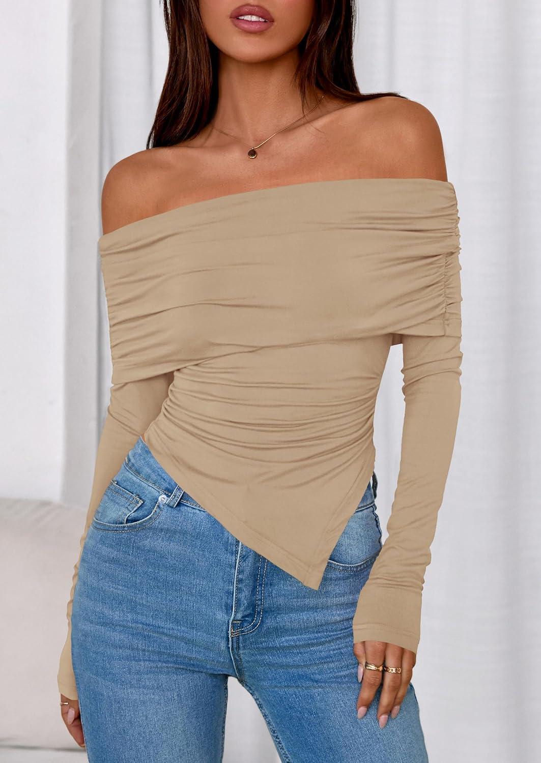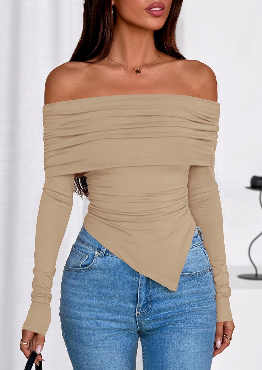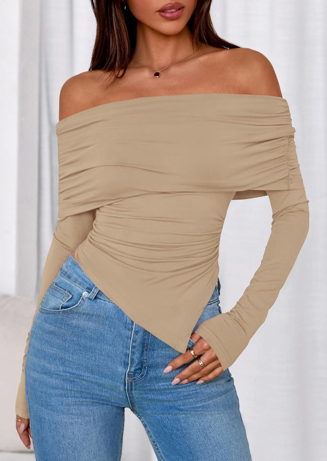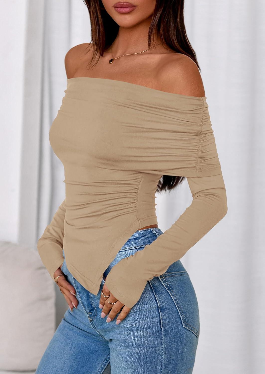 PRETTYGARDEN Off The Shoulder Tops for Women Fall Fashion 2025 Long Sleeve Shirts Going Out Slim Fitted Blouses Y2K Clothes(Khaki)
