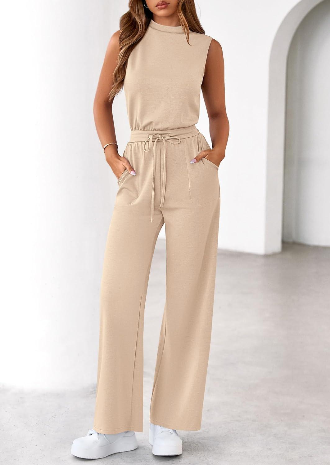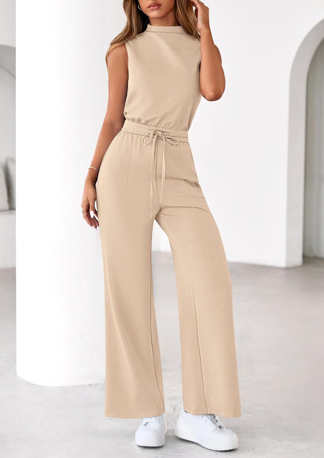 PRETTYGARDEN One Piece Jumpsuits for Women Dressy Summer Business Casual Outifts Sleeveless Mock Neck Wide Leg Rompers(Beige)