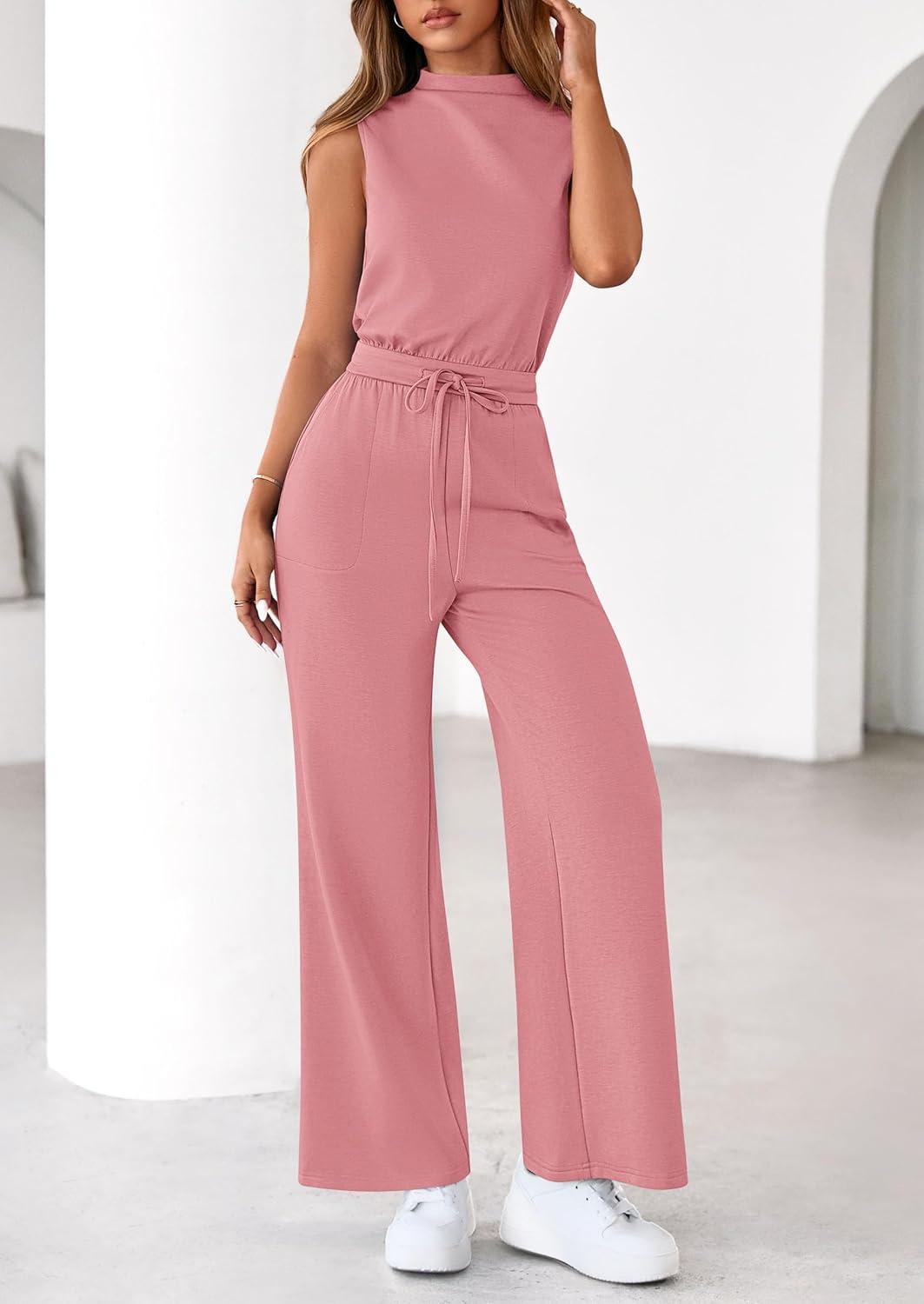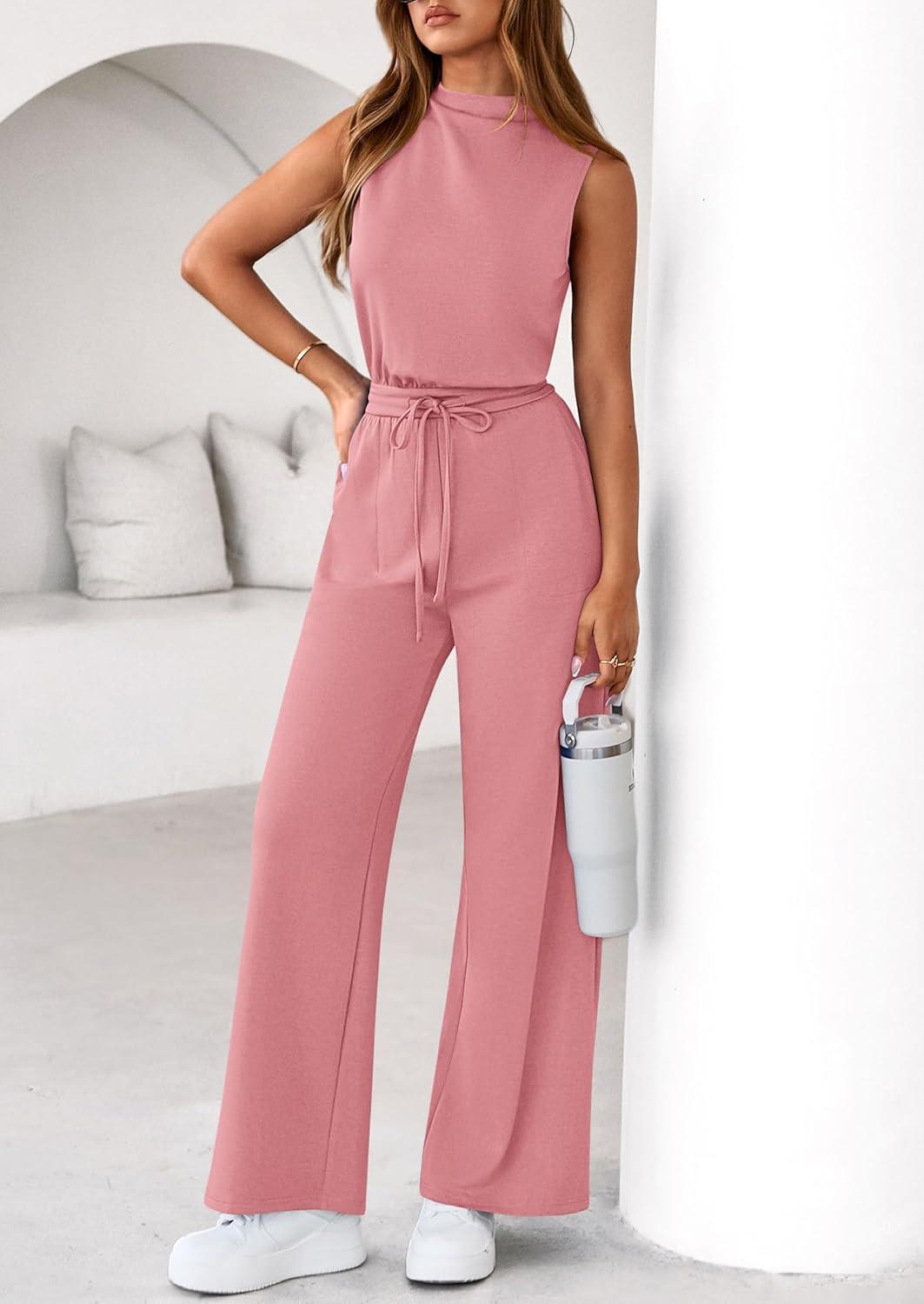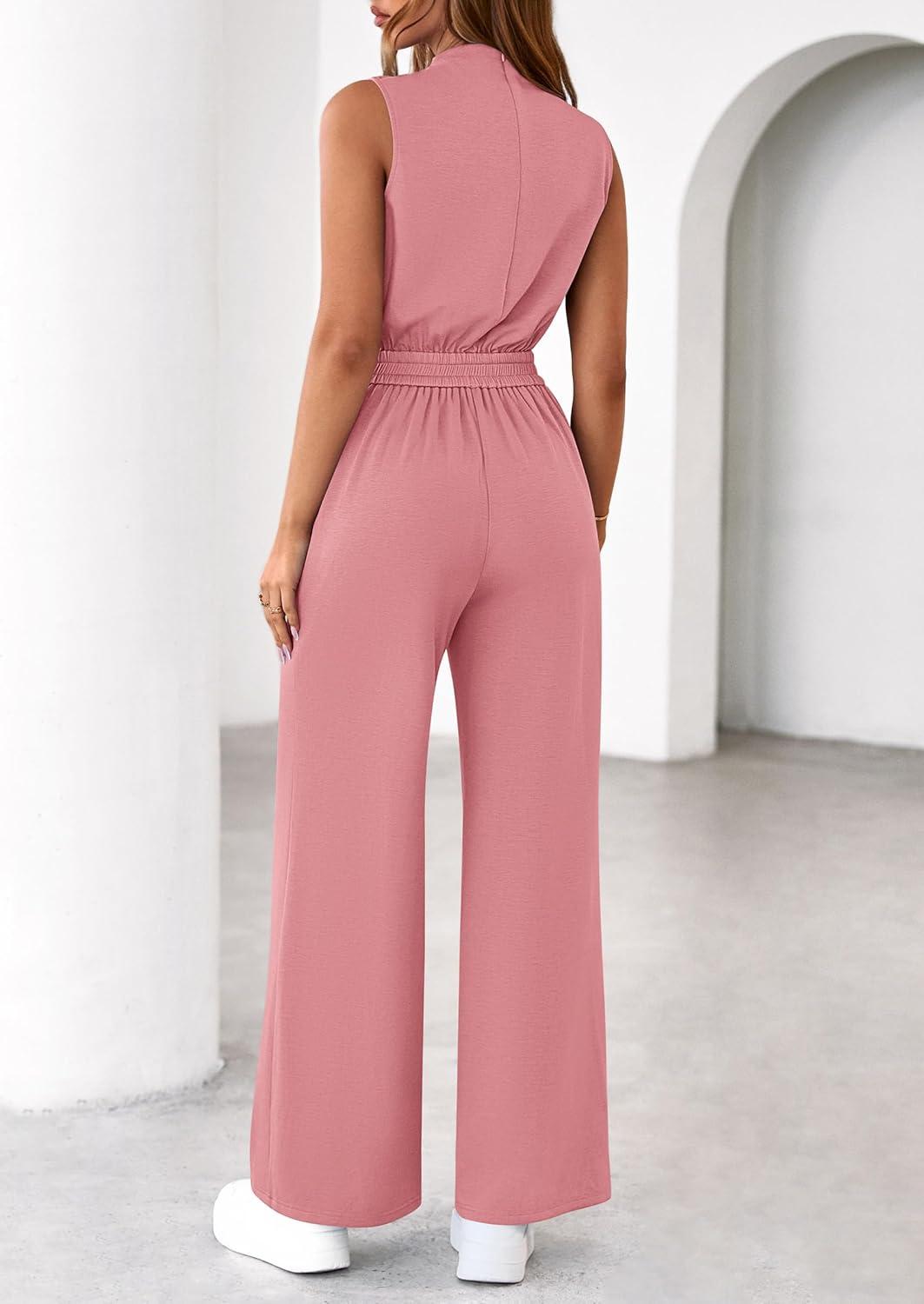 PRETTYGARDEN One Piece Jumpsuits for Women Dressy Summer Business Casual Outifts Sleeveless Mock Neck Wide Leg Rompers(Dusty Pink)