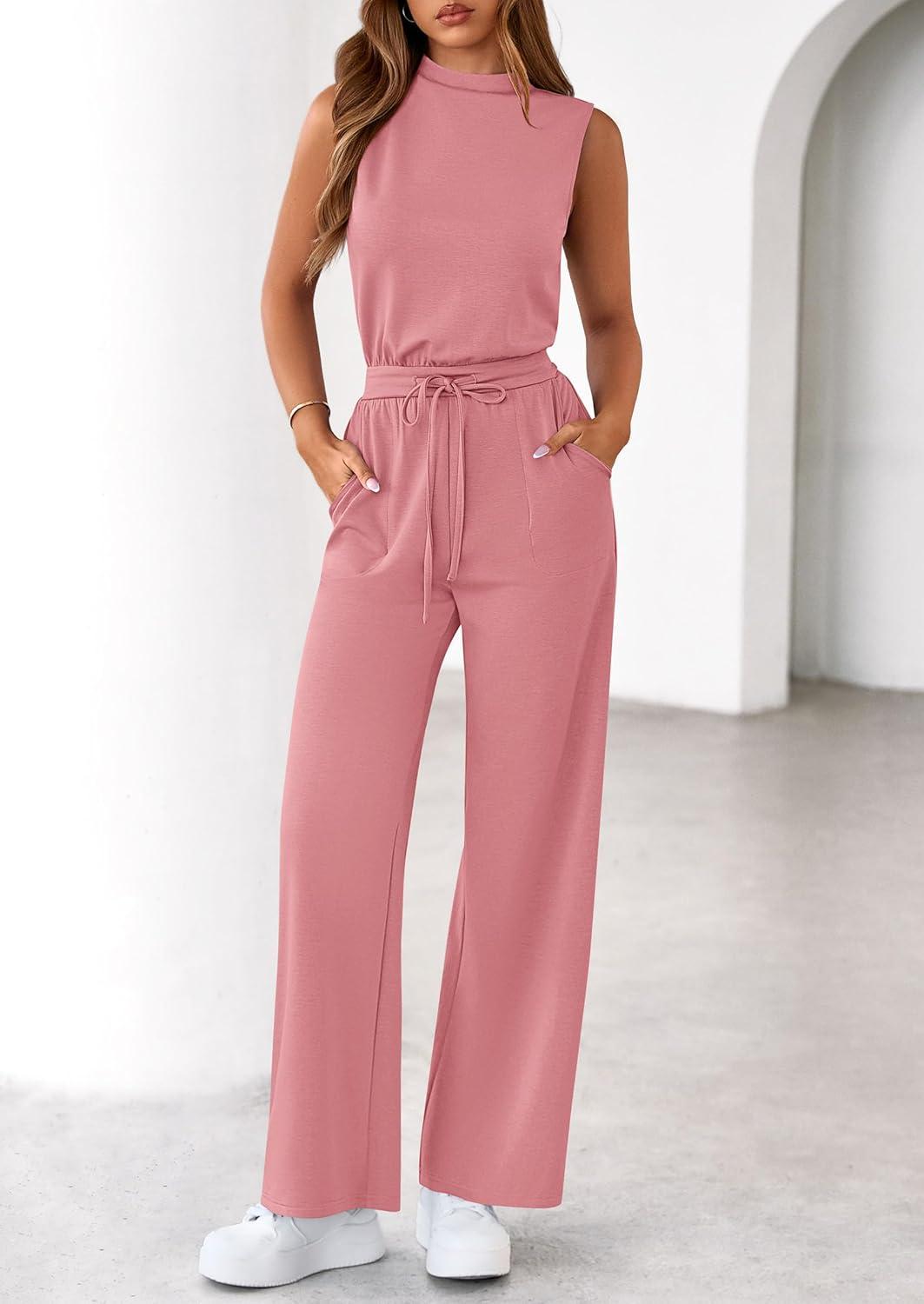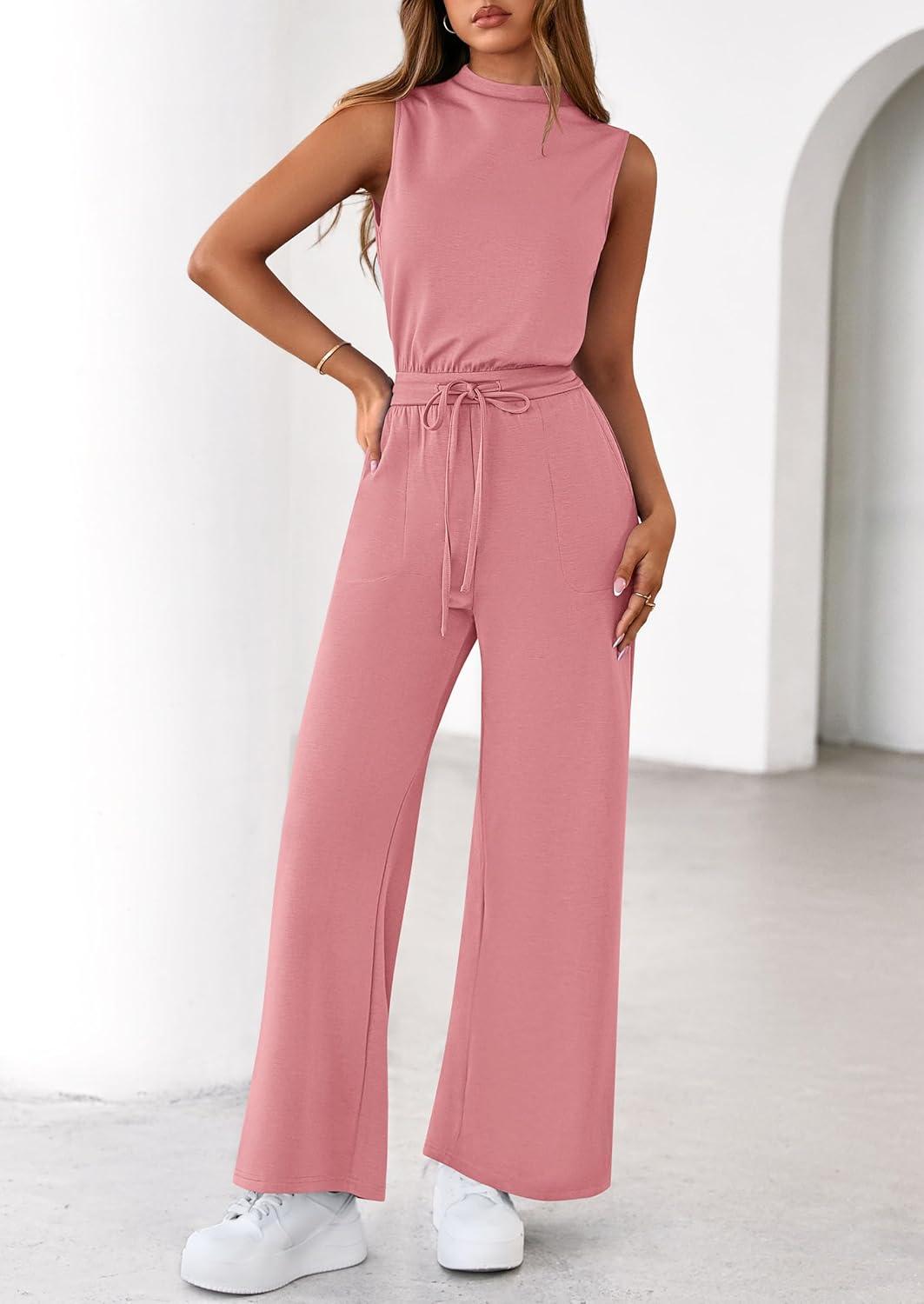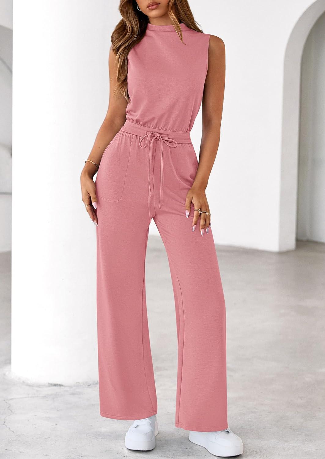 PRETTYGARDEN One Piece Jumpsuits for Women Dressy Summer Business Casual Outifts Sleeveless Mock Neck Wide Leg Rompers(Dusty Pink)
